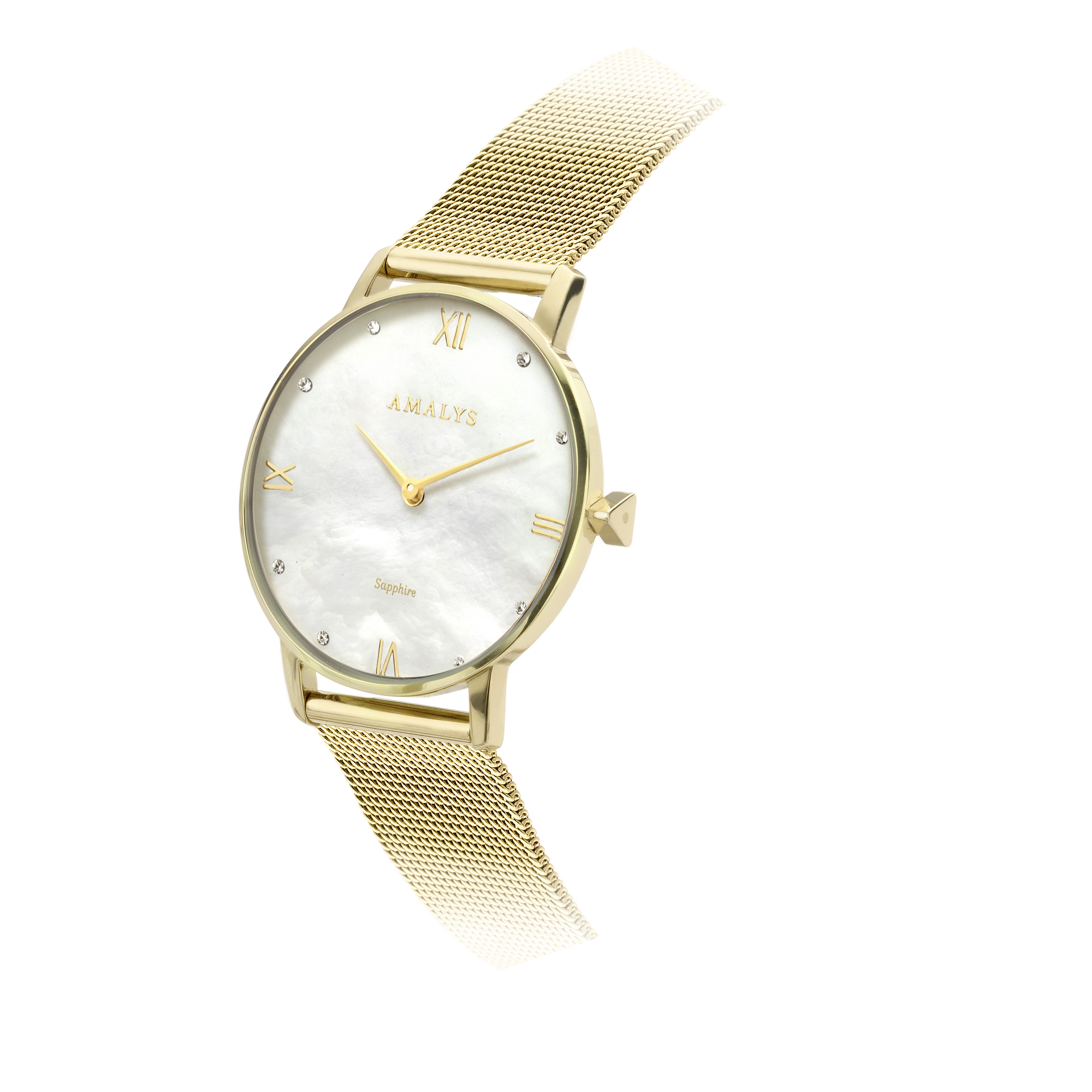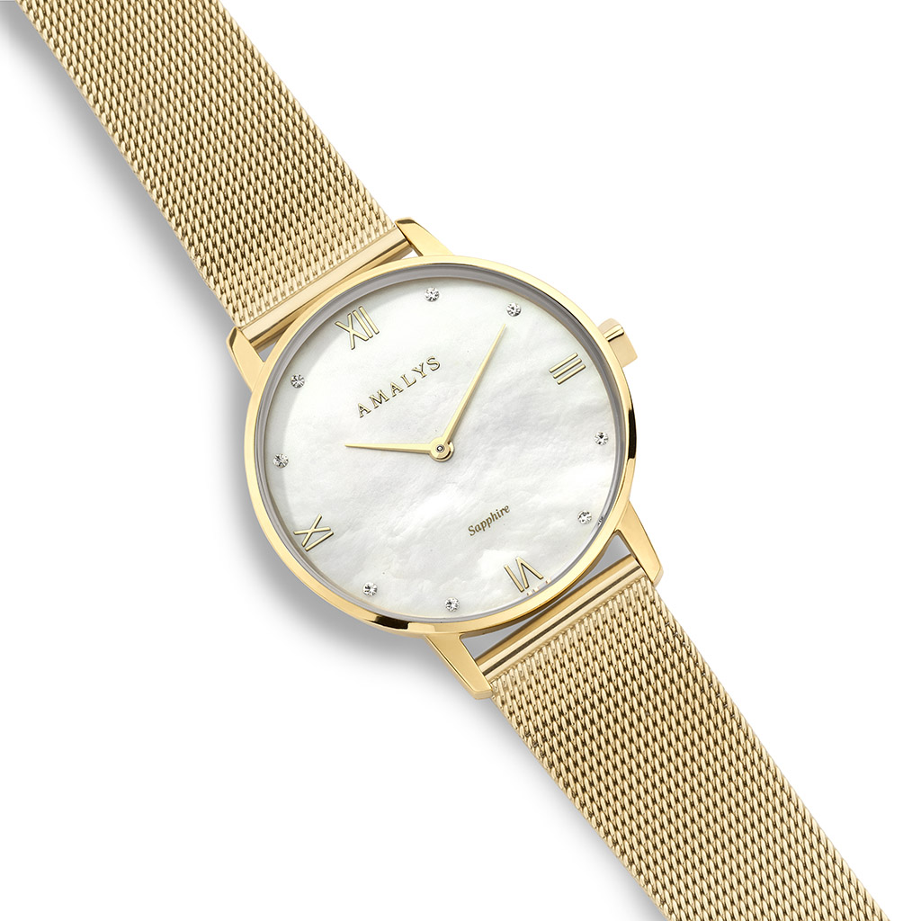 De Amalys Diana uit de Baker collectie is een verfijnd dameshorloge met een tijdloze en elegante uitstraling. De goudkleurige kast van 33 mm vormt een stijlvol geheel met de parelmoeren wijzerplaat, die subtiel speelt met licht en zorgt voor een luxe en vrouwelijke look. De combinatie van Romeinse cijfers en verfijnde details geeft het horloge een klassiek karakter met een moderne touch, terwijl de Milanese mesh band zorgt voor een comfortabele en elegante pasvorm. Het horloge is voorzien van krasbestendig saffierglas en een betrouwbaar Seiko quartz uurwerk, wat garant staat voor precisie en duurzaamheid. Met een waterdichtheid van 3 ATM is het horloge bestand tegen spatwater zoals regen en handen wassen. Met de Amalys Diana kies je voor een stijlvol en betekenisvol horloge, elke aankoop draagt bij aan de rechten van een vrouw.
