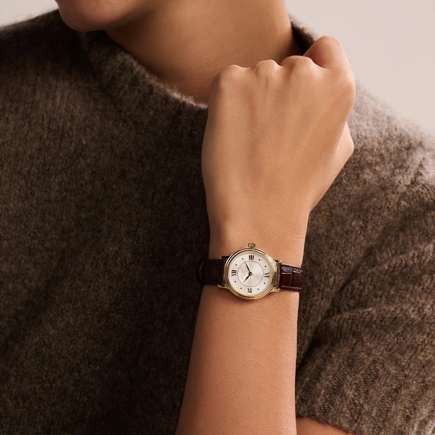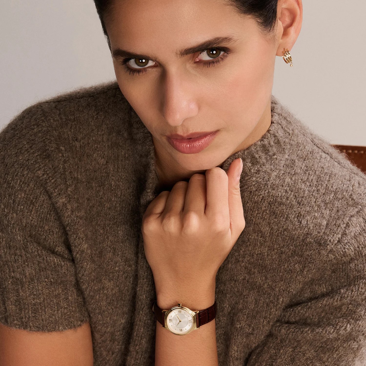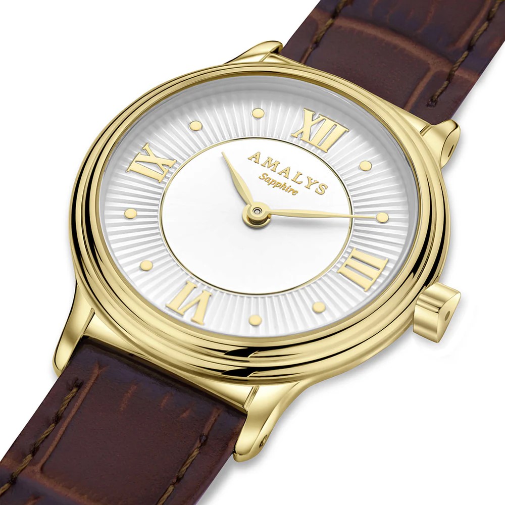 De Amalys Eugénie uit de Watson collectie combineert klassieke elegantie met een warme, verfijnde uitstraling. De ronde goudkleurige kast van 28 mm heeft zachte, harmonieuze lijnen en vormt een stijlvol geheel met de bruine band van Italiaans leer. De zilverkleurige wijzerplaat met subtiel guilloché-patroon zorgt voor een elegante lichtreflectie, terwijl de goudkleurige Romeinse indexen het klassieke karakter versterken. Het slanke ontwerp draagt comfortabel en maakt dit horloge perfect voor dagelijks gebruik. Het model is voorzien van saffierglas en een betrouwbaar Seiko quartz uurwerk voor langdurige precisie. Met een waterdichtheid van 5 ATM is het horloge bestand tegen spatwater. Let op: een leren band is gevoelig voor water, vermijd contact met vocht om de band zo mooi mogelijk te houden. Met Amalys kies je bovendien voor een horloge met betekenis, elke aankoop draagt bij aan de rechten van een vrouw.