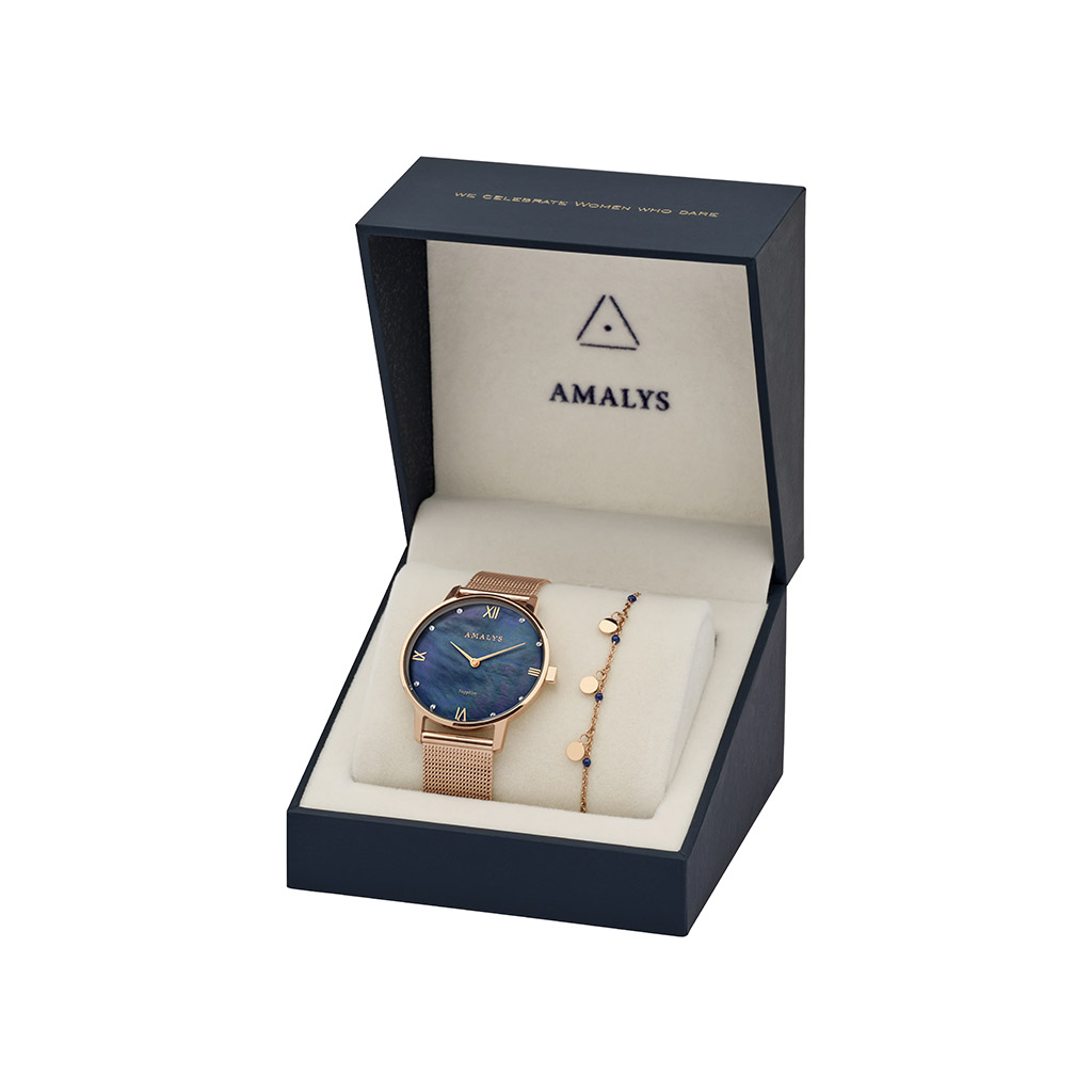 De Amalys Coffret Manon is een elegante giftset met een luxe en verfijnde uitstraling. Het roségoudkleurige dameshorloge van 33 mm combineert prachtig met de parelmoer blauwe wijzerplaat, die een subtiel spel van kleuren en licht laat zien. Glanzende indexen, Romeinse cijfers en verfijnde dauphine-wijzers geven het horloge een klassiek en stijlvol karakter. De Milanese mesh band zorgt voor een comfortabele en moderne pasvorm. De set wordt compleet gemaakt met een bijpassende sieradenarmband van roestvrij staal met een gouden PVD-coating, wat zorgt voor een luxe en duurzame afwerking. Het horloge is voorzien van ultra-sterk saffierglas en een betrouwbaar Seiko quartz uurwerk voor precisie en langdurige kwaliteit. Met een waterdichtheid van 3 ATM is het horloge bestand tegen spatwater. Met Amalys kies je bovendien voor een horloge met betekenis, elke aankoop draagt bij aan de rechten van een vrouw.