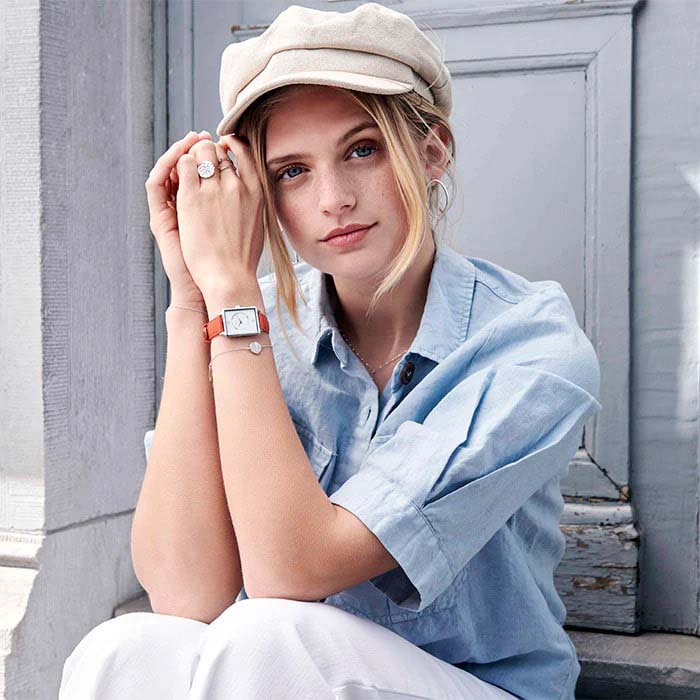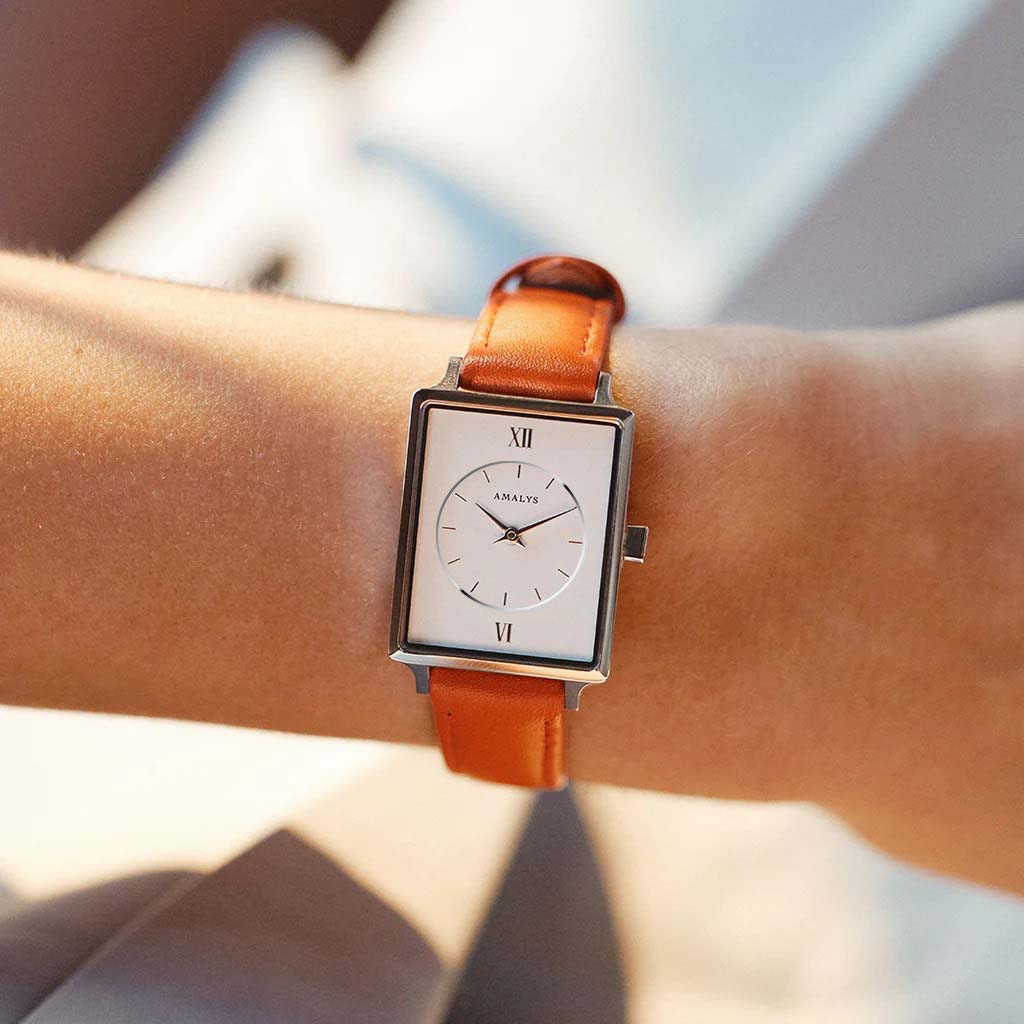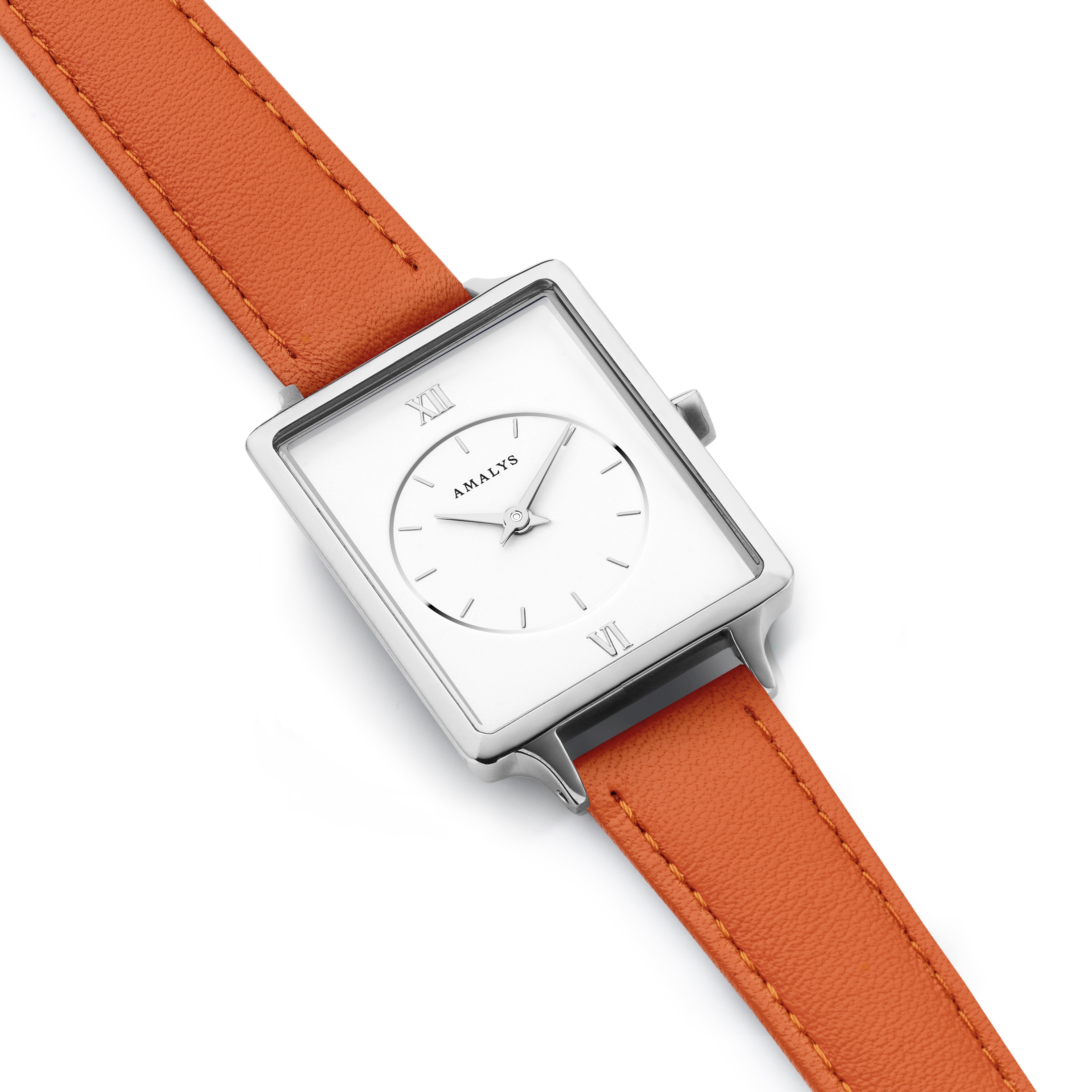De Amalys Lou uit de Hepburn collectie straalt verfijnde elegantie uit met een frisse en moderne uitstraling. De rechthoekige zilverkleurige kast van 23 x 28 mm vormt een stijlvol geheel met de strakke witte wijzerplaat, wat zorgt voor een lichte en minimalistische look. De slanke vorm en subtiele details geven het horloge een tijdloos en vrouwelijk karakter. De oranje band van Italiaans leer voegt een warme en eigentijdse touch toe en draagt comfortabel om de pols. Het horloge is voorzien van krasbestendig saffierglas en een betrouwbaar Seiko quartz uurwerk, wat zorgt voor precisie en duurzaamheid. Met een waterdichtheid van 3 ATM is het horloge bestand tegen spatwater. Met Amalys kies je bovendien voor een horloge met betekenis, elke aankoop draagt bij aan de rechten van een vrouw. Let op, een leren band is gevoeliger voor slijtage door water en intensief gebruik.