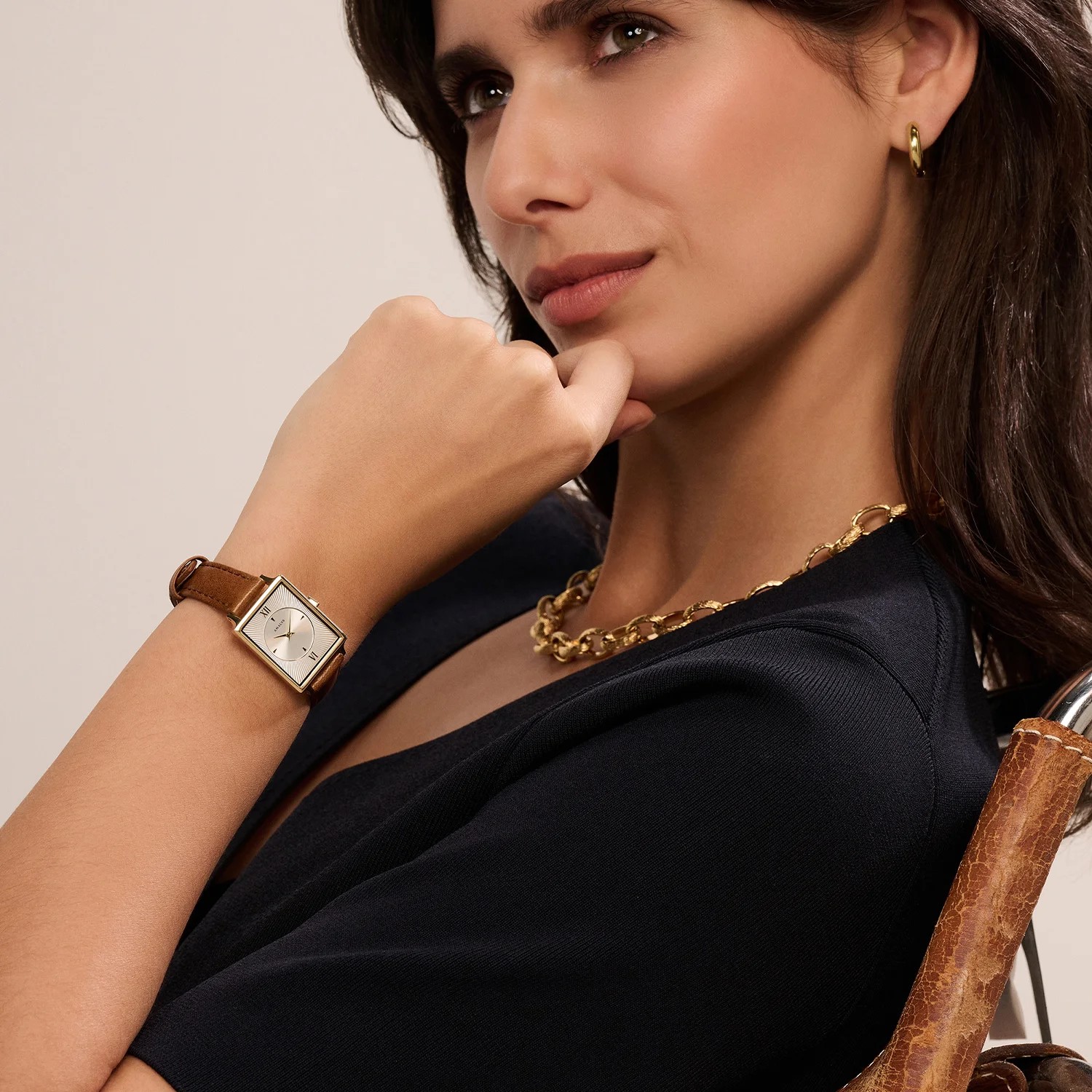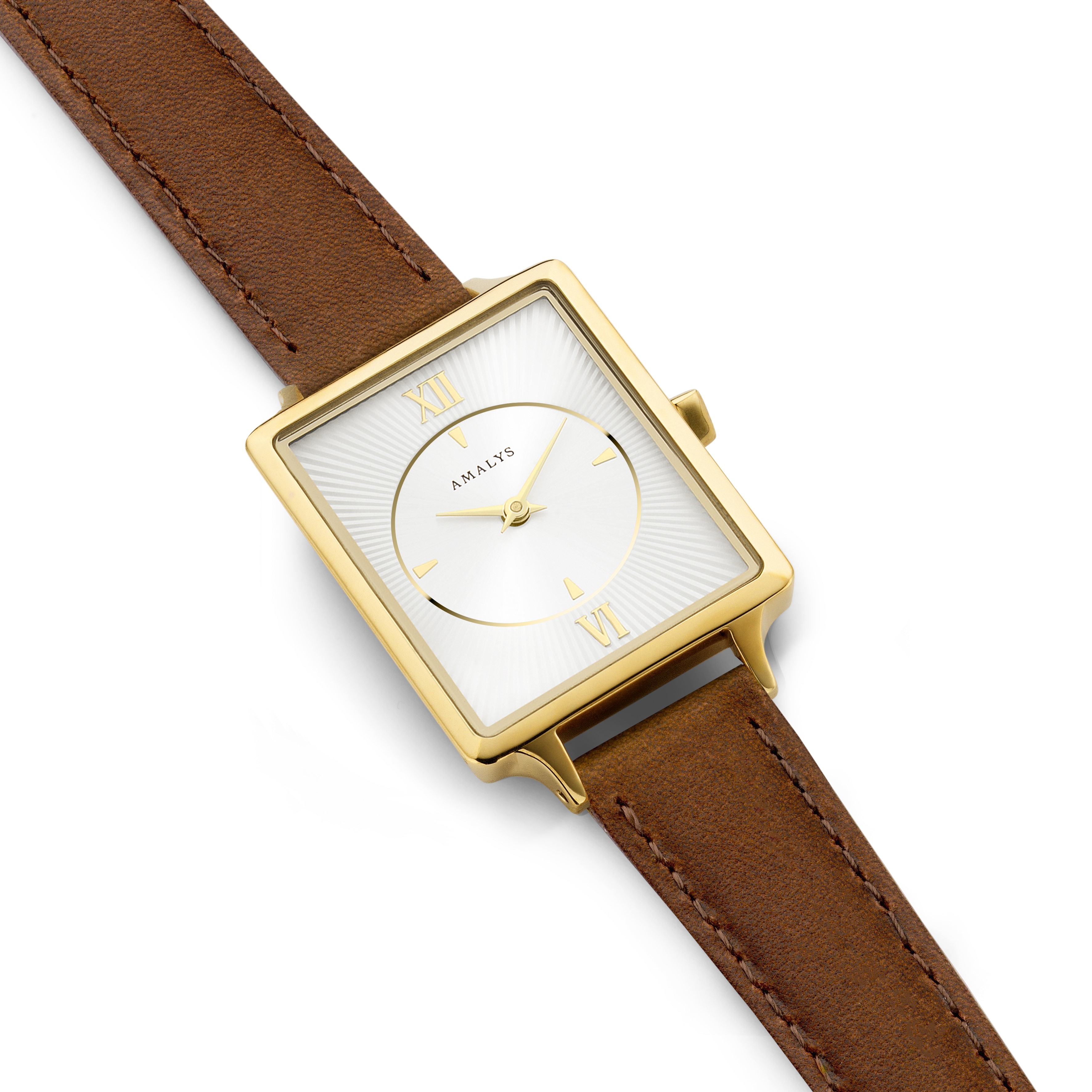 De Amalys Mathilda uit de Hepburn collectie combineert klassieke elegantie met een warm en karaktervol design. De rechthoekige goudkleurige kast van 23 x 28 mm vormt een stijlvol geheel met de zilverkleurige wijzerplaat met subtiel guilloché-patroon, die het licht verfijnd weerkaatst en zorgt voor een luxe uitstraling. Romeinse accenten geven het horloge een tijdloos en evenwichtig karakter. De bruine band van Italiaans leer voegt een warme en natuurlijke touch toe en draagt comfortabel om de pols, perfect voor dagelijks gebruik. Het horloge is voorzien van krasbestendig saffierglas en een betrouwbaar Seiko quartz uurwerk, wat zorgt voor precisie en duurzaamheid. Met een waterdichtheid van 3 ATM is het horloge bestand tegen spatwater. Met Amalys kies je bovendien voor een horloge met betekenis, elke aankoop draagt bij aan de rechten van een vrouw. Let op, een leren band is gevoeliger voor slijtage door water en intensief gebruik.