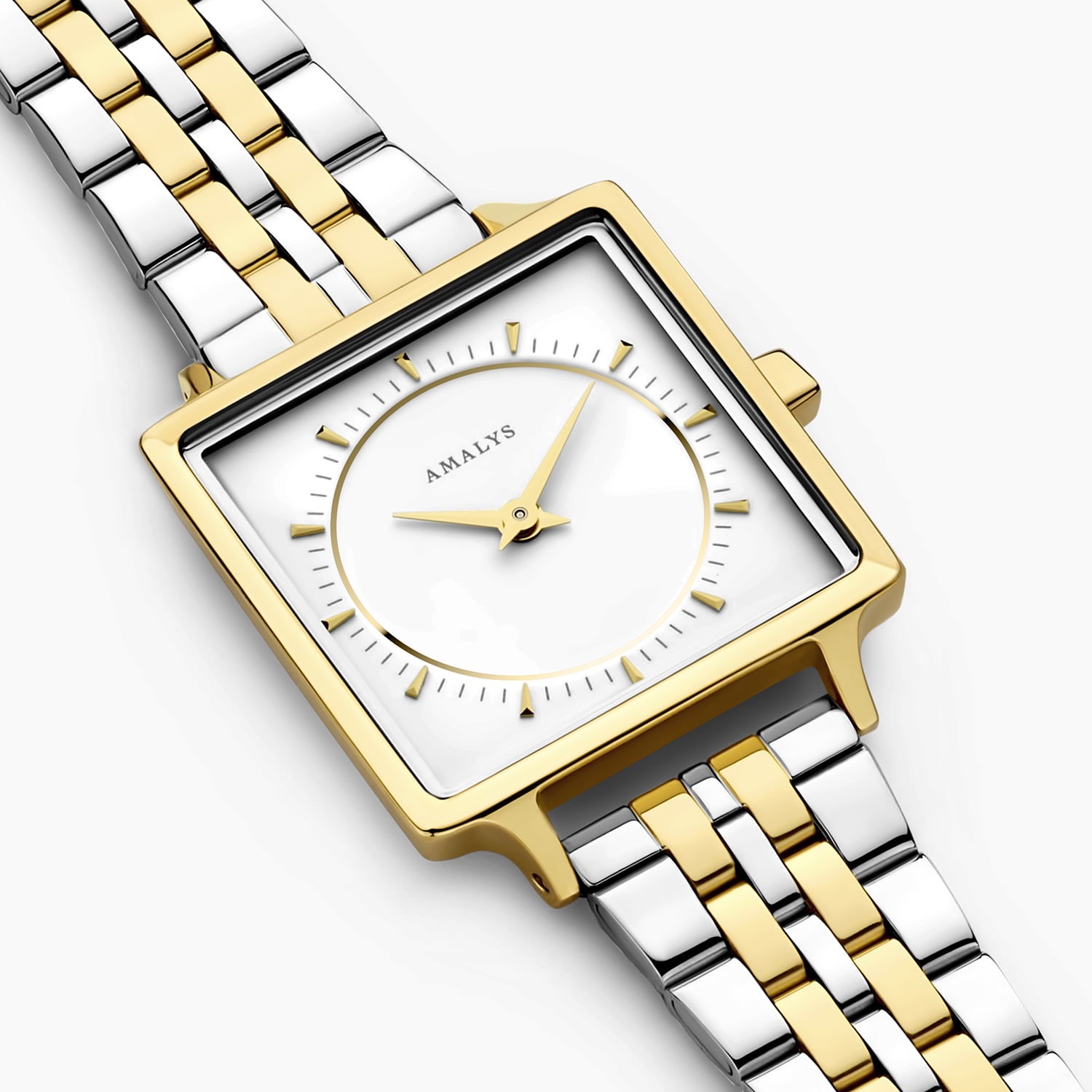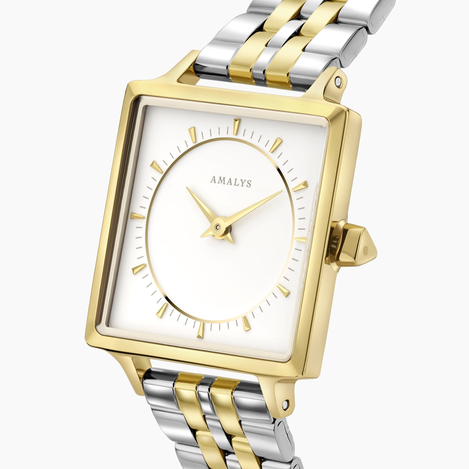 Elegant, modern en verfijnd, de Amalys Melody uit de Parks collectie is een dameshorloge dat moeiteloos stijl en eenvoud combineert. De vierkante goudkleurige kast van 25 x 25 mm geeft het horloge een strak en eigentijds karakter, terwijl de sneeuwwitte wijzerplaat zorgt voor een heldere en rustige uitstraling. Fijne goudkleurige details zorgen voor een subtiel luxe accent en een perfecte balans in het ontwerp. De tweekleurige stalen schakelband voegt een moderne touch toe en maakt het horloge eenvoudig te combineren met zowel goud- als zilverkleurige sieraden. Het horloge is voorzien van krasbestendig saffierglas en een betrouwbaar Seiko quartz uurwerk, wat zorgt voor precisie en duurzaamheid. Met een waterdichtheid van 3 ATM is het horloge bestand tegen spatwater. Met Amalys kies je bovendien voor een horloge met betekenis, elke aankoop draagt bij aan de rechten van een vrouw.