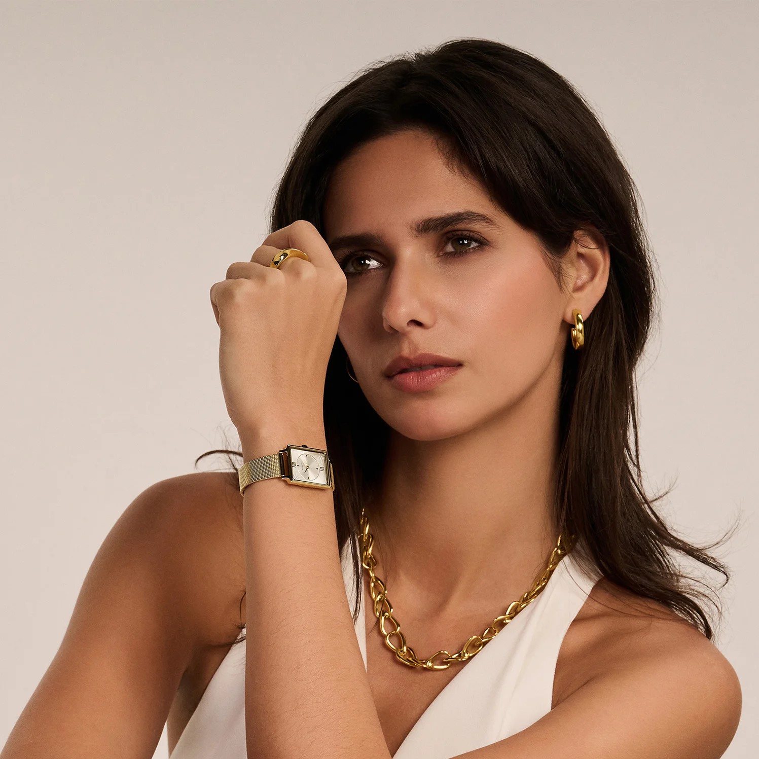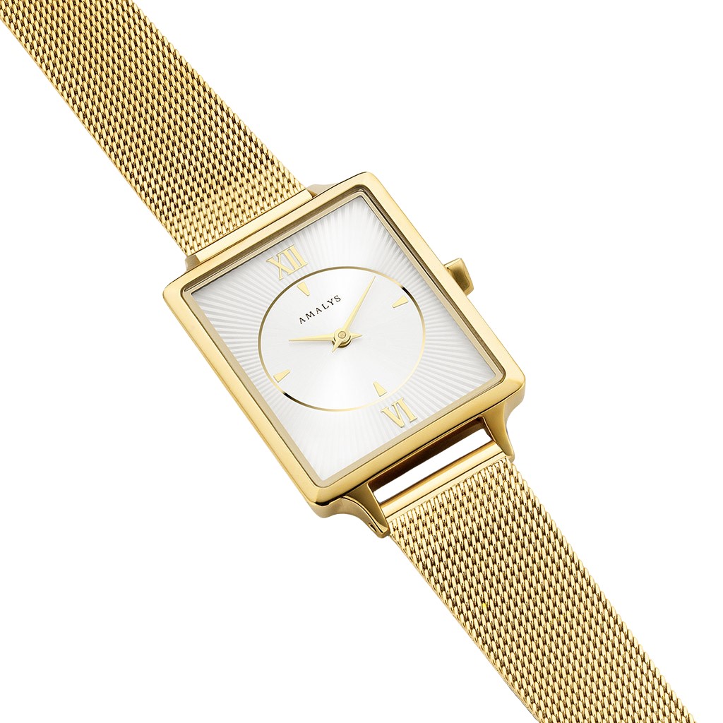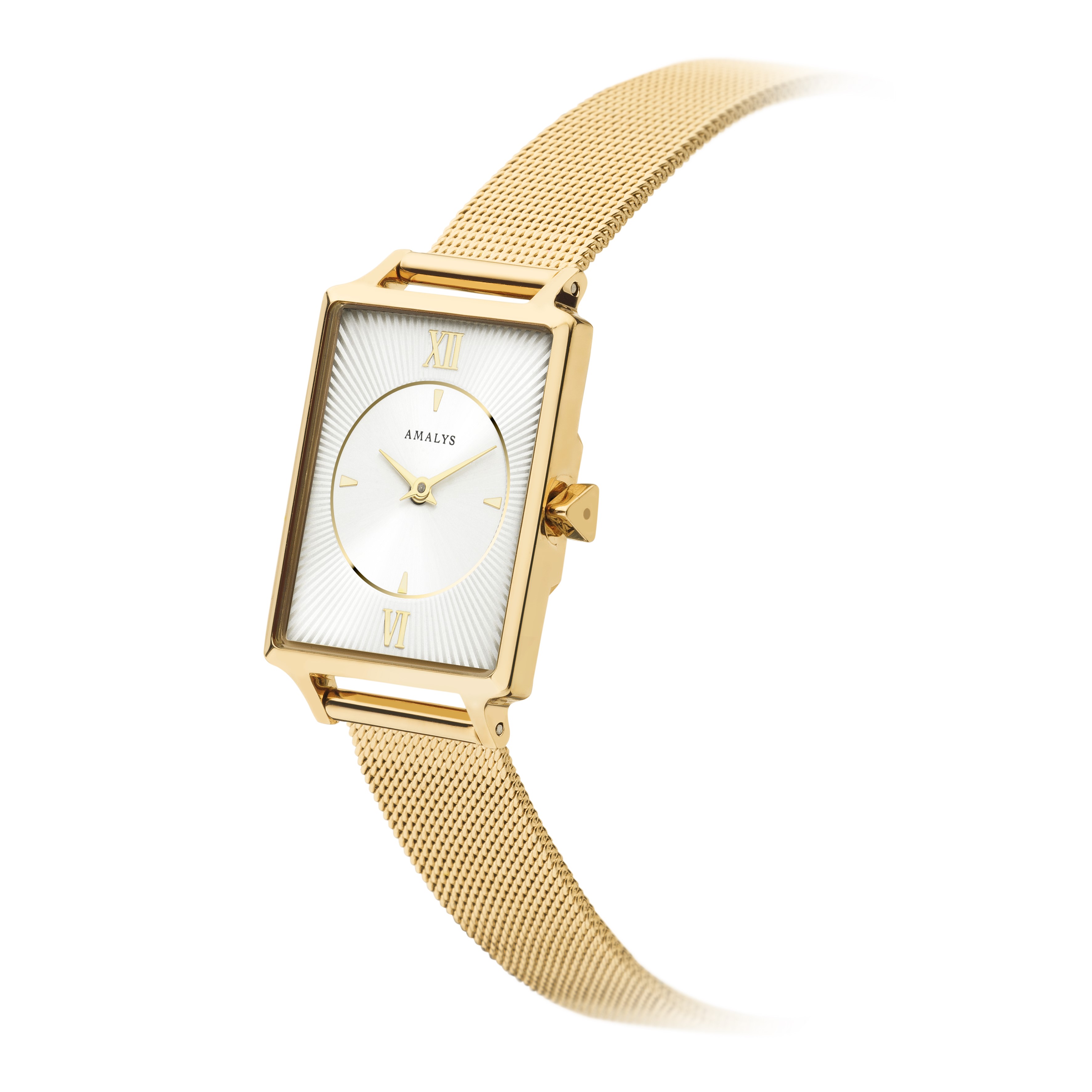 De Amalys Selena uit de Hepburn collectie straalt verfijnde elegantie uit met een licht en harmonieus design. De rechthoekige goudkleurige kast van 23 x 28 mm vormt één geheel met de Milanese mesh band en zorgt voor een vloeiende en stijlvolle uitstraling. De zilverkleurige wijzerplaat met stralend guilloché-patroon vangt het licht op subtiele wijze en geeft het horloge een luxe en vrouwelijke look. Romeinse accenten zorgen voor een klassiek en evenwichtig karakter. De Milanese mesh band is soepel, verstelbaar en draagt comfortabel om de pols. Het horloge is voorzien van krasbestendig saffierglas en een betrouwbaar Seiko quartz uurwerk, wat garant staat voor precisie en duurzaamheid. Met een waterdichtheid van 3 ATM is het horloge bestand tegen spatwater. Met Amalys kies je bovendien voor een horloge met betekenis, elke aankoop draagt bij aan de rechten van een vrouw.