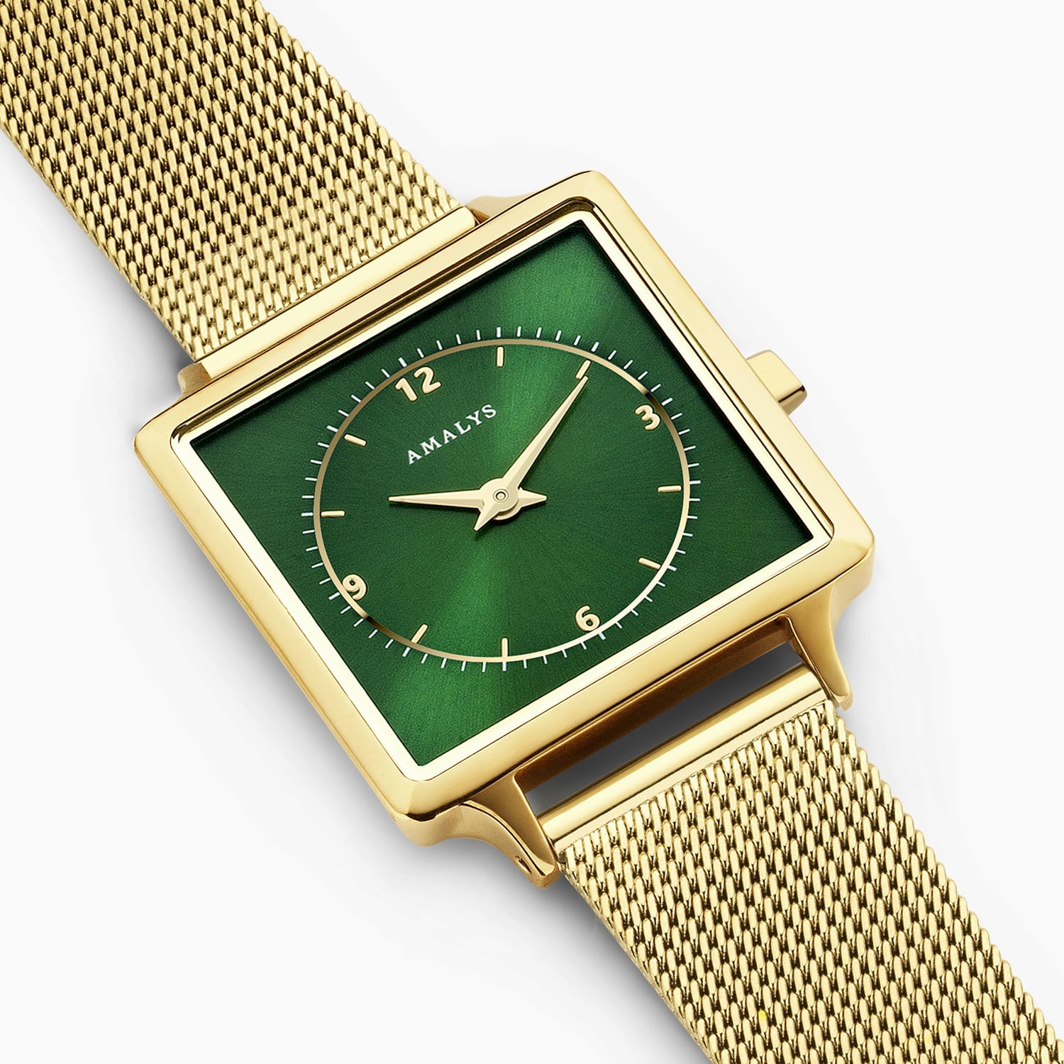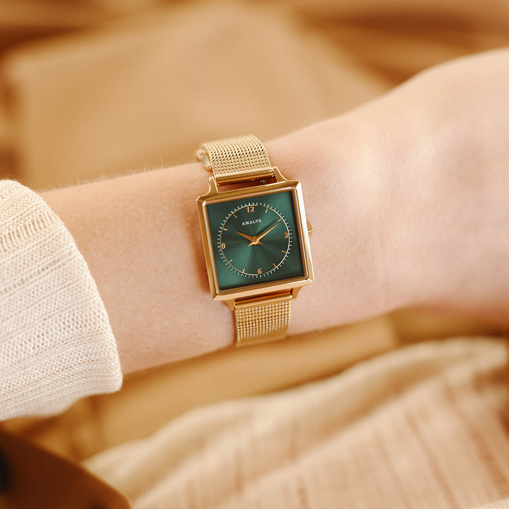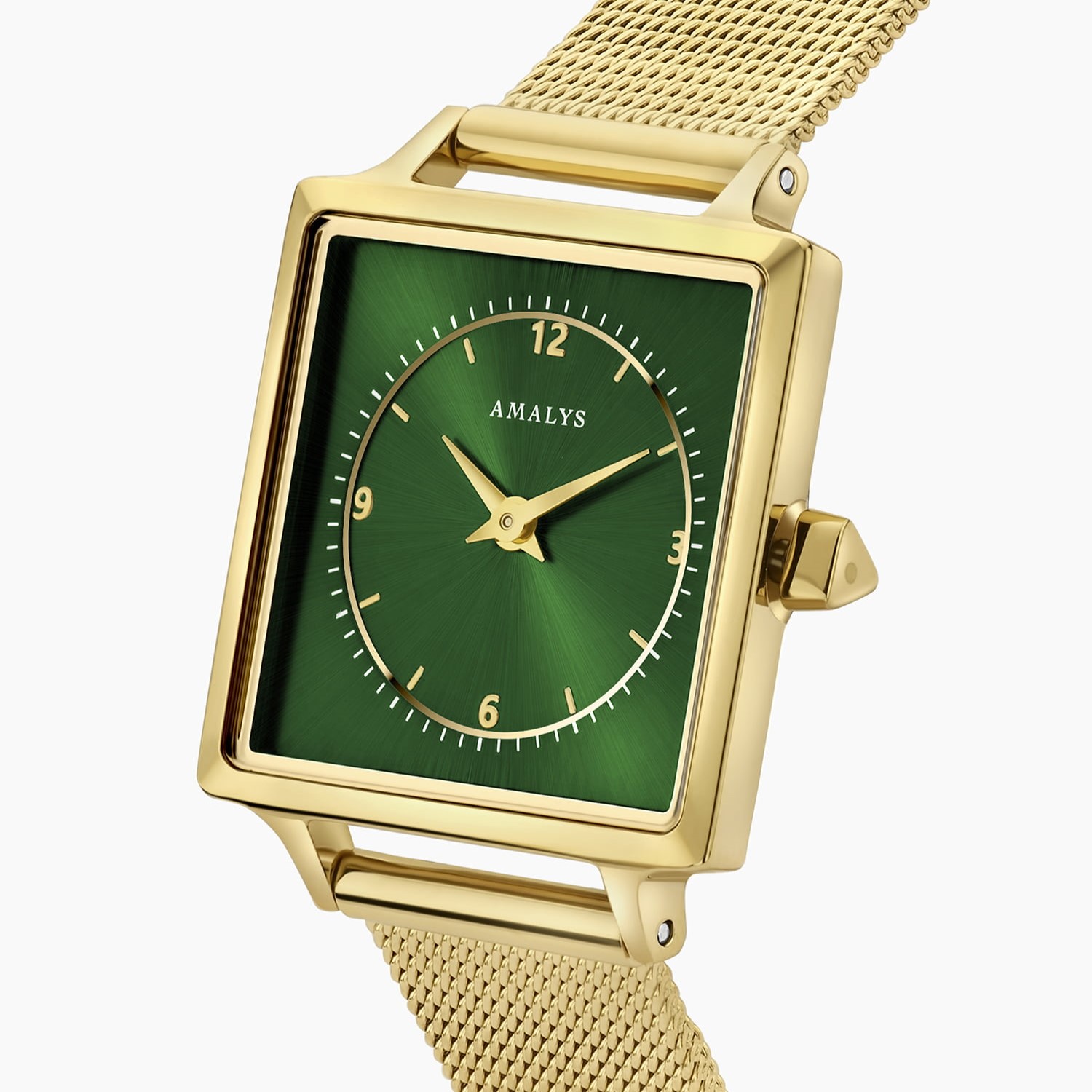 De Amalys Suzette uit de Parks collectie valt direct op door zijn diepe groene wijzerplaat met zonnestraalpatroon, die het licht prachtig vangt en telkens een andere nuance laat zien. In combinatie met de vierkante goudkleurige kast van 25 x 25 mm ontstaat een krachtig en elegant geheel met een moderne uitstraling. De strakke lijnen en subtiele details geven het horloge een verfijnd en eigentijds karakter. De goudkleurige Milanese mesh band zorgt voor een soepele en comfortabele pasvorm en maakt het horloge geschikt voor dagelijks gebruik. Het model is voorzien van krasbestendig saffierglas en een betrouwbaar Seiko quartz uurwerk, wat zorgt voor precisie en duurzaamheid. Met een waterdichtheid van 3 ATM is het horloge bestand tegen spatwater. Met Amalys kies je bovendien voor een horloge met betekenis, elke aankoop draagt bij aan de rechten van een vrouw.