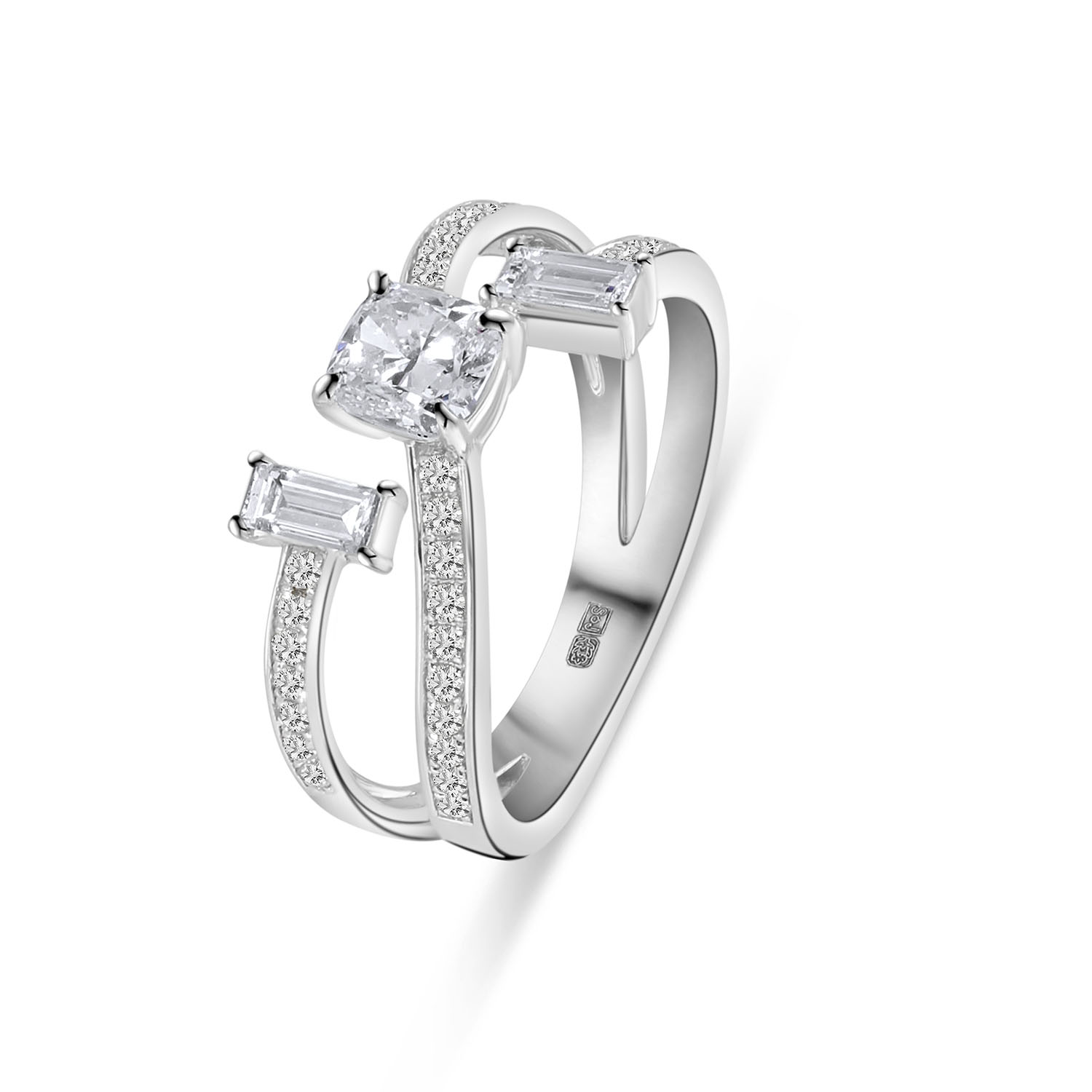 Witgouden Ring met Cushiongeslepen Lab Grown Diamant en Trilliantgeslepen Zijstenen – R480-MLN-0549-