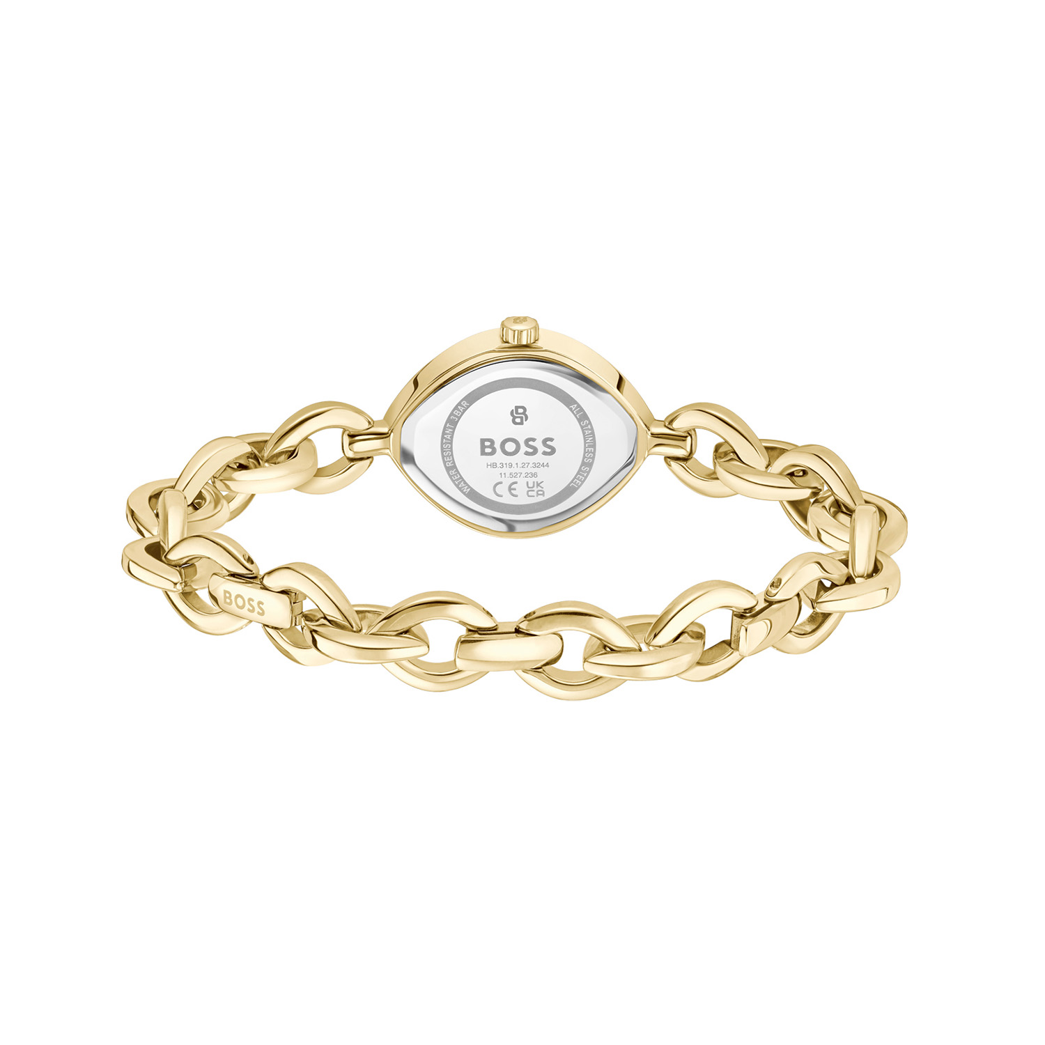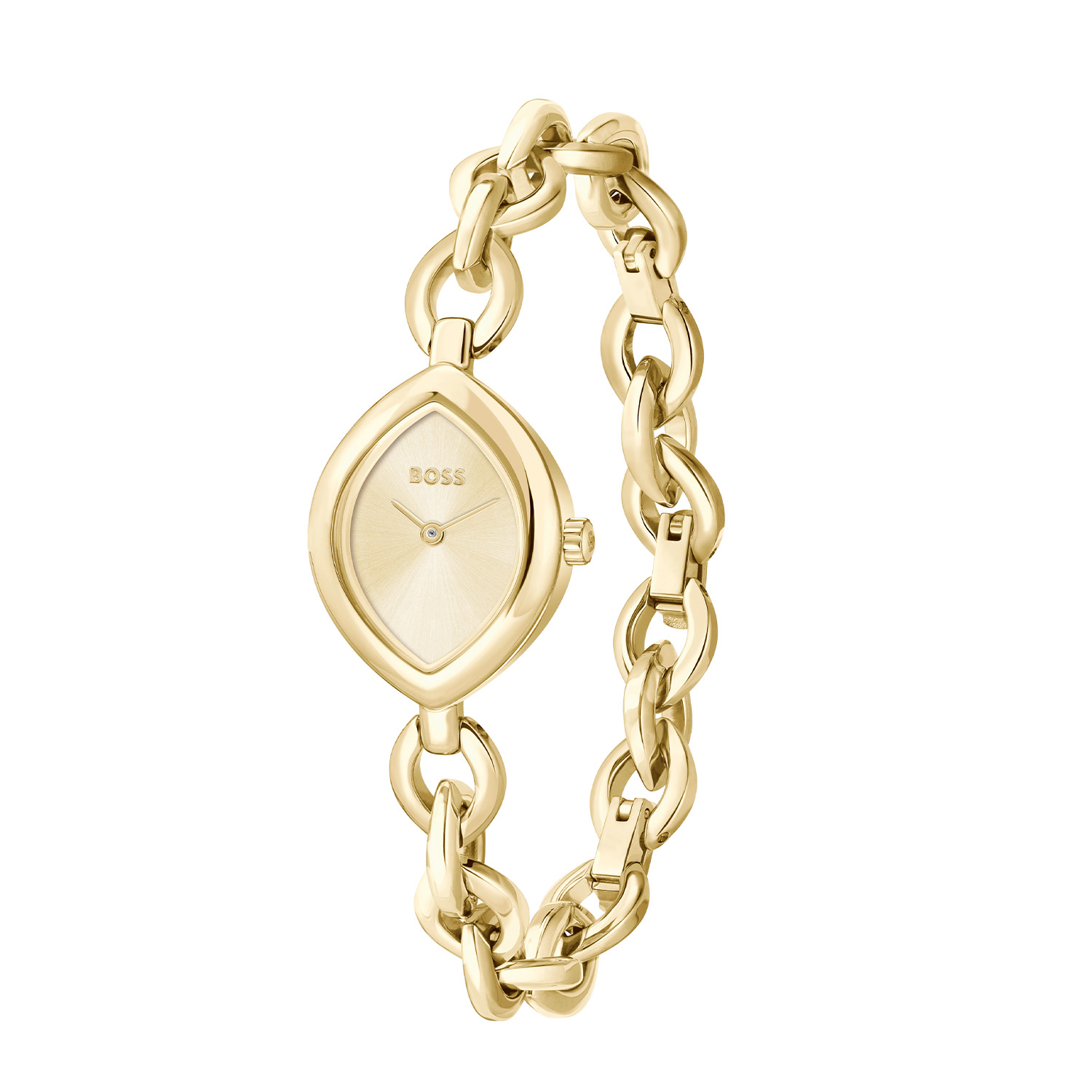 De BOSS FIORA is een elegant dameshorloge met een verfijnde en sierlijke uitstraling. De ovale goudkleurige stalen kast van 29 mm geeft het horloge een zachte en vrouwelijke vorm, terwijl de champagnekleurige sunray wijzerplaat zorgt voor een warme en luxe glans. De minimalistische wijzers en het subtiele ontwerp laten het horloge bijna als een sieraad ogen. De wijzerplaat wordt beschermd door mineraalglas, dat bekend staat om zijn helderheid en duurzaamheid. Binnenin werkt een nauwkeurig quartz uurwerk, dat zorgt voor een betrouwbare tijdsaanduiding. De goudkleurige stalen band met ovale open schakels geeft het horloge een opvallend en elegant karakter en sluit comfortabel met een druksluiting. Met een waterbestendigheid van 3 ATM is het horloge geschikt voor dagelijks gebruik en bestand tegen spatwater.