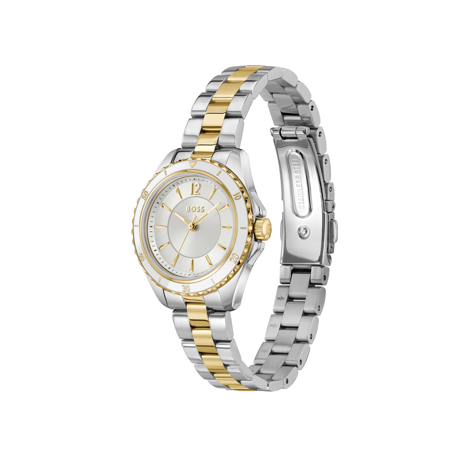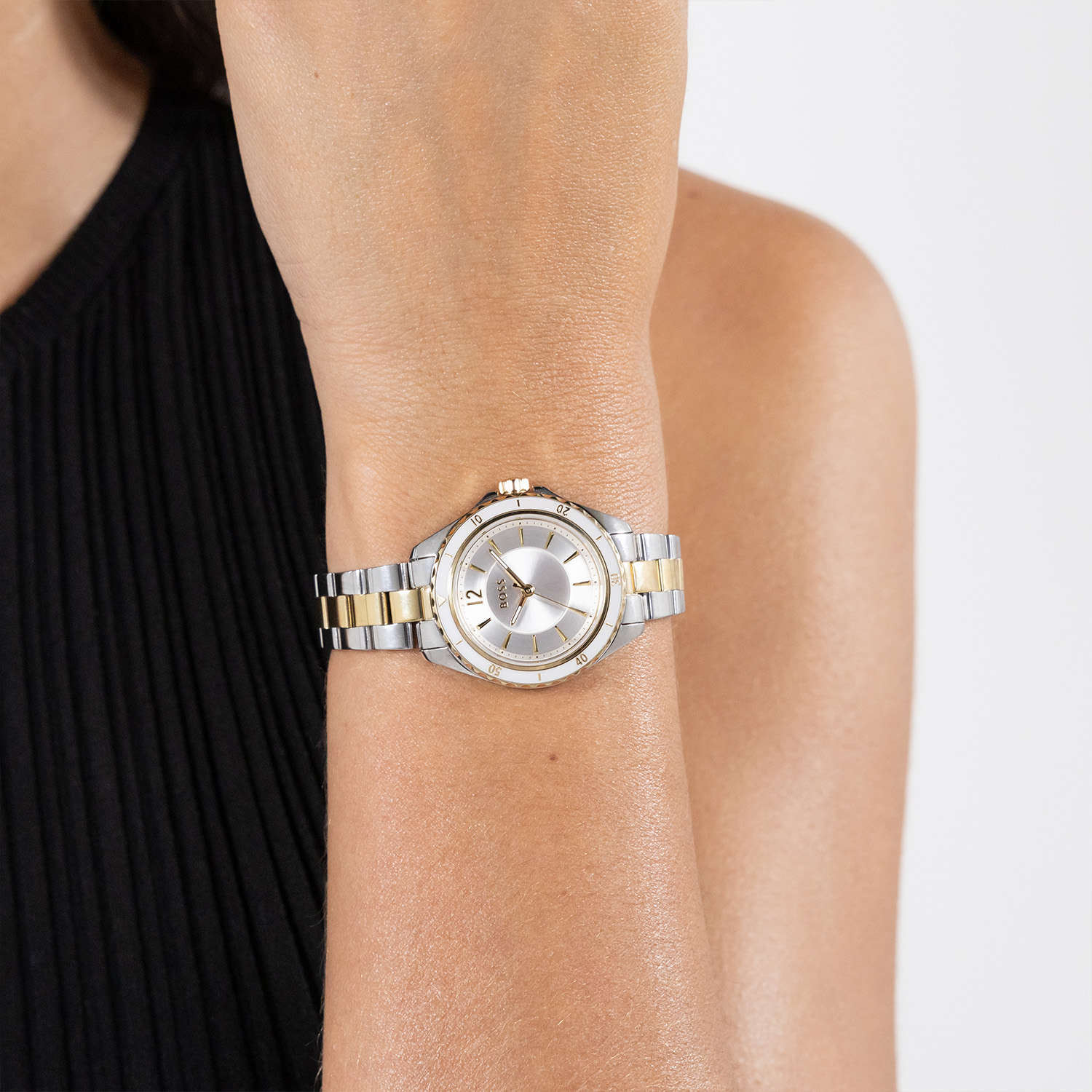De BOSS SAGE AQUA is een modern dameshorloge dat sportieve details combineert met een elegante uitstraling. De stalen kast van 30 mm geeft het horloge een stijlvolle en evenwichtige vorm, terwijl de zilverwitte sunray wijzerplaat zorgt voor een frisse en verfijnde uitstraling. De subtiel bewerkte bezel rondom de kast geeft het ontwerp een extra karakter en een luxe afwerking. De wijzerplaat wordt beschermd door mineraalglas, dat bekendstaat om zijn helderheid en duurzaamheid. Binnenin werkt een nauwkeurig quartz uurwerk, dat zorgt voor een betrouwbare tijdsaanduiding. De bicolor stalen schakelband sluit mooi aan op de kast en draagt comfortabel dankzij de stevige vouwsluiting. Met een waterbestendigheid van 3 ATM is het horloge geschikt voor dagelijks gebruik en bestand tegen spatwater.