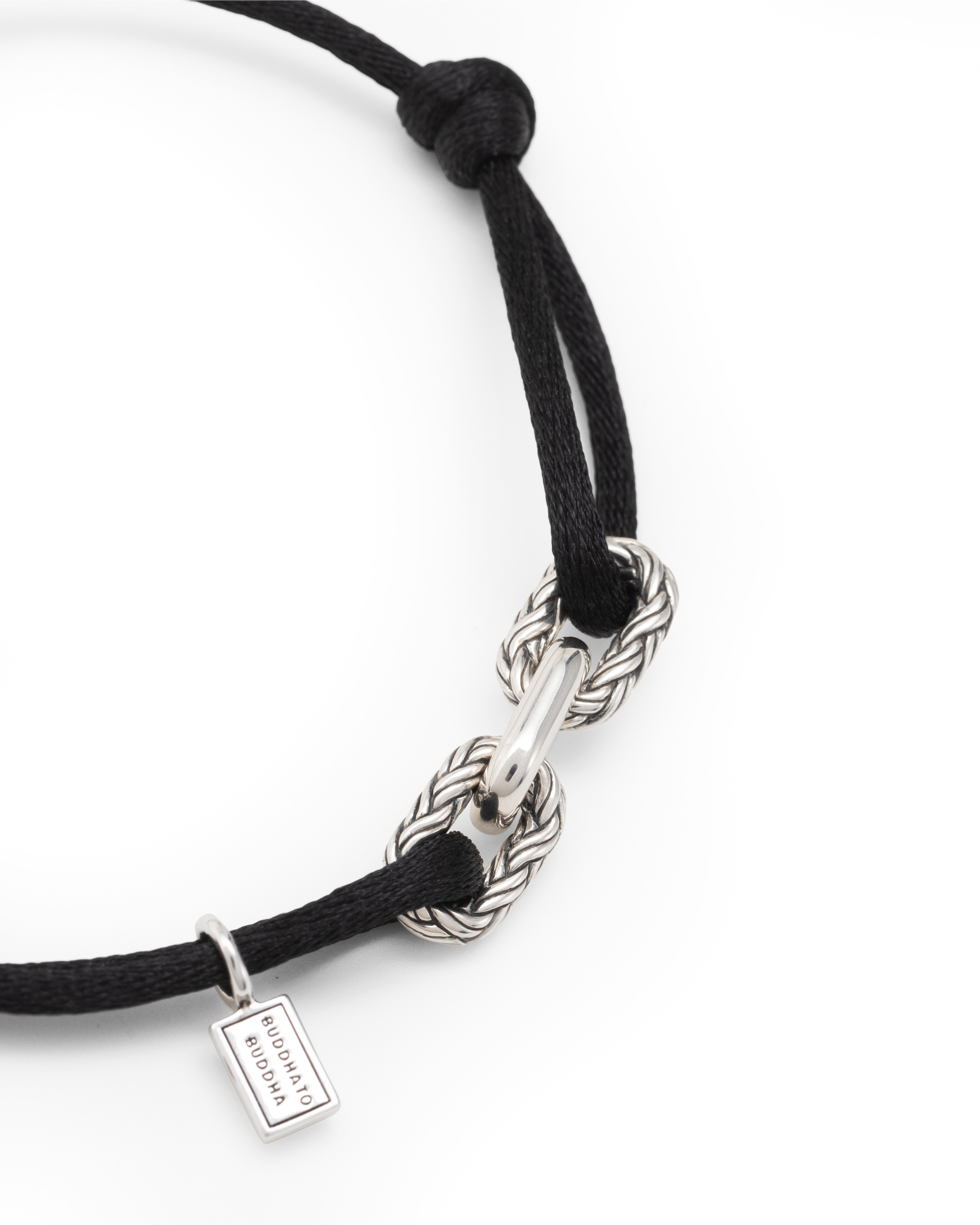 Deze stijlvolle zwarte koordarmband van Buddha to Buddha is een unieke toevoeging aan jouw eigen armbanden collectie. De armband is vervaardigd uit 925 sterling zilver en 100% slijtvast polyester. De kwaliteit van het koord is OEKO TEX gecertificeerd, wat betekent dat het geen schadelijke stoffen bevat. Door de constructie van het koord, past deze armband om iedere pols. Het detail in het midden van de armband is voorzien van de populaire Katja schakel.