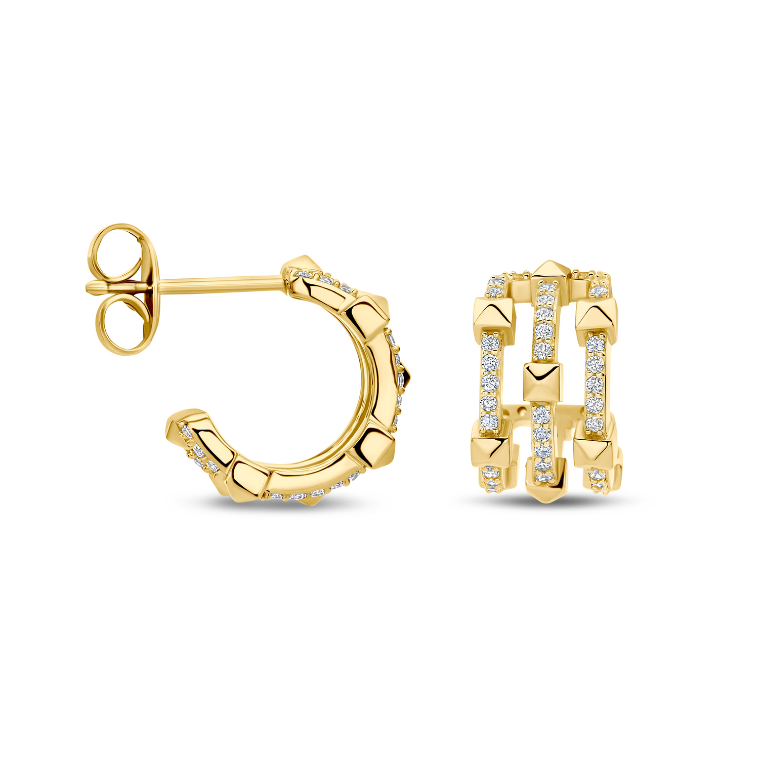 Deze FJF Jewellery Ring of Six oorbellen zijn vervaardigd van verantwoord verkregen 925 sterling zilver en afgewerkt met een hoogwaardige geelgoud vergulde laag. Het bijzondere ontwerp bestaat uit zes piramidevormige elementen die samen een krachtige en moderne ring vormen. De rijen zijn verfijnd bezet met sprankelende zirkonia, wat zorgt voor een luxe glans en een elegant spel van licht. Dankzij het expressieve maar uitgebalanceerde design zijn deze oorbellen echte statement pieces die zowel overdag als ’s avonds gedragen kunnen worden. De hoogwaardige afwerking en anti-allergene eigenschappen zorgen voor optimaal draagcomfort. Deze oorbellen zijn perfect te combineren met andere sieraden uit de Ring of Six-serie.