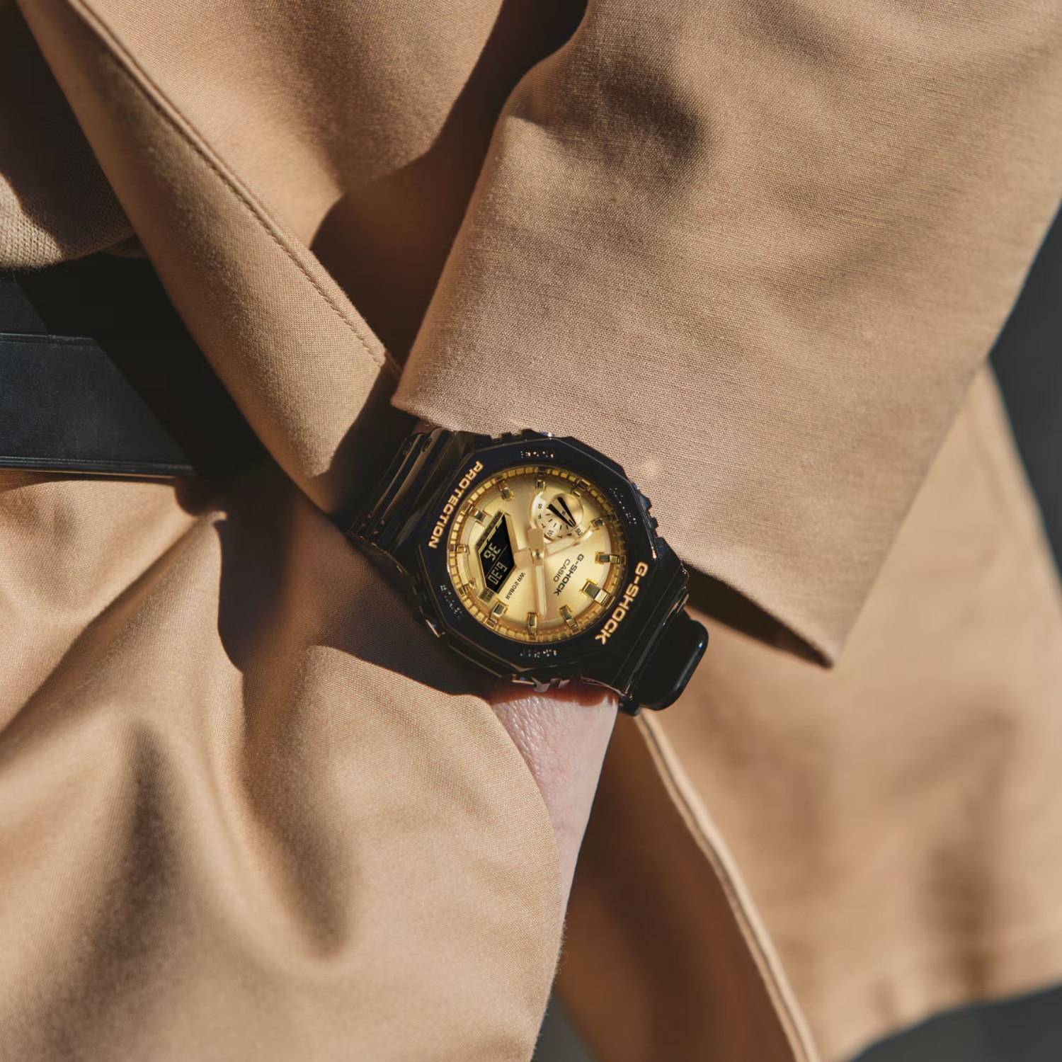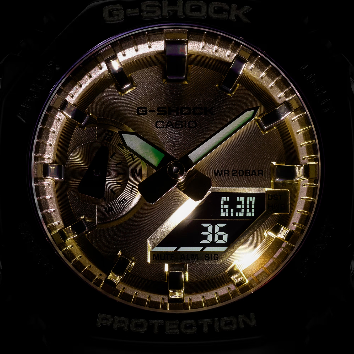 Dit G-Shock horloge uit de CLASSIC GA-2100 serie combineert een stoere uitstraling met verfijnde goudkleurige accenten voor een opvallend contrast. De zwarte kast en hars band vormen een krachtige basis, terwijl de goudkleurige wijzerplaat het horloge een luxe en moderne uitstraling geeft. De kast heeft een afmeting van 48,5 (L) × 45,4 (B) mm en is opgebouwd uit koolstof en hars met een Carbon Core Guard-structuur voor extra stevigheid en schokbestendigheid. Het mineraalglas beschermt tegen krassen en stoten, waardoor het horloge geschikt is voor intensief dagelijks gebruik. Met een waterdichtheid van 20 ATM (Watersport) is dit model geschikt voor zwemmen en andere wateractiviteiten. De analoog-digitale weergave biedt een overzichtelijke tijdsaanduiding en praktische functies zoals wereldtijd, stopwatch, afteltimer en vijf dagelijkse alarmen. Dankzij de dubbele LED-verlichting blijven zowel wijzerplaat als display goed zichtbaar in het donker.