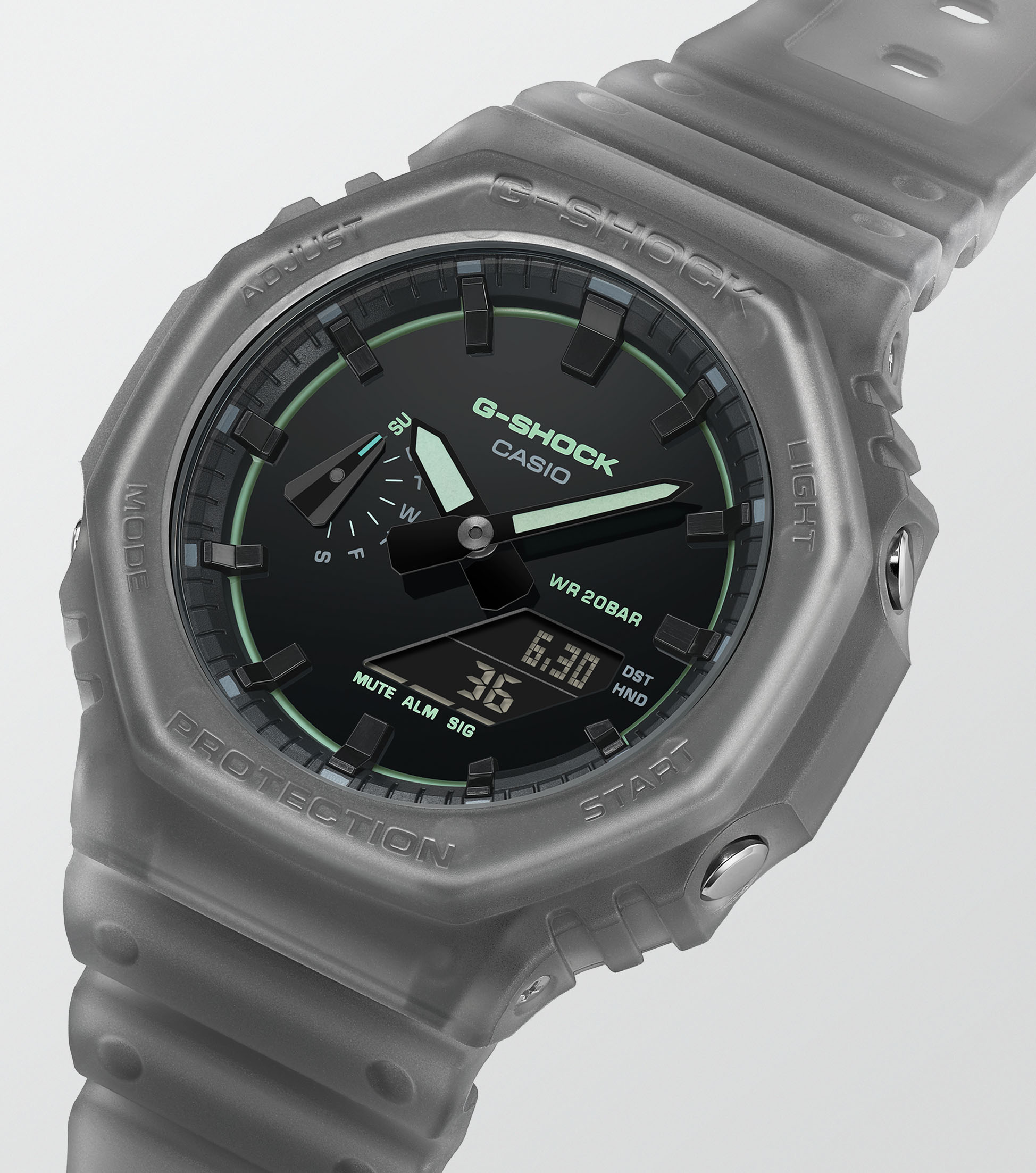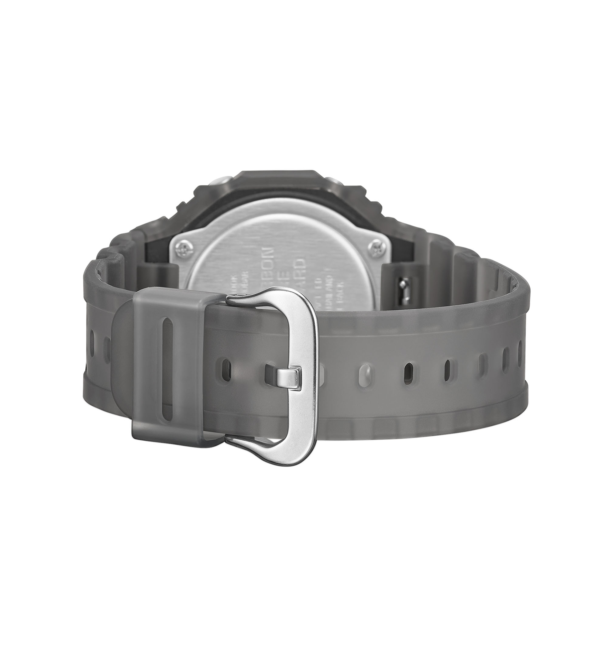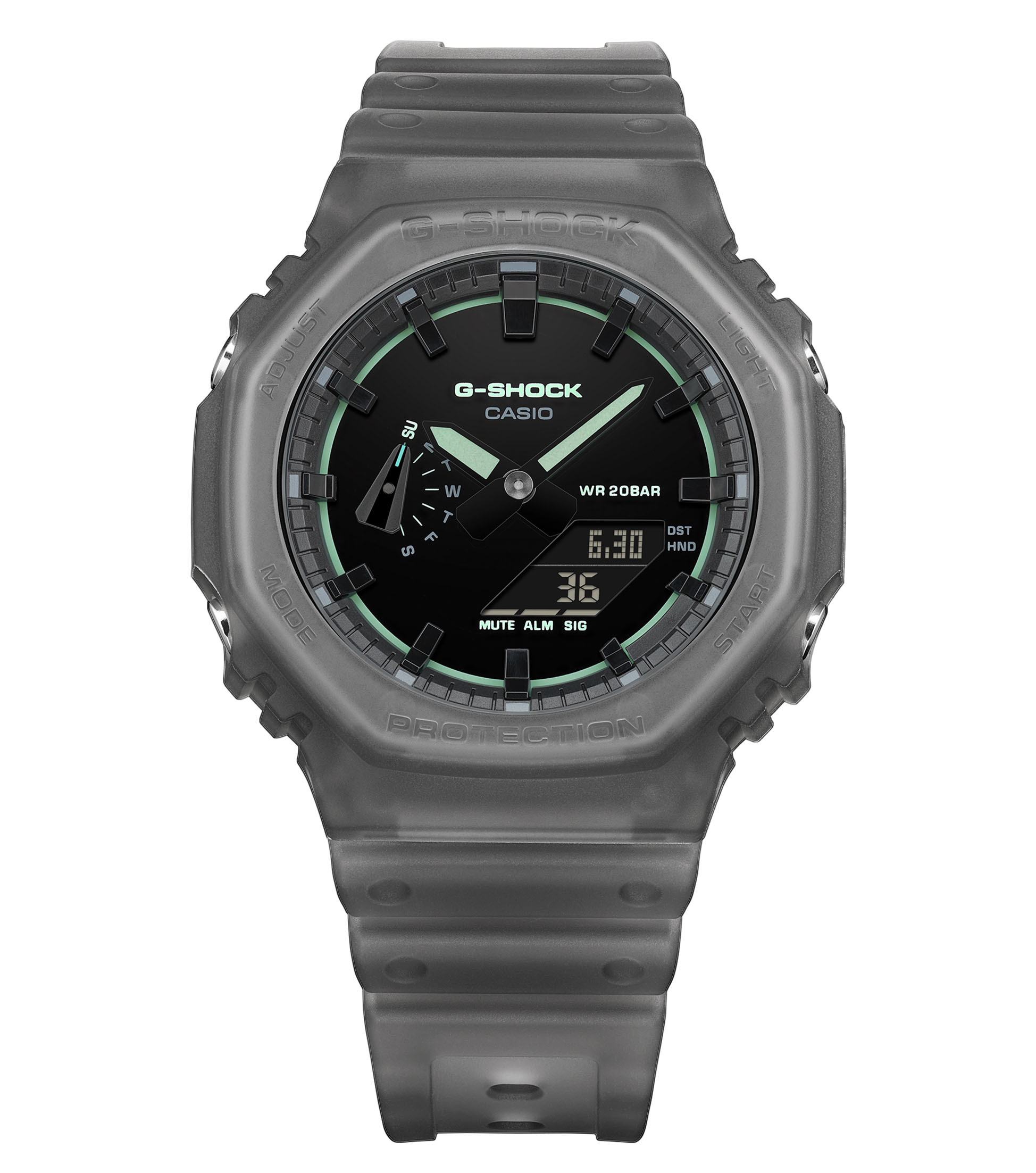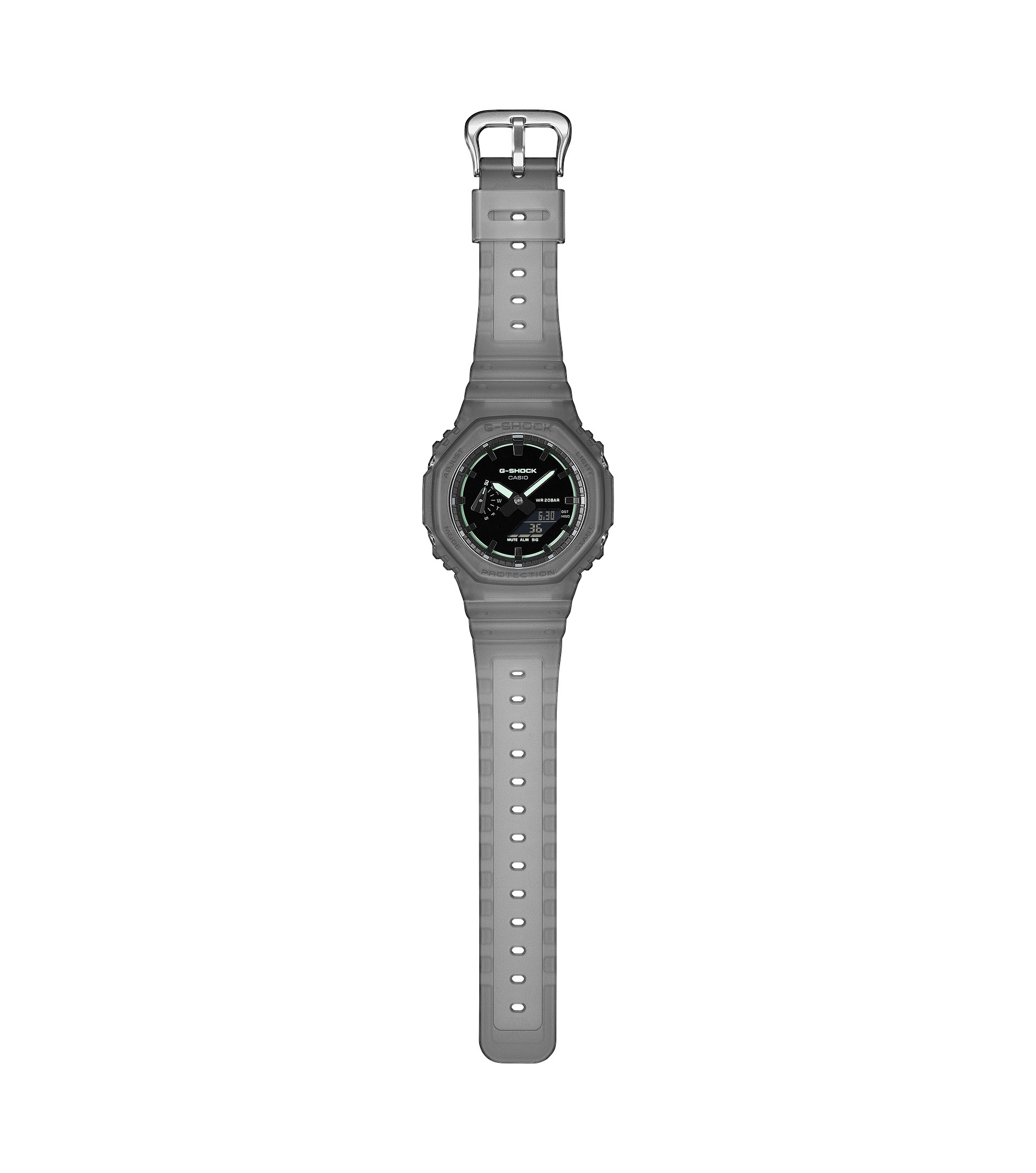 Dit G-Shock horloge uit de Classic Style GA-2100 serie combineert het iconische achthoekige ontwerp met een moderne transparante look. De kast heeft een afmeting van 48,5(L)×45,4(B) mm en is gemaakt van een sterke carbon-harsconstructie die het horloge licht en duurzaam maakt. De transparant grijze kast en band geven het horloge een eigentijdse uitstraling, terwijl de zwarte wijzerplaat met subtiele groene accenten zorgt voor een sportief contrast. Het analoog-digitale quartz uurwerk biedt een duidelijke tijdweergave en praktische functies zoals wereldtijd, stopwatch, timer en vijf dagelijkse alarmen. Dankzij de geïntegreerde Super Illuminator LED-verlichting blijft de tijd ook in het donker goed afleesbaar. Het mineraalglas beschermt het horloge tegen krassen en stoten en met een waterdichtheid van 20 ATM (Watersport) is dit model geschikt voor actieve momenten.