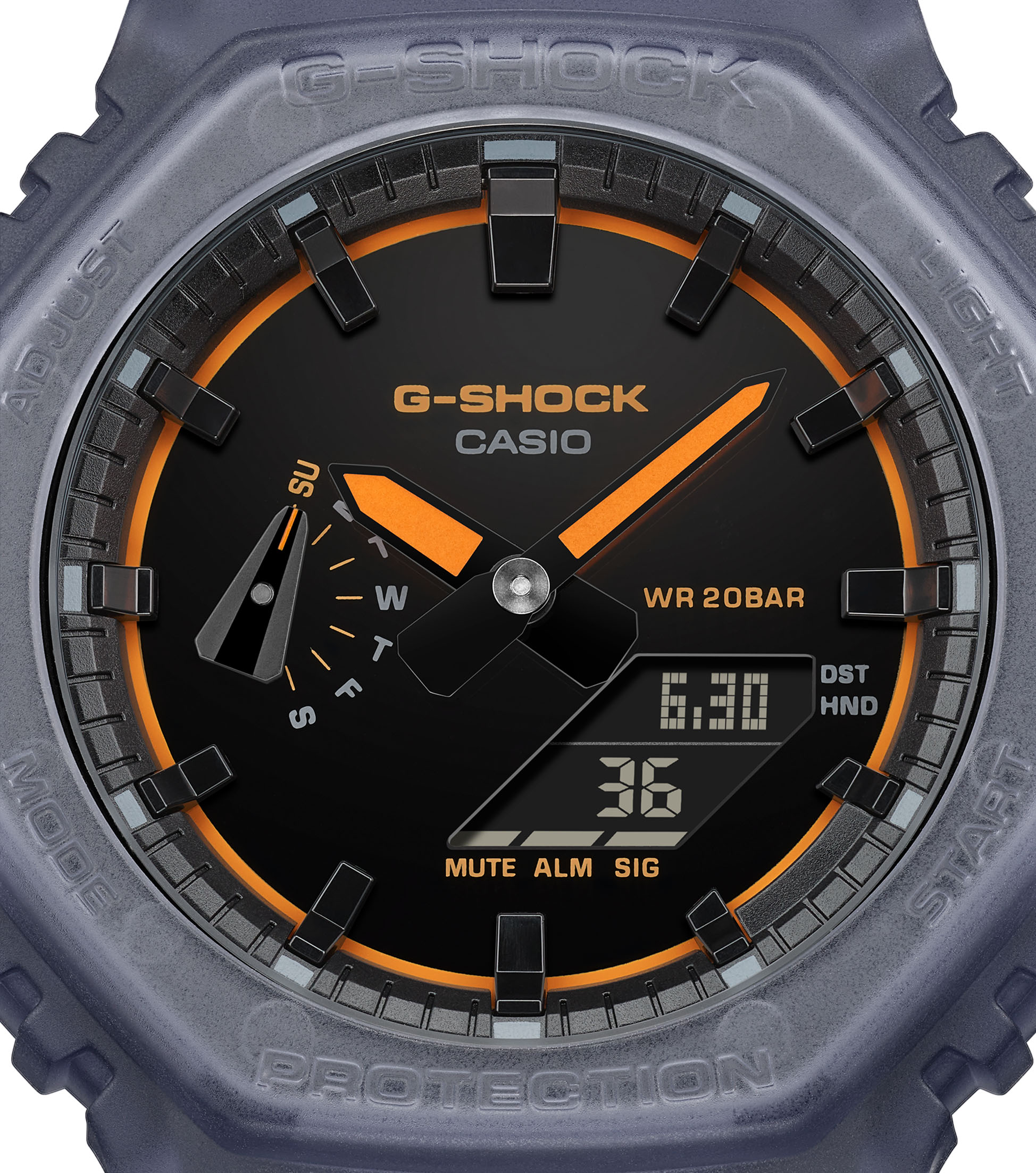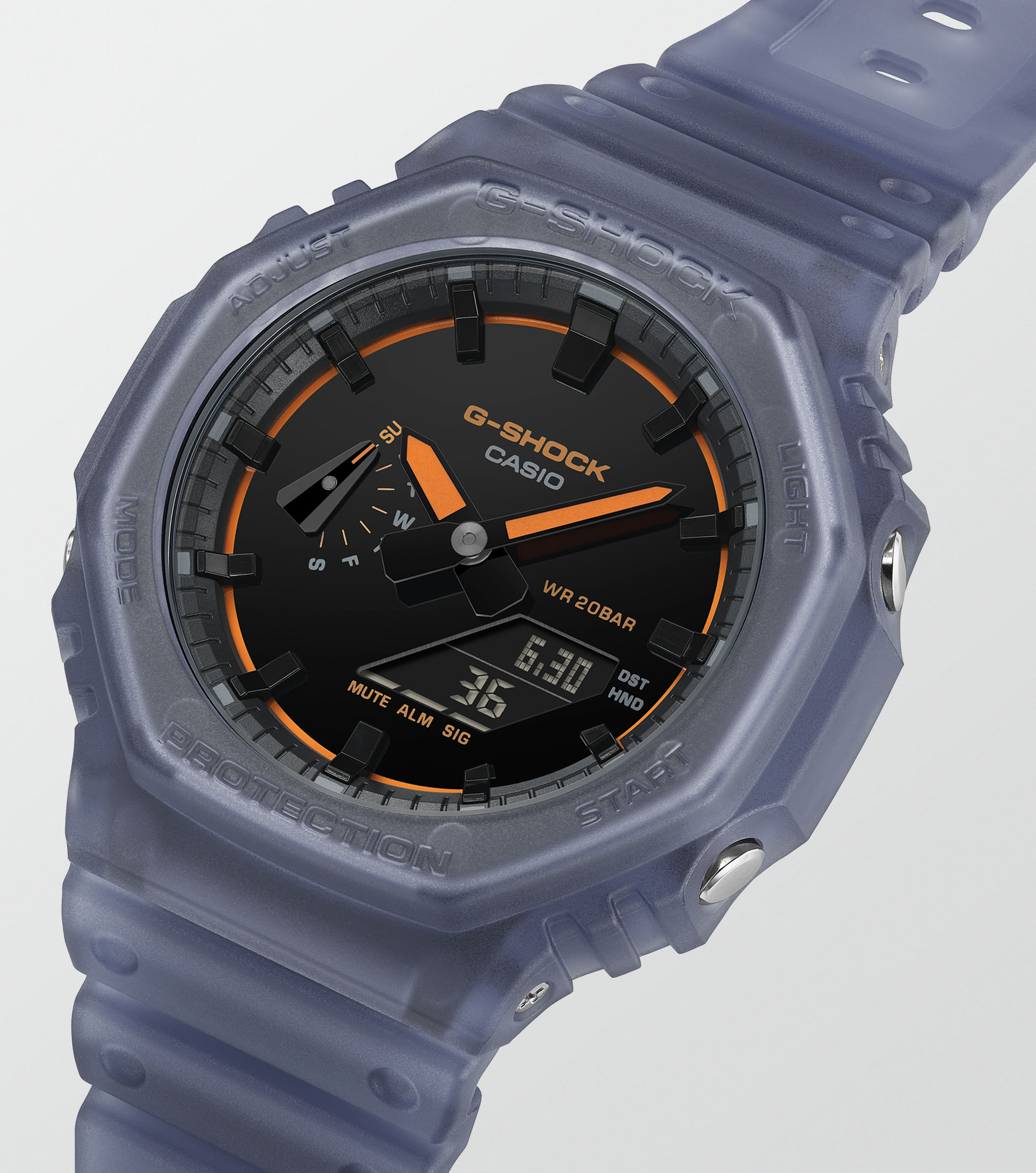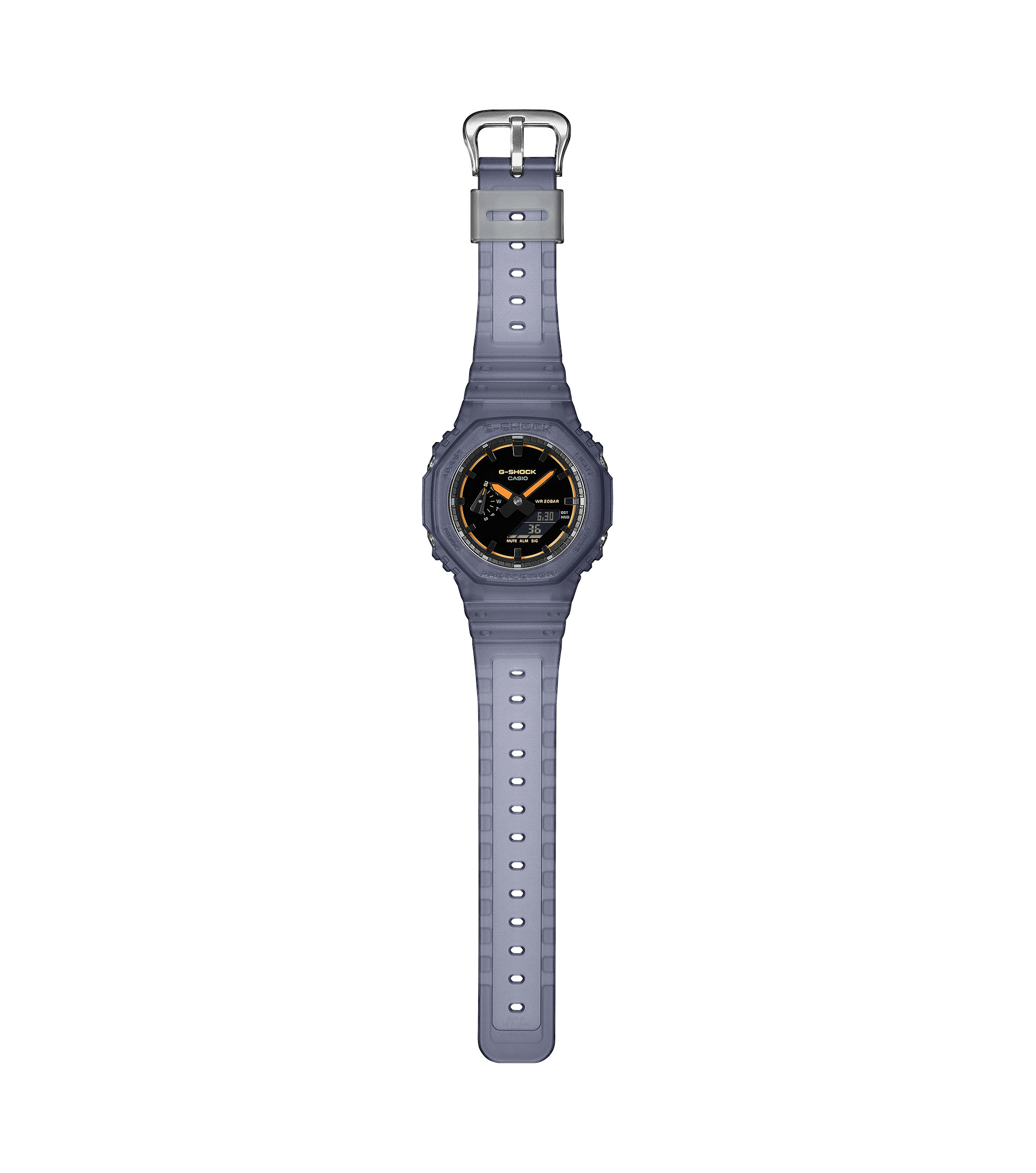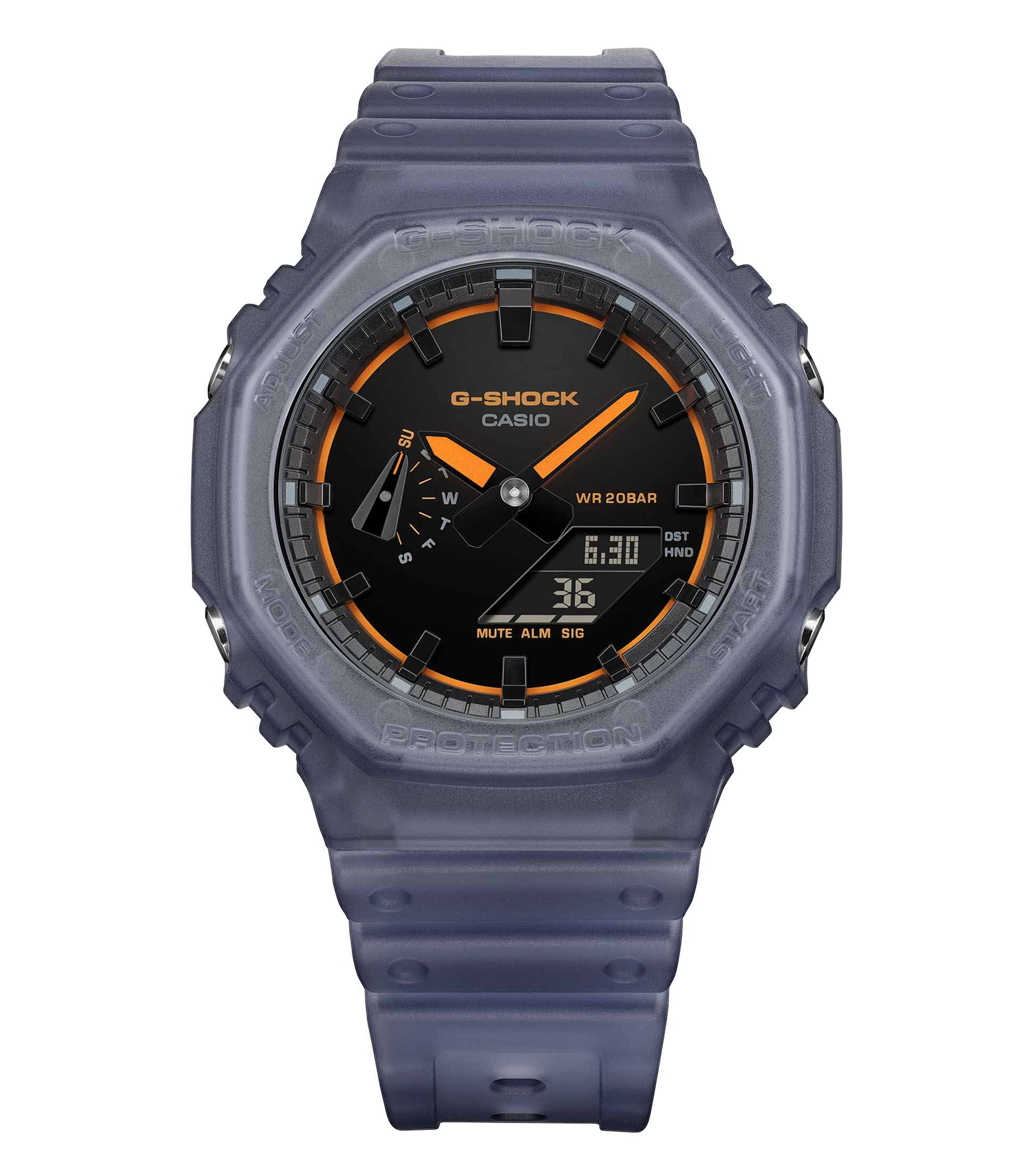 Dit G-Shock horloge uit de Classic Style GA-2100 serie combineert het iconische achthoekige ontwerp met een moderne transparante uitstraling. De kast heeft een afmeting van 48,5(L)×45,4(B) mm en is gemaakt van een sterke carbon-harsconstructie die zorgt voor een licht en duurzaam horloge. De transparant blauwgrijze kast en band geven het model een eigentijdse look, terwijl de zwarte wijzerplaat met opvallende oranje accenten zorgt voor een sportief contrast. Het analoog-digitale quartz uurwerk biedt een duidelijke tijdweergave en handige functies zoals wereldtijd, stopwatch, timer en vijf dagelijkse alarmen. Dankzij de Super Illuminator LED-verlichting blijft de tijd ook in het donker goed afleesbaar. Het horloge is voorzien van mineraalglas en een schokbestendige constructie. Met een waterdichtheid van 20 ATM (Watersport) is dit model geschikt voor actieve momenten.