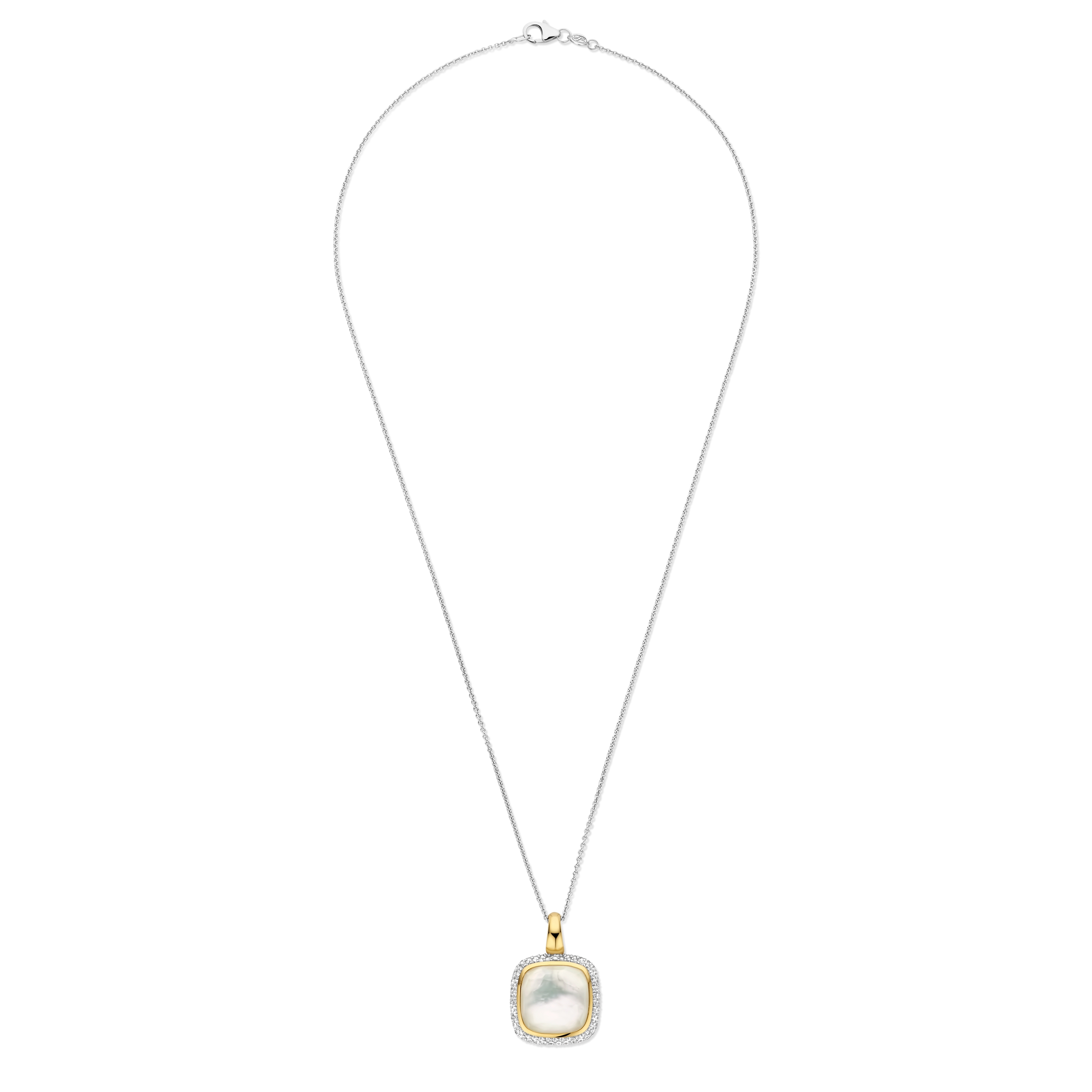 Deze ketting is onmisbaar in iedere sieradencollectie. De ketting en hanger zijn vervaardigd uit 925 sterling zilver, waarbij de hanger is voorzien van een goudlaag. De hanger heeft prachtige elegante details die iedere outfit magisch maken. De grote imitatie kristal, gecombineerd met de kleine zirkonia steentjes, zorgt ervoor dat de ketting gemakkelijk te combineren is met andere kettingen of sieraden.