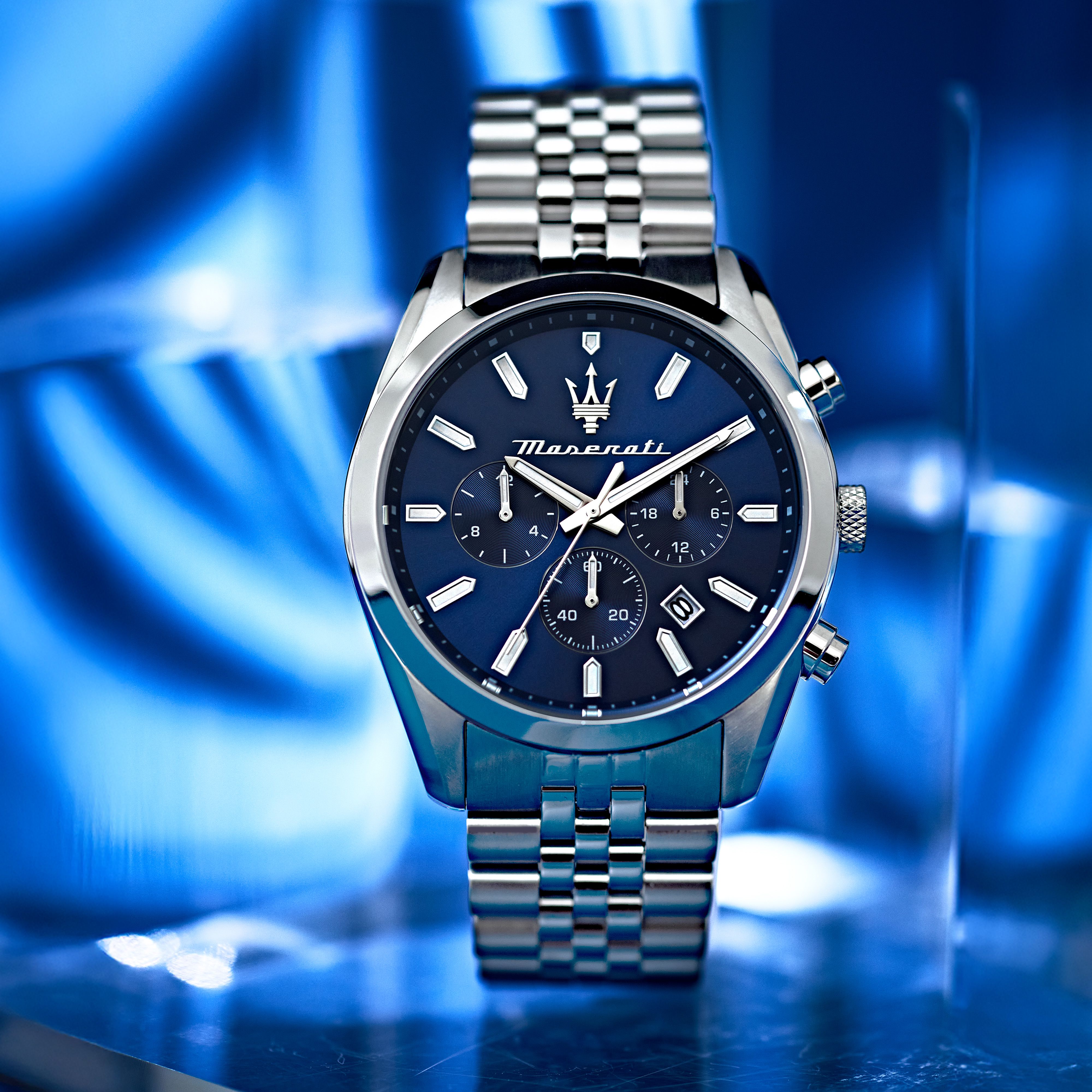 Dit sportieve herenhorloge van Maserati uit de Attrazione collectie combineert een krachtige uitstraling met verfijnd Italiaans design. De roestvrijstalen kast met een diameter van 43 mm zorgt voor een robuuste en moderne uitstraling om de pols. De blauwe wijzerplaat geeft het horloge een stijlvolle en dynamische uitstraling en vormt een mooi contrast met de stalen kast en horlogeband. De chronograaf functies en datumweergave maken het horloge niet alleen sportief, maar ook praktisch in dagelijks gebruik. De roestvrijstalen horlogeband sluit comfortabel om de pols en is voorzien van een vouwsluiting, waardoor het horloge stevig en veilig gedragen kan worden. Het mineraalglas beschermt de wijzerplaat tegen dagelijkse invloeden. Met een waterdichtheid van 5 ATM is het horloge bestand tegen spatwater en regen. Het herkenbare Maserati drietandlogo op de wijzerplaat benadrukt de sportieve en exclusieve identiteit van het merk.