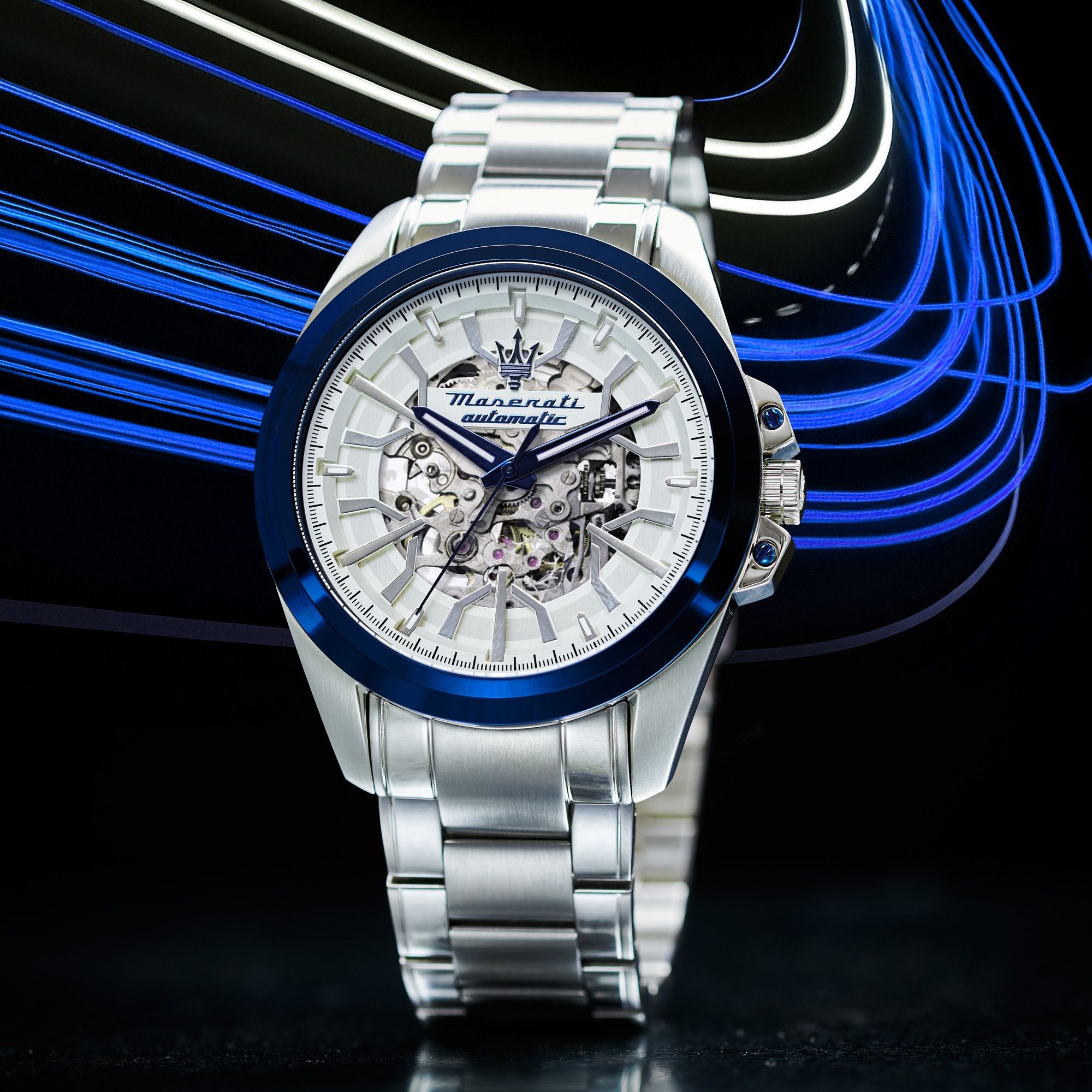 Dit stijlvolle herenhorloge van Maserati uit de Traguardo Automatic Skeleton collectie combineert sportieve elegantie met verfijnde techniek. De roestvrijstalen kast met een diameter van 43 mm geeft het horloge een krachtige en moderne uitstraling om de pols. De opengewerkte skeleton wijzerplaat biedt een fascinerende inkijk in het mechanische uurwerk en zorgt voor een luxe en technisch karakter. De robuuste kast vormt samen met de stalen horlogeband een sportief en stijlvol geheel dat perfect aansluit bij het design-DNA van Maserati. Dankzij het automatische uurwerk wordt het horloge aangedreven door de beweging van de pols en is een batterij niet nodig. Het mineraalglas beschermt de wijzerplaat tegen dagelijkse invloeden, terwijl de waterdichtheid van 10 ATM het horloge geschikt maakt voor watersport. Het iconische Maserati drietandlogo op de wijzerplaat benadrukt de exclusieve en sportieve identiteit van dit model.