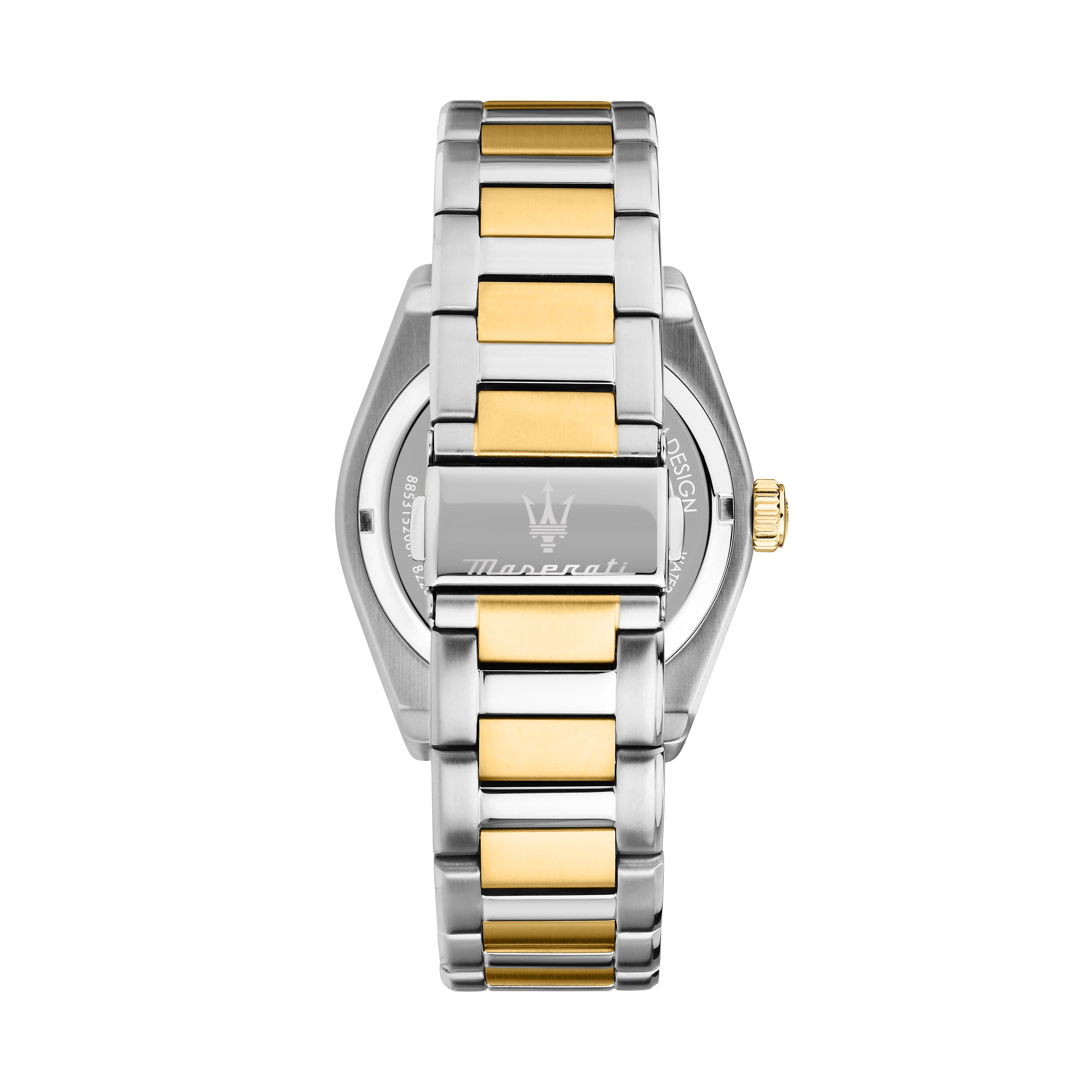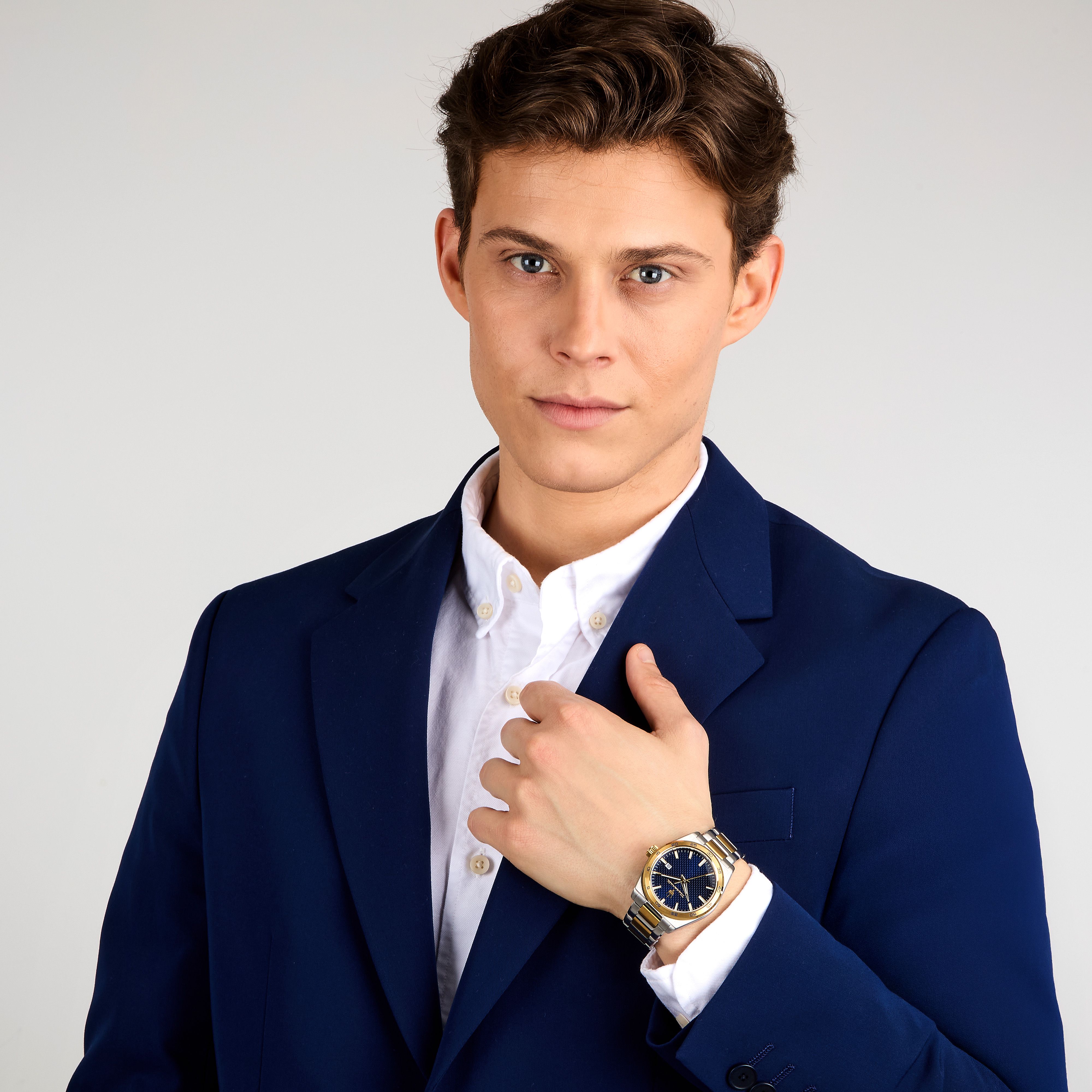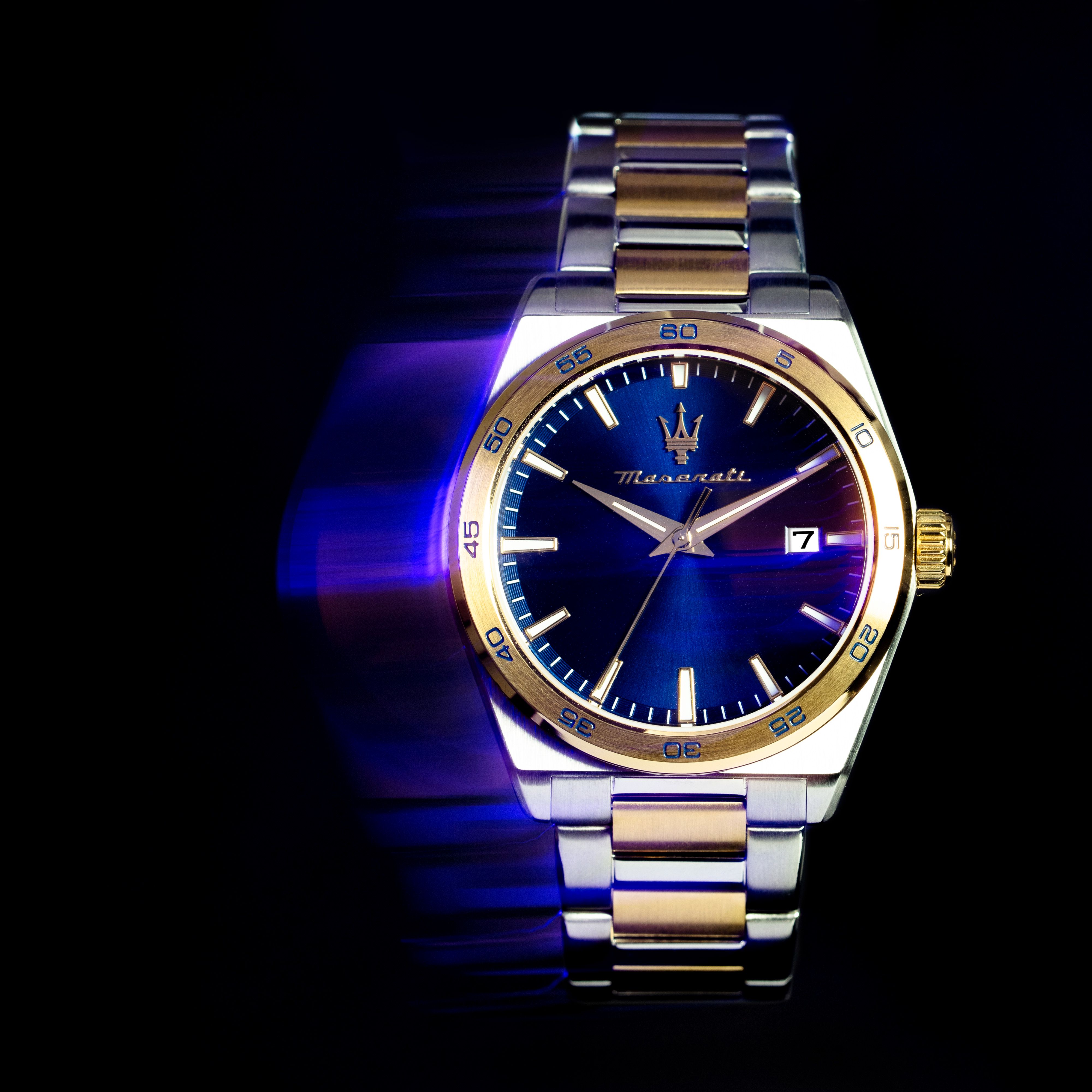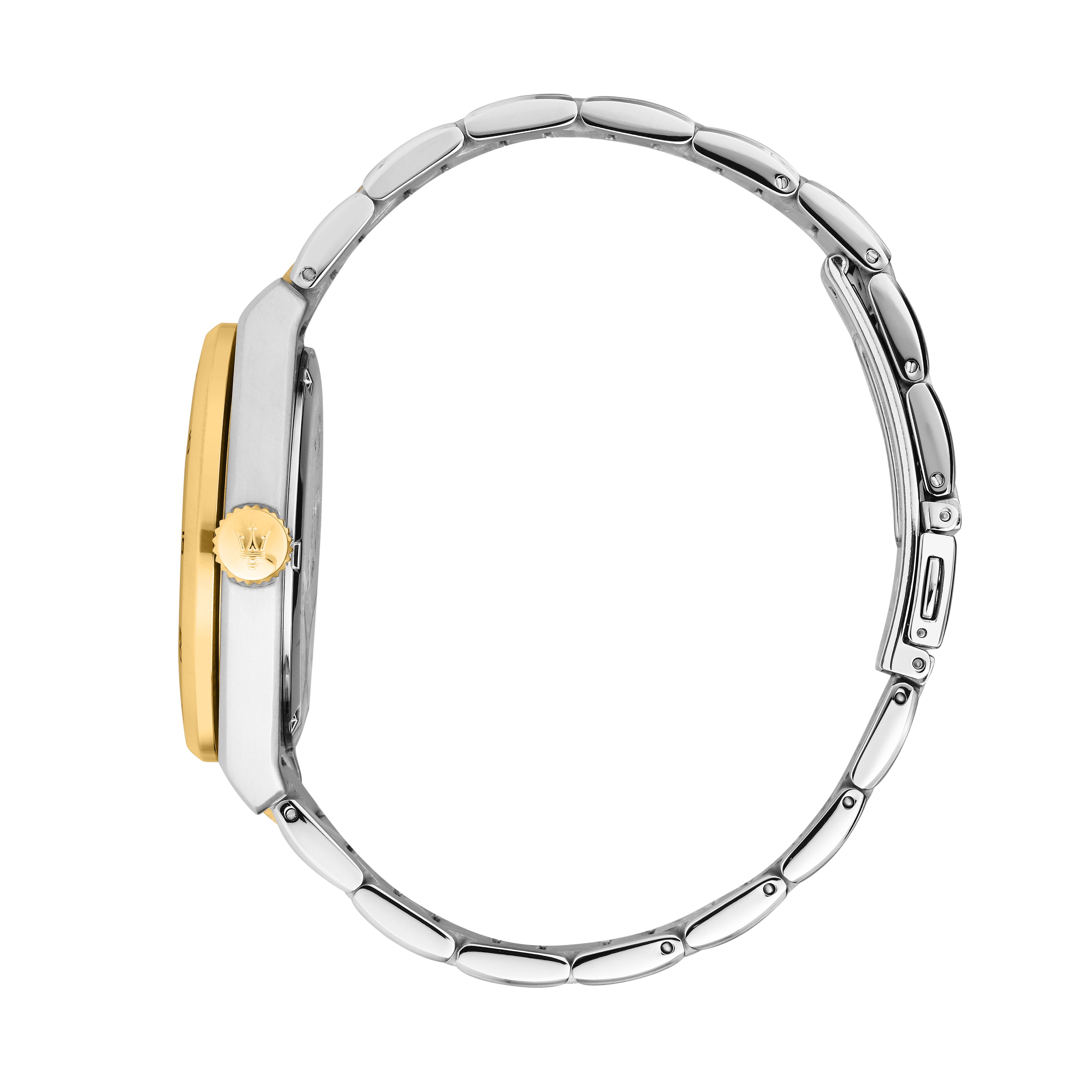 Het Velocità herenhorloge van Maserati combineert sportieve elegantie met een luxe tweekleurig design. De 41 mm roestvrijstalen kast geeft het horloge een krachtige uitstraling om de pols, terwijl de goudkleurige lunette en accenten in de stalen horlogeband zorgen voor een stijlvol contrast. De blauwe wijzerplaat met subtiel structuurpatroon geeft het horloge een moderne en dynamische uitstraling. Op de wijzerplaat bevindt zich een datumvenster, wat het horloge niet alleen stijlvol maar ook praktisch maakt voor dagelijks gebruik. Het iconische Maserati drietandlogo benadrukt het exclusieve karakter van dit model. Het horloge wordt aangedreven door een betrouwbaar quartz uurwerk en is voorzien van mineraalglas, wat bescherming biedt tegen krassen en dagelijkse invloeden. De tweekleurige stalen band sluit comfortabel en veilig dankzij een vouwsluiting. Met een waterdichtheid van 10 ATM is het horloge geschikt voor watersport.