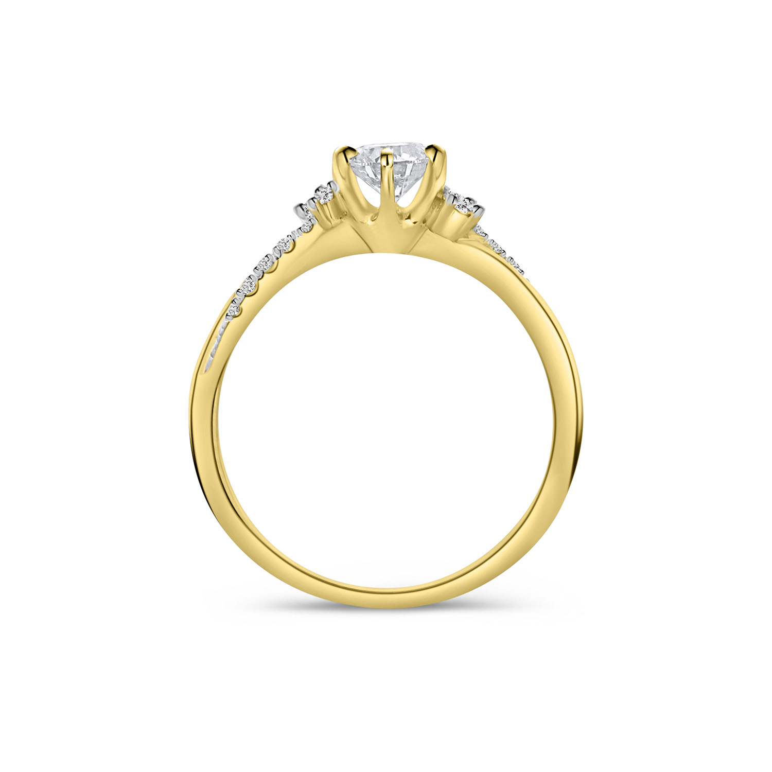 Deze prachtige 14 karaats geelgouden ring van Siebel komt uit de Millennium collectie. De ring is gezet met een schitterende lab grown diamant. De briljant geslepen man made diamant heeft een fijn witte kleur, is 1 crt (SI 1). 1 steen van 0.50 ct aan beide kanten gezet met in totaal 0.16 ct. De ring is verfijnd, elegant en heeft een chique uitstraling. Een prachtige toevoeging aan jouw sieraden collectie