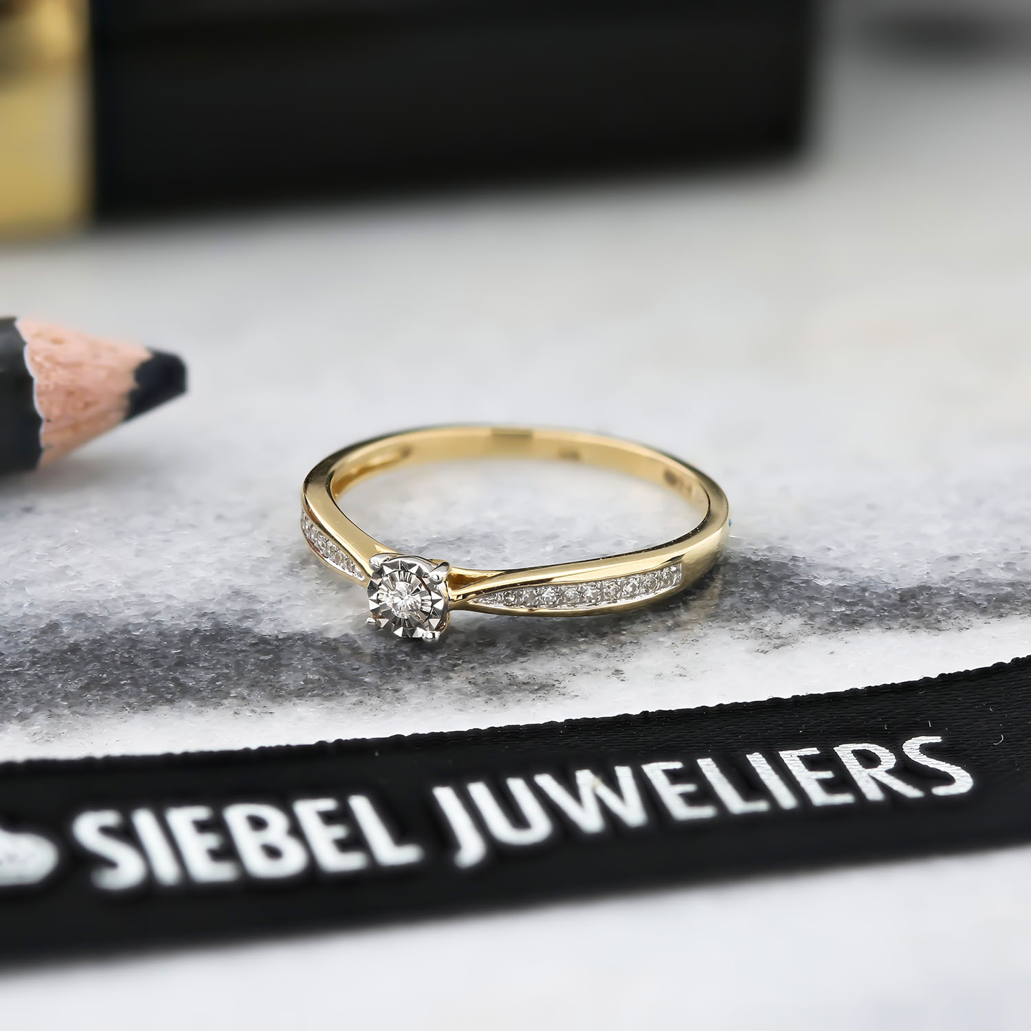 Geelgouden ring met diamanten uit de Miracle collectie. De ring is vervaardigd uit 14 karaats geelgoud en is gezet met 19 schitterende witte briljant geslepen diamanten, verdeeld over de band en de zetting. Combineer de ring met de bijpassende sieraden uit de collectie en maak je look compleet.