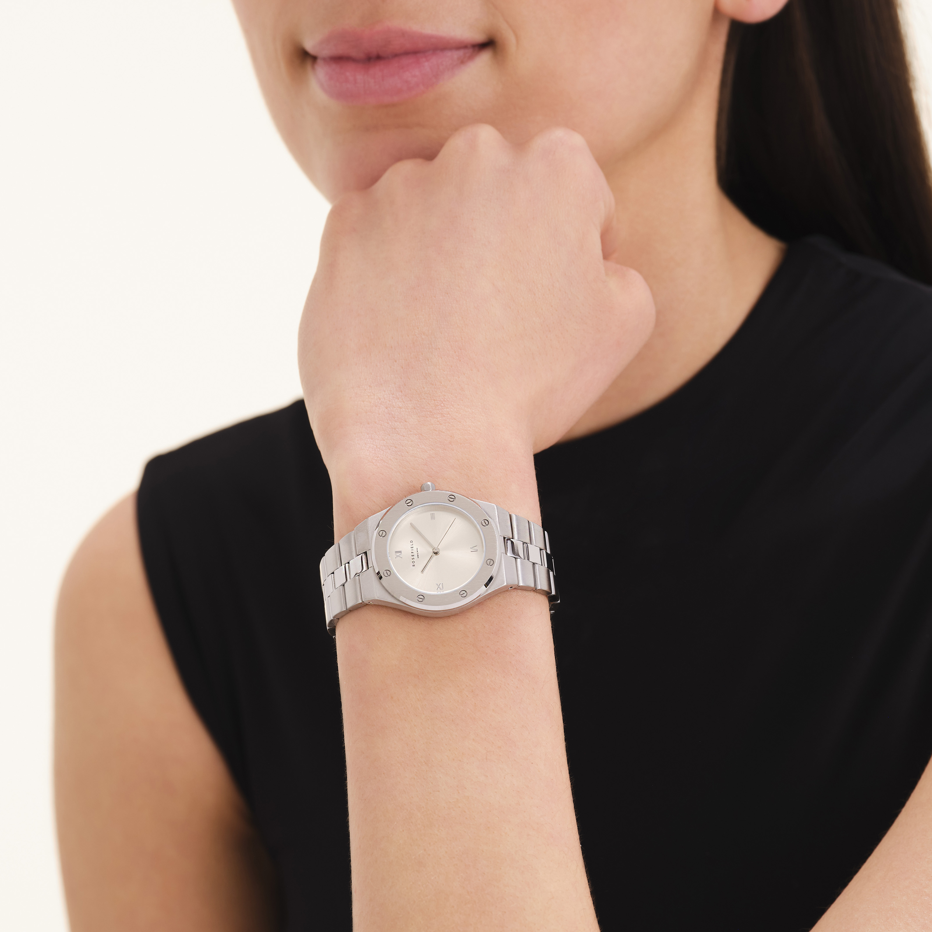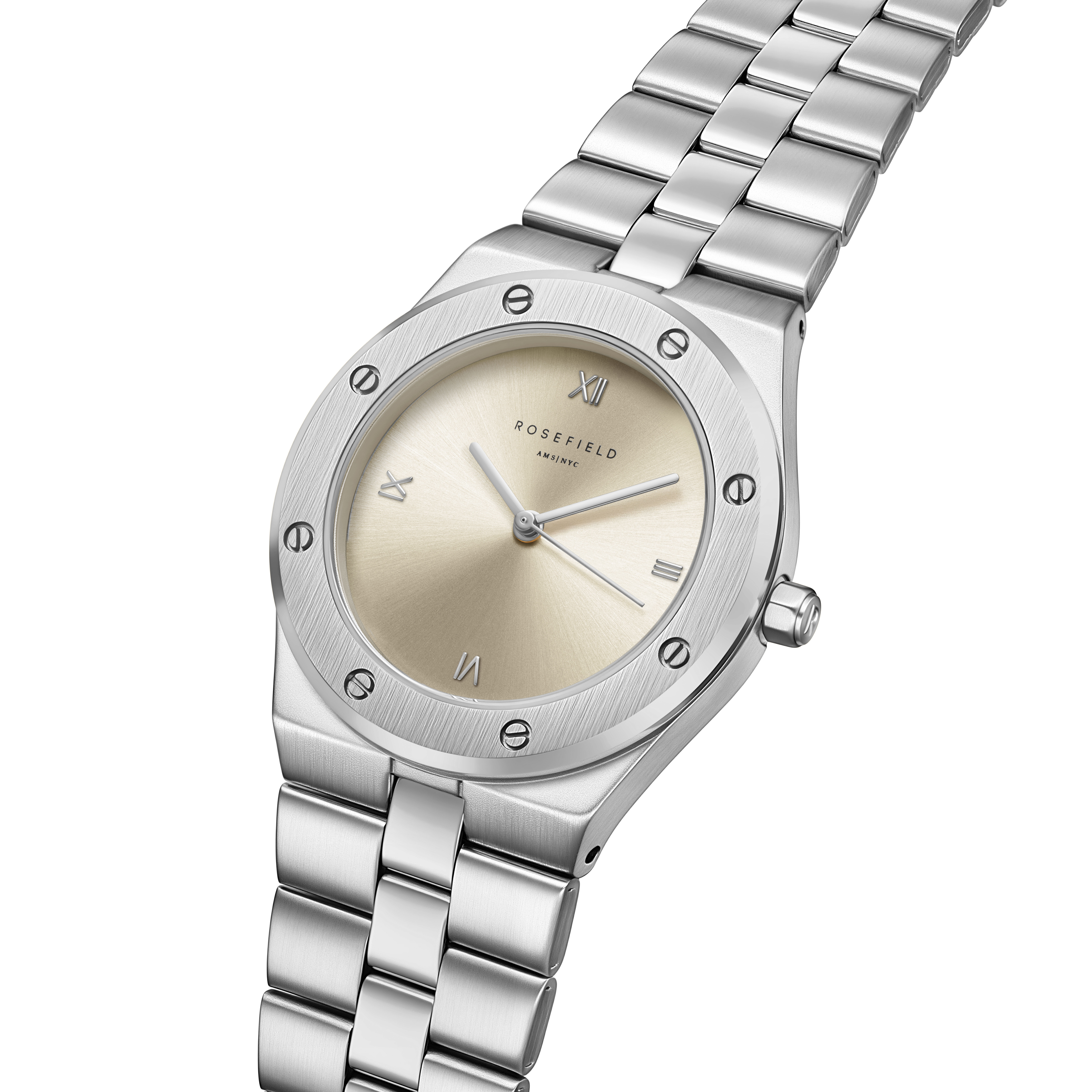 De Rose Ivory Sunray Silver is een nieuw model binnen Rosefield. Het horloge heeft een ronde messing kast van 33 x 40 mm en een crèmekleurige sunray-wijzerplaat. De kast is uitgevoerd in zilverkleur en gecombineerd met een zilverkleurige roestvrijstalen band met een bandmaat van 20 x 16 mm en een haaksluiting. Afgewerkt met mineraalglas. Waterdicht tot 3 ATM: bestand tegen spatwater en regen, maar niet geschikt om mee te zwemmen.