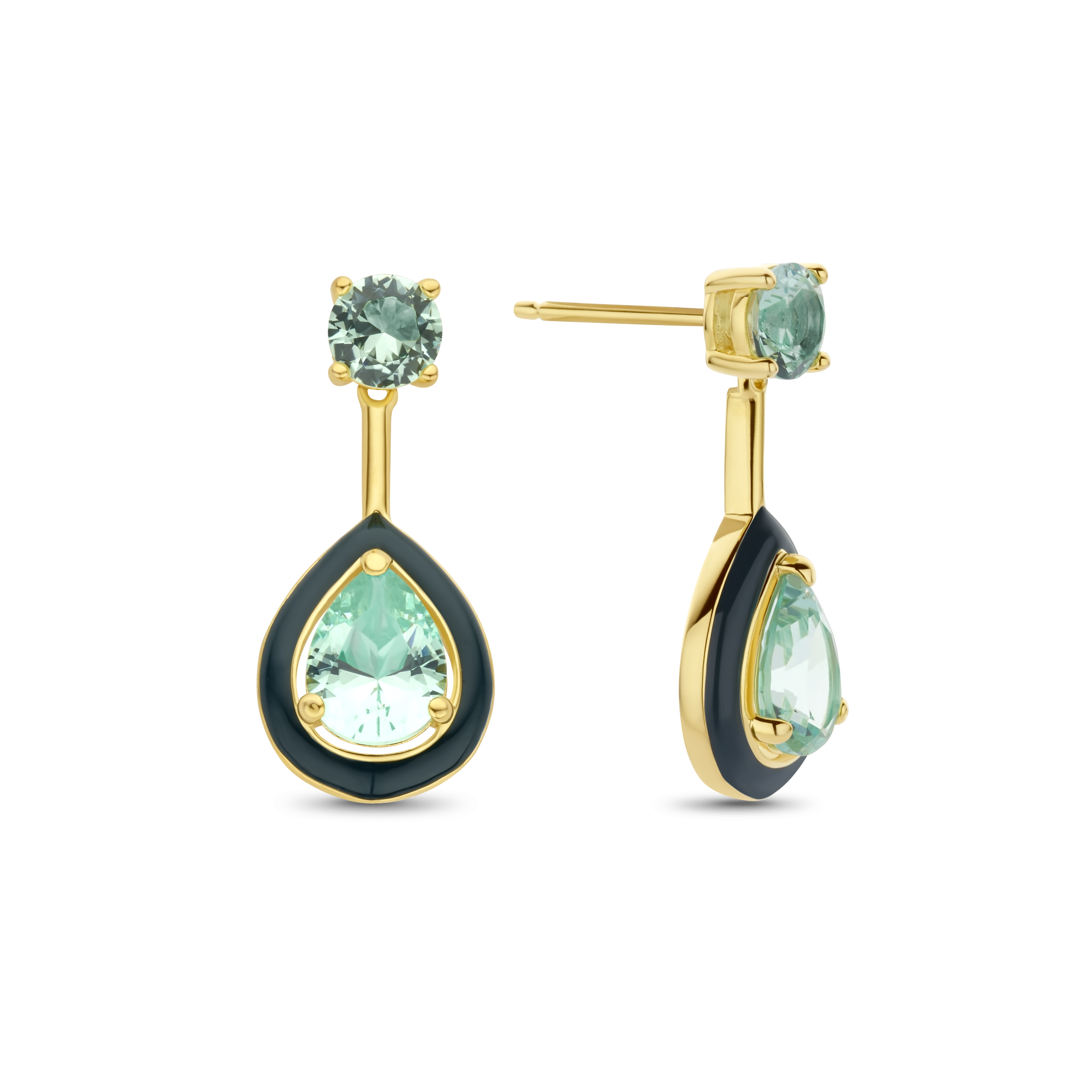 Gold plated oorbellen met peervormige groenblauwe emaille en donkergroene zirkonia.