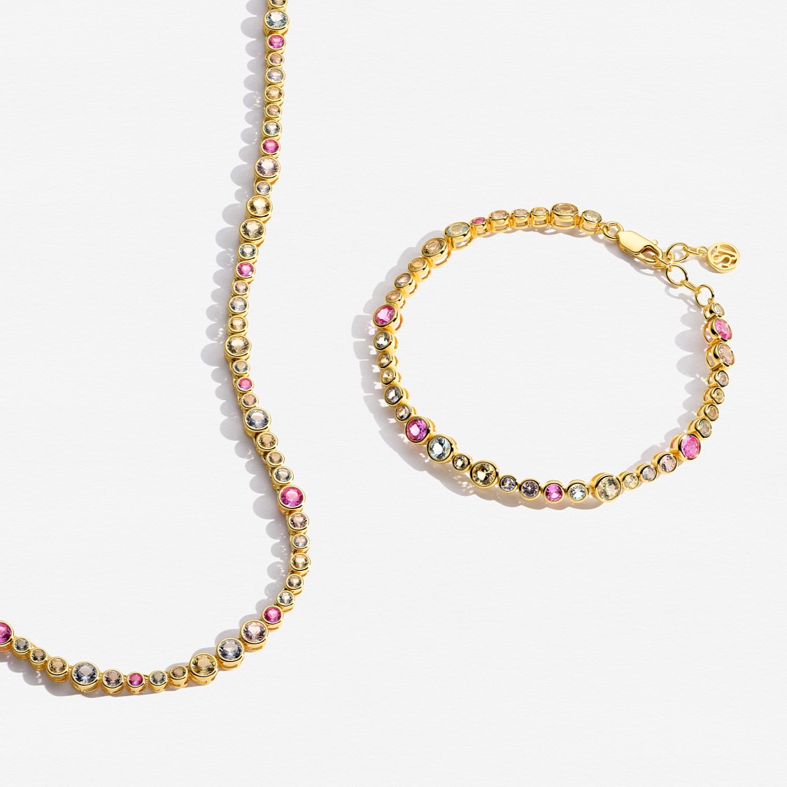 De Sif Jakobs Sardinien Altro armband is een luxueus statement piece binnen de Sardinien collectie. Deze armband is vervaardigd uit 925 sterling zilver en verguld met een gouden laag, wat zorgt voor een rijke en warme goudkleurige uitstraling. Het verfijnde ontwerp wordt versterkt door handgezette facetgeslepen multicolour zirkonia’s die het licht op een levendige manier weerkaatsen en een speels kleuraccent toevoegen. Met een breedte van 5 mm heeft de armband een stijlvolle, slanke uitstraling terwijl de schitterende stenen zorgen voor een opvallend effect. De armband heeft een lengte van 17 cm met een extra verlenging van 2 cm, waardoor hij verstelbaar is en mooi aansluit om de pols. Draag deze armband solo als verfijnde blikvanger of combineer met andere sieraden uit de Sardinien collectie voor een krachtige en persoonlijke uitstraling.