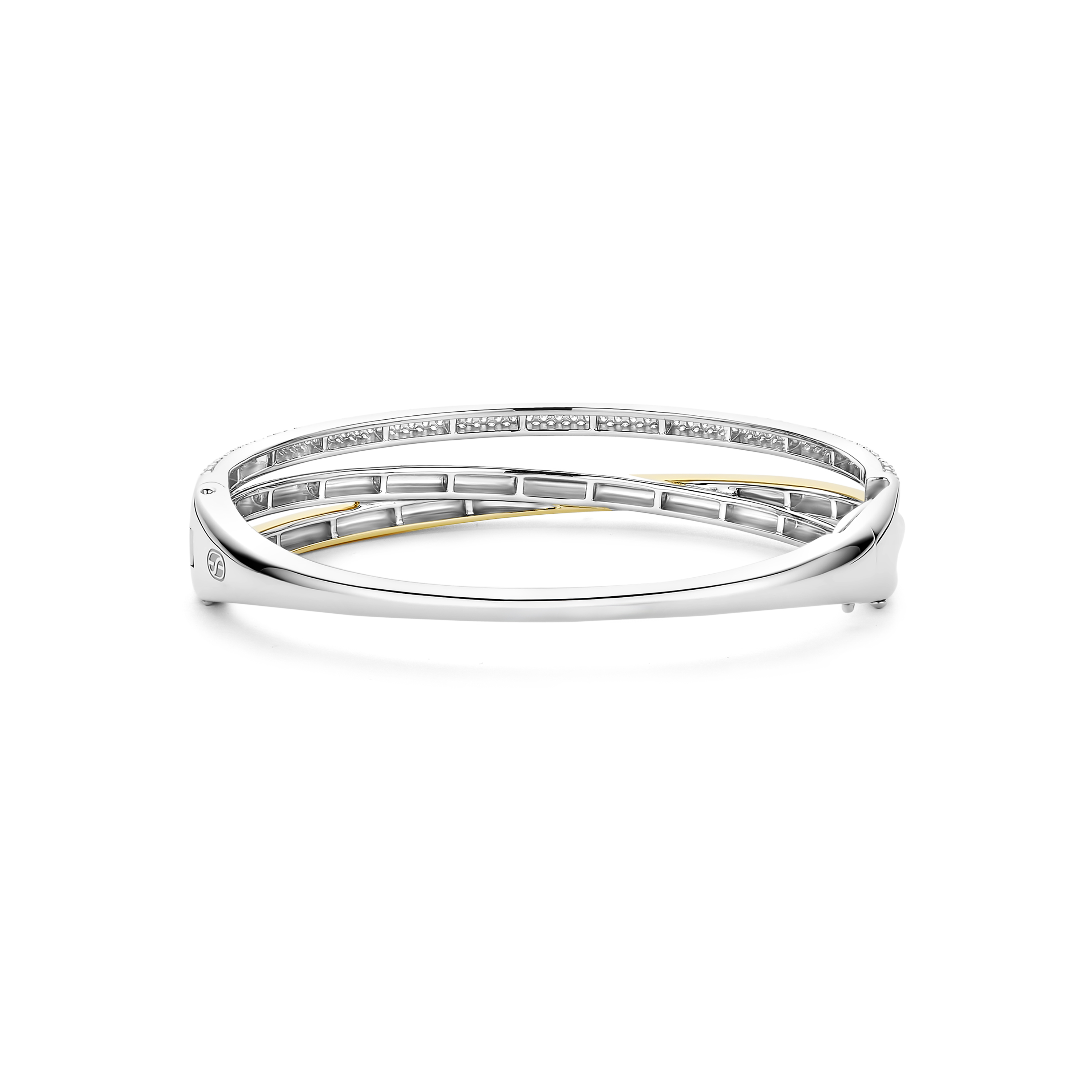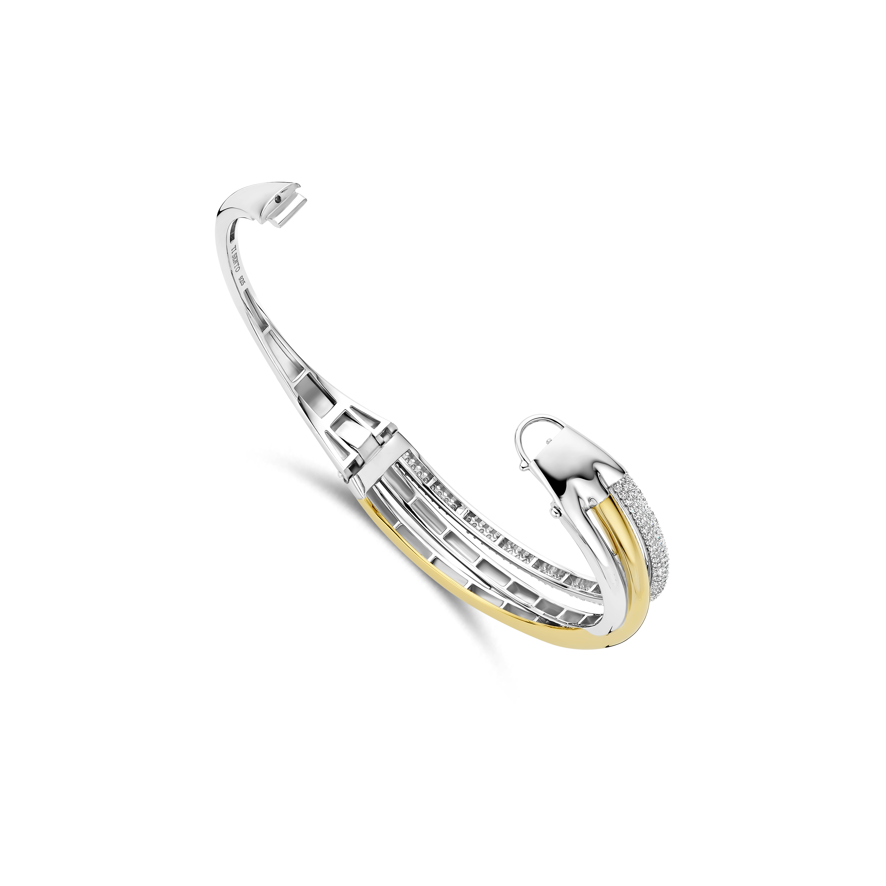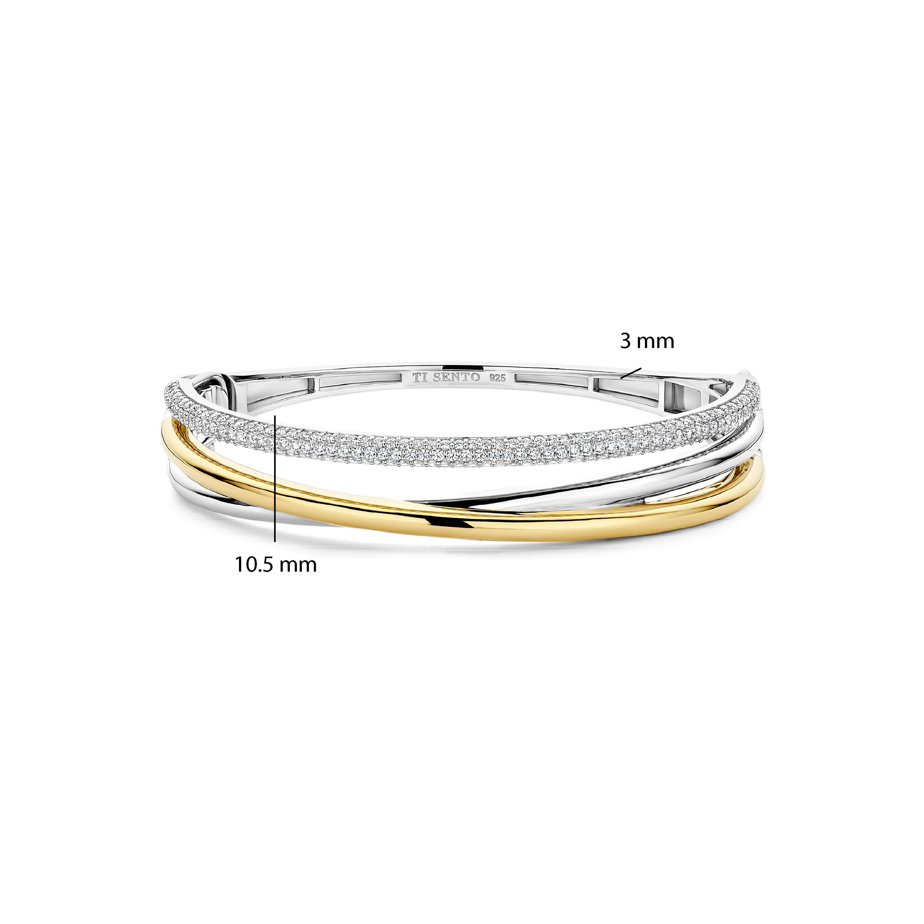 Deze TI SENTO – Milano bangle uit de Structures collectie is een krachtig en verfijnd statement waarin vloeiende lijnen samenkomen. Het ontwerp is vervaardigd uit 925 sterling zilver en opgebouwd uit meerdere elegante banen die speels over elkaar lijken te bewegen. Eén baan is volledig pavé gezet met schitterende zirkonia’s voor een luxueuze fonkeling, terwijl een andere baan is afgewerkt met een warme geelvergulde glans die zorgt voor een stijlvol contrast. Met een breedte van 10,5 mm aan de bovenzijde heeft deze bangle een uitgesproken uitstraling, terwijl de achterzijde met 3 mm verfijnd en comfortabel blijft. Dankzij de scharniersluiting sluit hij veilig om de pols en draagt hij moeiteloos van dag tot avond.