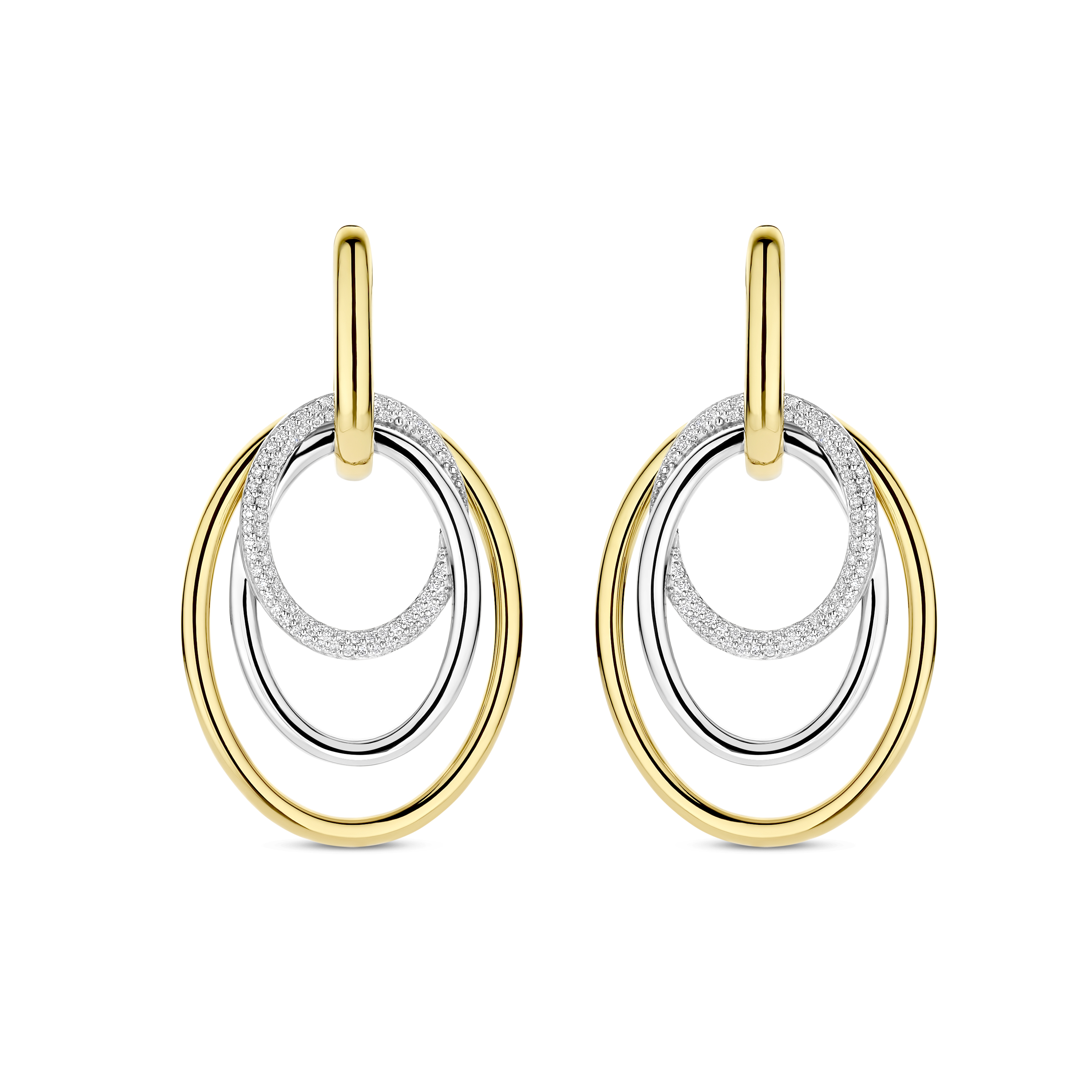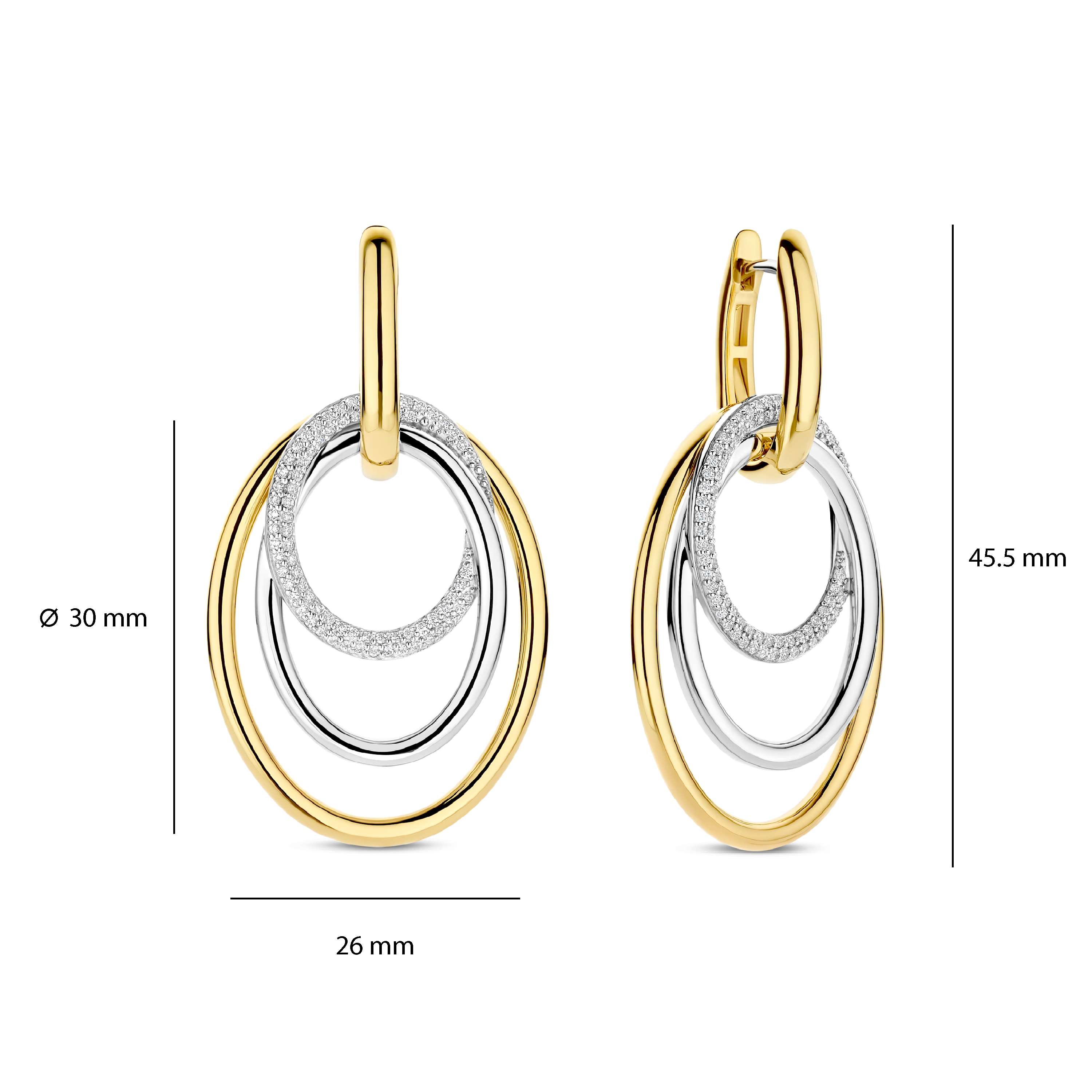 Deze TI SENTO – Milano oorhangers uit de Structures collectie combineren warme geelvergulde accenten met glanzend zilver in een verfijnd, gelaagd ontwerp. De oorbellen zijn vervaardigd uit 925 sterling zilver en bestaan uit meerdere ovale ringen, waaronder een pavé gezette ring met subtiel geplaatste zirkonia’s die zorgen voor een elegante schittering. De mix van zilver en geelverguld geeft het ontwerp een moderne en stijlvolle uitstraling. De oorhangers hebben een totale lengte van 45,5 mm. De hanger meet 30 mm in hoogte en 26 mm in breedte, waardoor het ontwerp mooi opvalt en sierlijk langs het oor valt. Dankzij de klapsluiting zijn de oorbellen comfortabel en veilig te dragen.