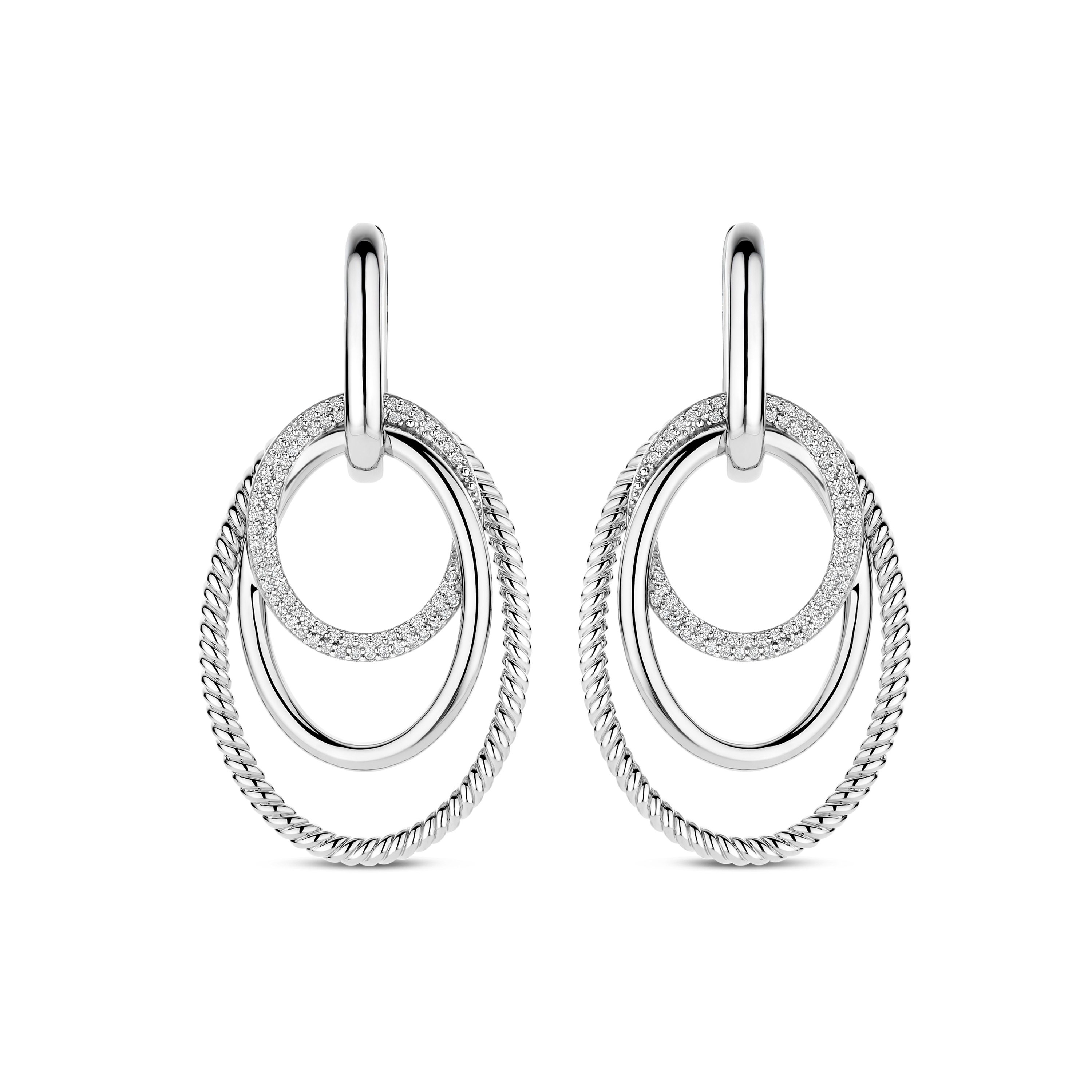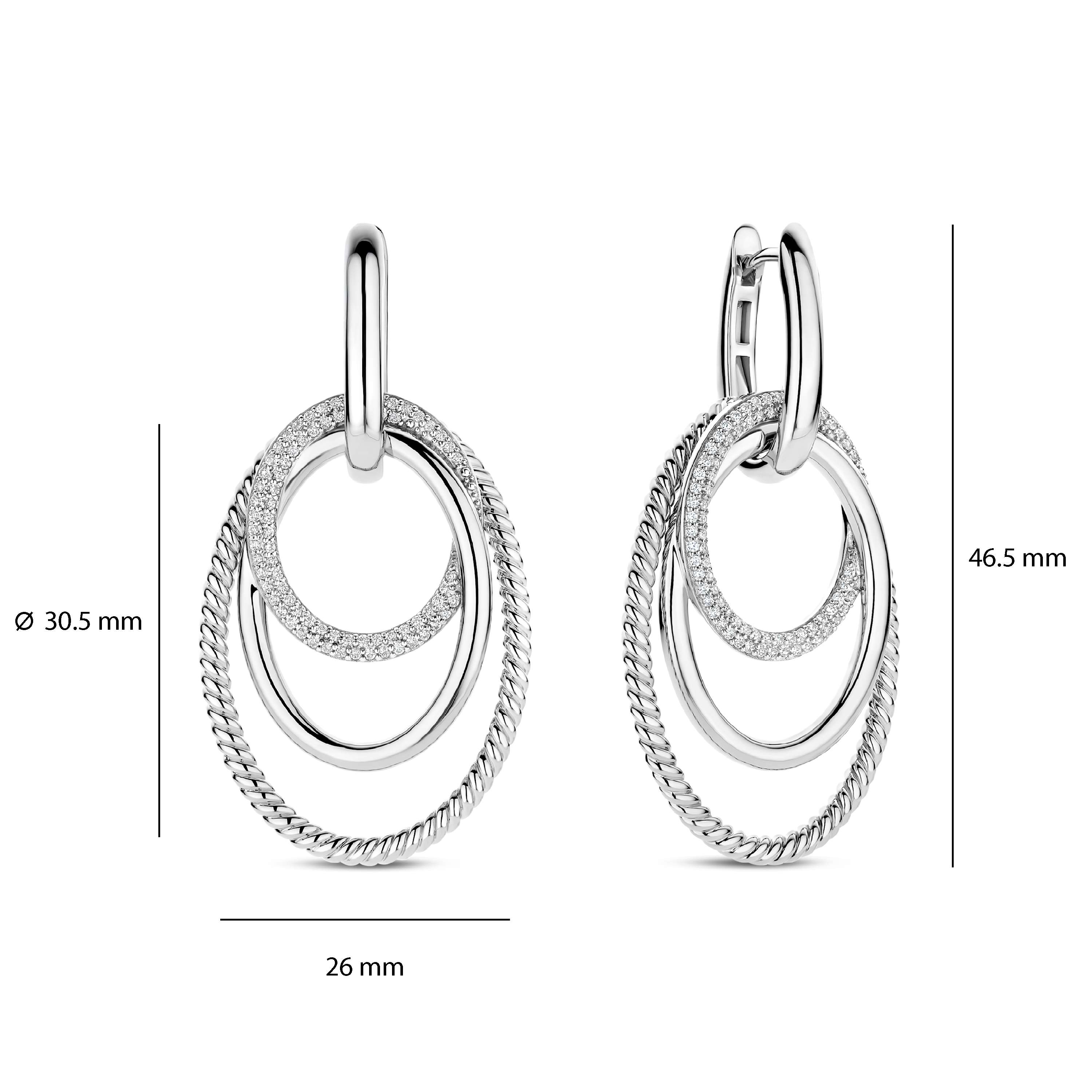 Deze TI SENTO – Milano oorhangers uit de Structures collectie zijn vervaardigd uit 925 sterling zilver en kenmerken zich door een speels samenspel van ronde vormen en verfijnde details. Het ontwerp bestaat uit meerdere ovale ringen, waaronder een gedraaide structuur en een pavé gezette ring met sprankelende zirkonia’s, wat zorgt voor een elegante en gelaagde uitstraling. De oorhangers hebben een totale lengte van 46,5 mm. De hanger heeft een hoogte van 30,5 mm en een breedte van 26 mm, waardoor het ontwerp mooi opvalt zonder te overheersen. Dankzij de klapsluiting zijn de oorbellen comfortabel en veilig te dragen.
