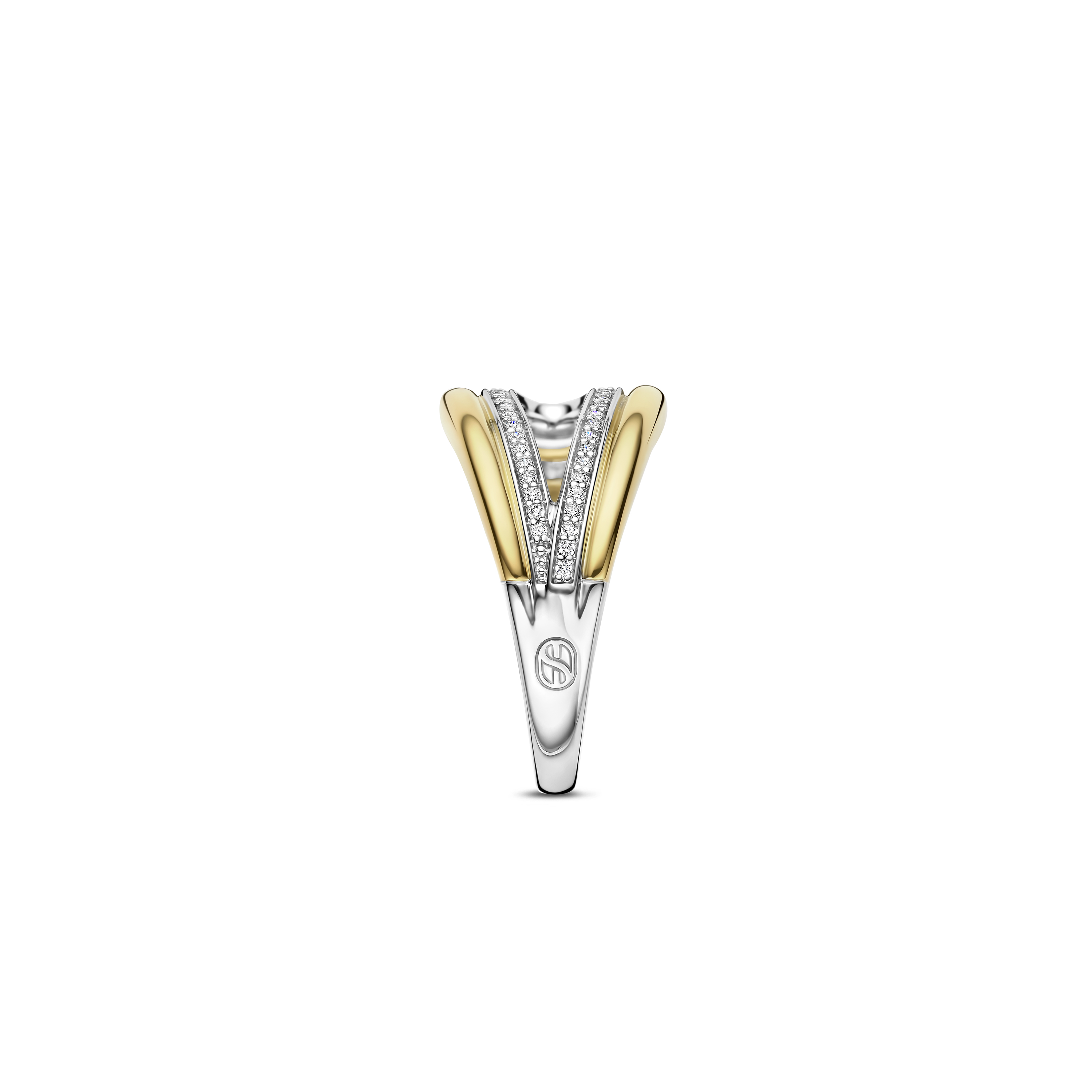 Deze TI SENTO – Milano ring is een krachtig en eigentijds ontwerp waarin warme en koele tinten samenkomen. De ring is vervaardigd uit 925 sterling zilver en afgewerkt met een geelvergulde, organisch gevormde bovenzijde die het design een zachte, sculpturale uitstraling geeft. In het midden schittert een verfijnde pavézetting van zirkonia’s die subtiel het licht vangt en voor een luxueus contrast zorgt. De bovenzijde heeft een breedte van 12 mm, terwijl de band onderaan slank blijft met 2,5 mm voor een comfortabele pasvorm. Een statement piece dat solo prachtig tot zijn recht komt, maar zich ook moeiteloos laat combineren met andere sieraden uit de TI SENTO collectie.