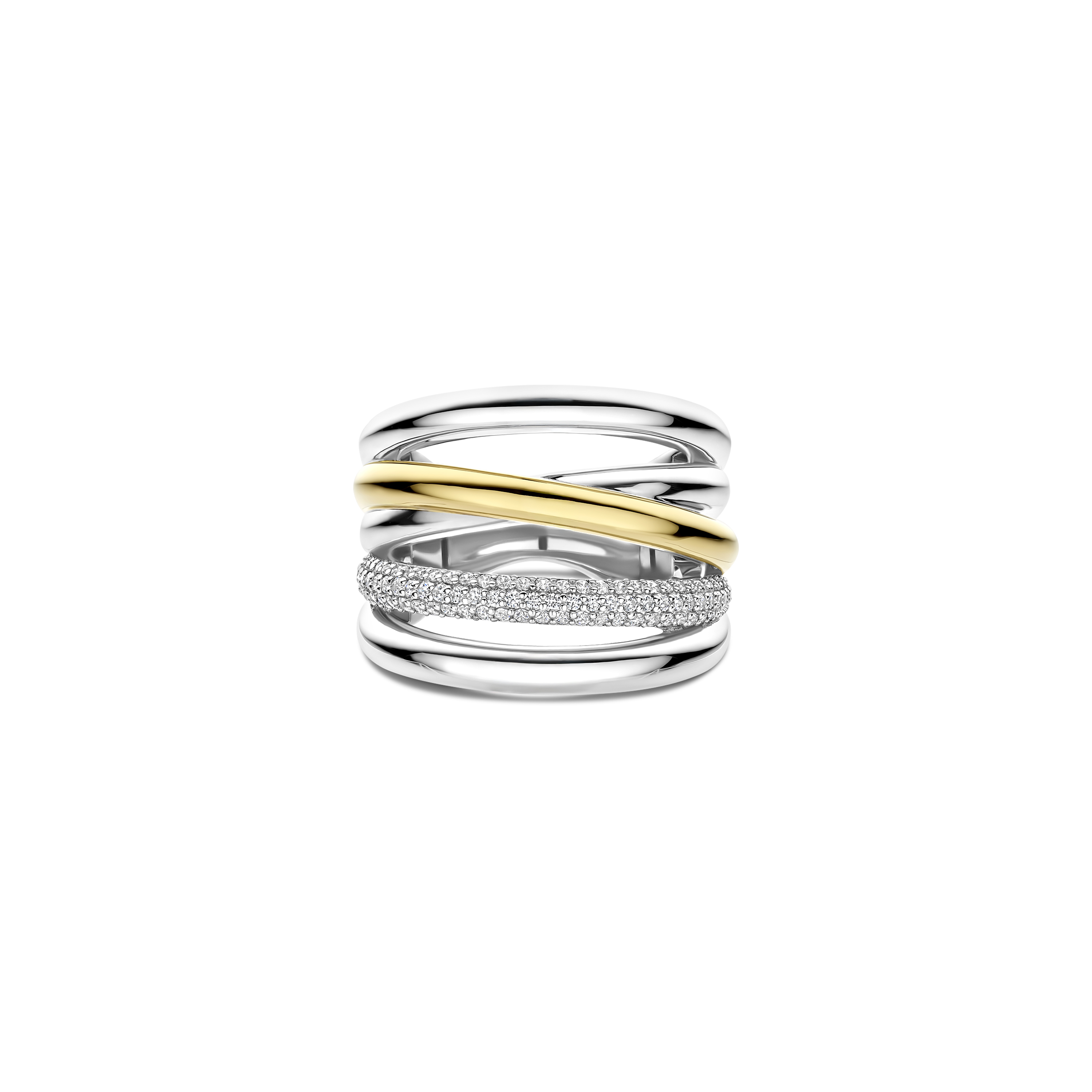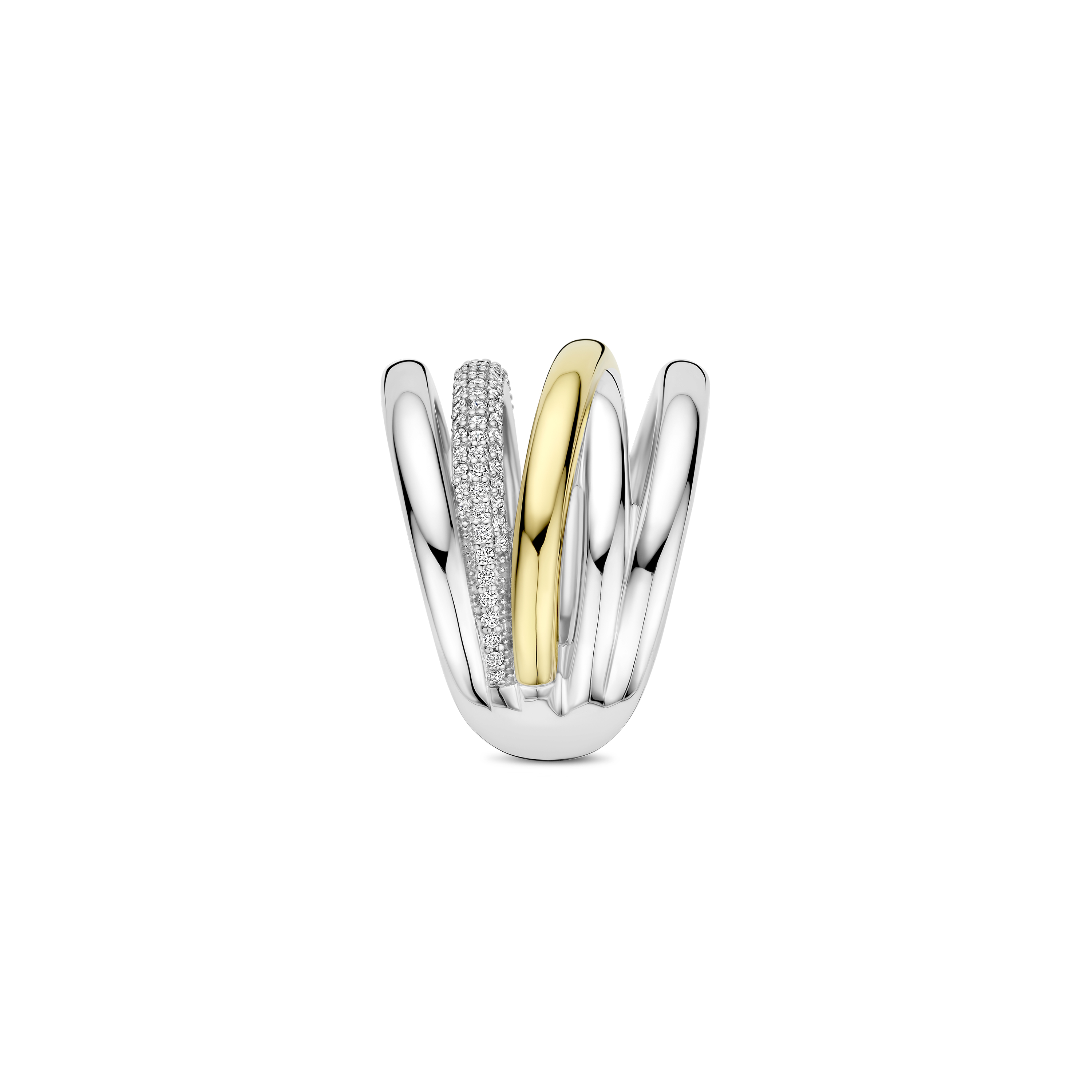 Deze TI SENTO – Milano ring uit de Structures collectie is een krachtig statement waarin vloeiende lijnen en contrast samenkomen. Het ontwerp is vervaardigd uit 925 sterling zilver en bestaat uit meerdere elegante banen die speels om elkaar heen lijken te bewegen. Een van de banen is warm geelverguld voor een stijlvol kleuraccent, terwijl een andere baan volledig pavé is gezet met schitterende zirkonia’s voor een luxueuze sprankeling. Met een royale breedte van 18 mm heeft deze ring een uitgesproken karakter, terwijl de band onderaan met 3 mm zorgt voor een comfortabele en stabiele pasvorm. Een modern en sculpturaal ontwerp dat solo gedragen direct de aandacht trekt.