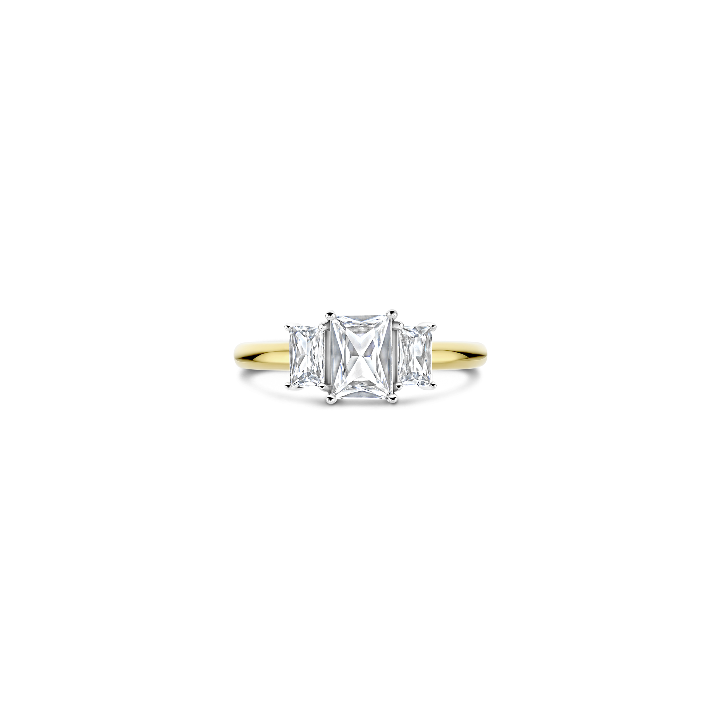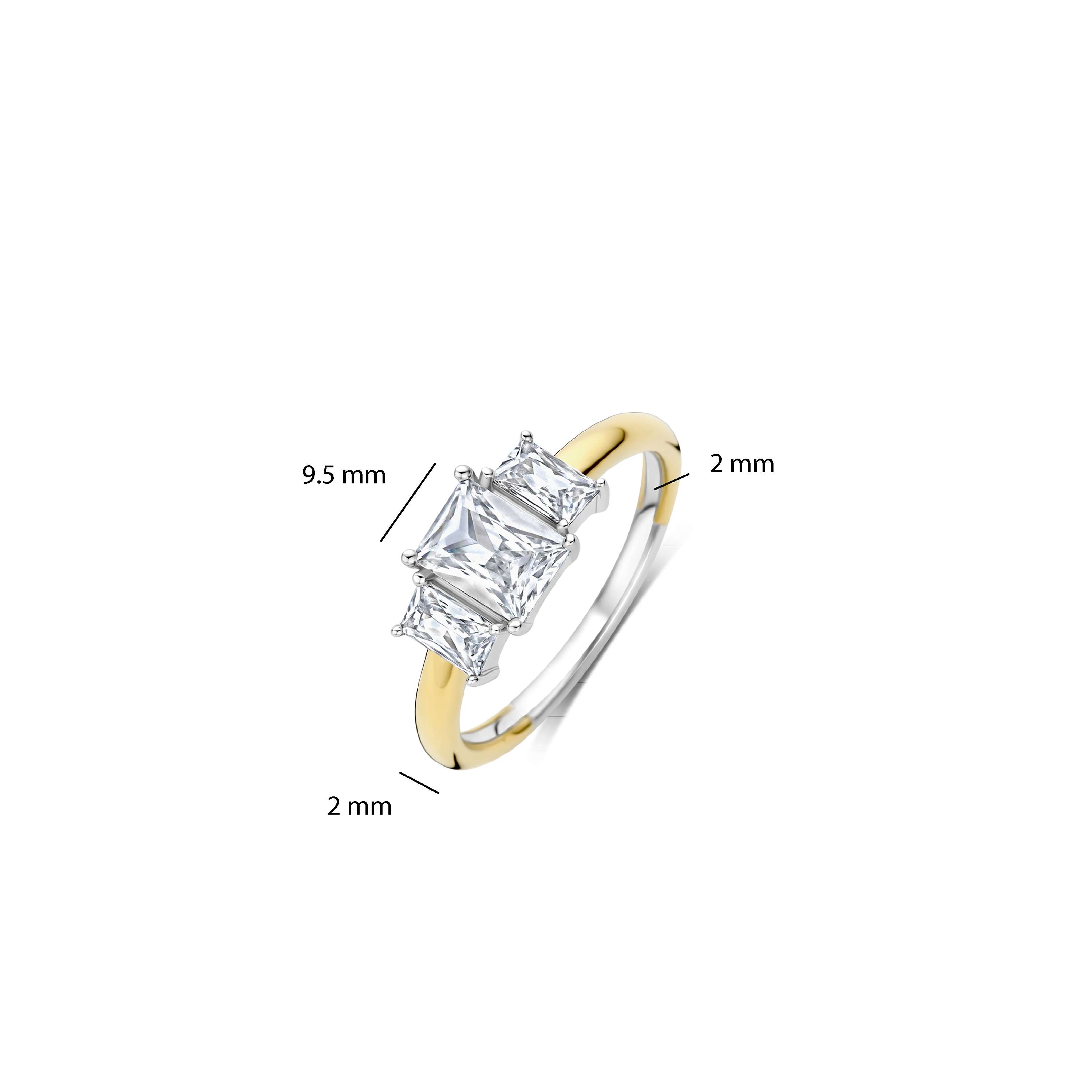 Deze TI SENTO – Milano ring uit de Cushion & Rectangular collectie is een verfijnde klassieker met een moderne uitstraling. Het ontwerp is vervaardigd uit 925 sterling zilver en afgewerkt met subtiele geelvergulde accenten die het geheel extra warmte geven. Drie helder geslepen zirkonia’s vormen samen het stralende middelpunt, waarbij de centrale steen een diameter heeft van 9,5 mm en elegant wordt geflankeerd door twee kleinere stenen. De slanke band van 2 mm zorgt voor een verfijnde, comfortabele pasvorm en laat de stenen optimaal tot hun recht komen. Een tijdloos model dat prachtig solo gedragen kan worden of gecombineerd met andere ringen voor een stijlvolle, gelaagde look.