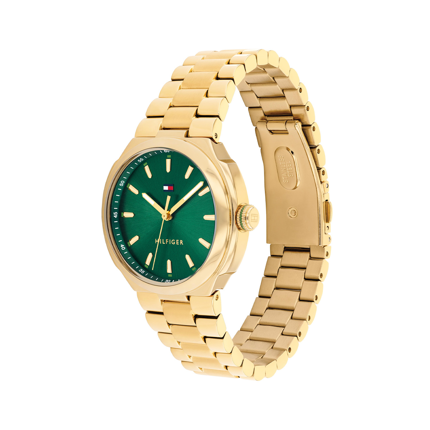 De Tommy Hilfiger Georgia is een elegant dameshorloge dat moderne klasse combineert met een frisse uitstraling. De ronde kast van 36 mm is vervaardigd uit goudkleurig roestvrij staal en voorzien van een glanzende bezel die het ontwerp een subtiel luxeaccent geeft. De groene sunray-wijzerplaat zorgt voor een opvallend en eigentijds karakter, terwijl de goudkleurige uurmarkeringen en het iconische Tommy Hilfiger-logo zorgen voor een stijlvolle finishing touch. De goudkleurige schakelband met vouwsluiting sluit comfortabel om de pols en maakt het horloge geschikt voor dagelijks gebruik. Dankzij het betrouwbare Quartz-uurwerk en het beschermende mineraalglas biedt de Georgia zowel precisie als duurzaamheid. Met een waterdichtheid van 3 ATM is dit horloge ideaal voor iedere gelegenheid. Een verfijnd ontwerp dat elegantie en moderne flair perfect in balans brengt.
