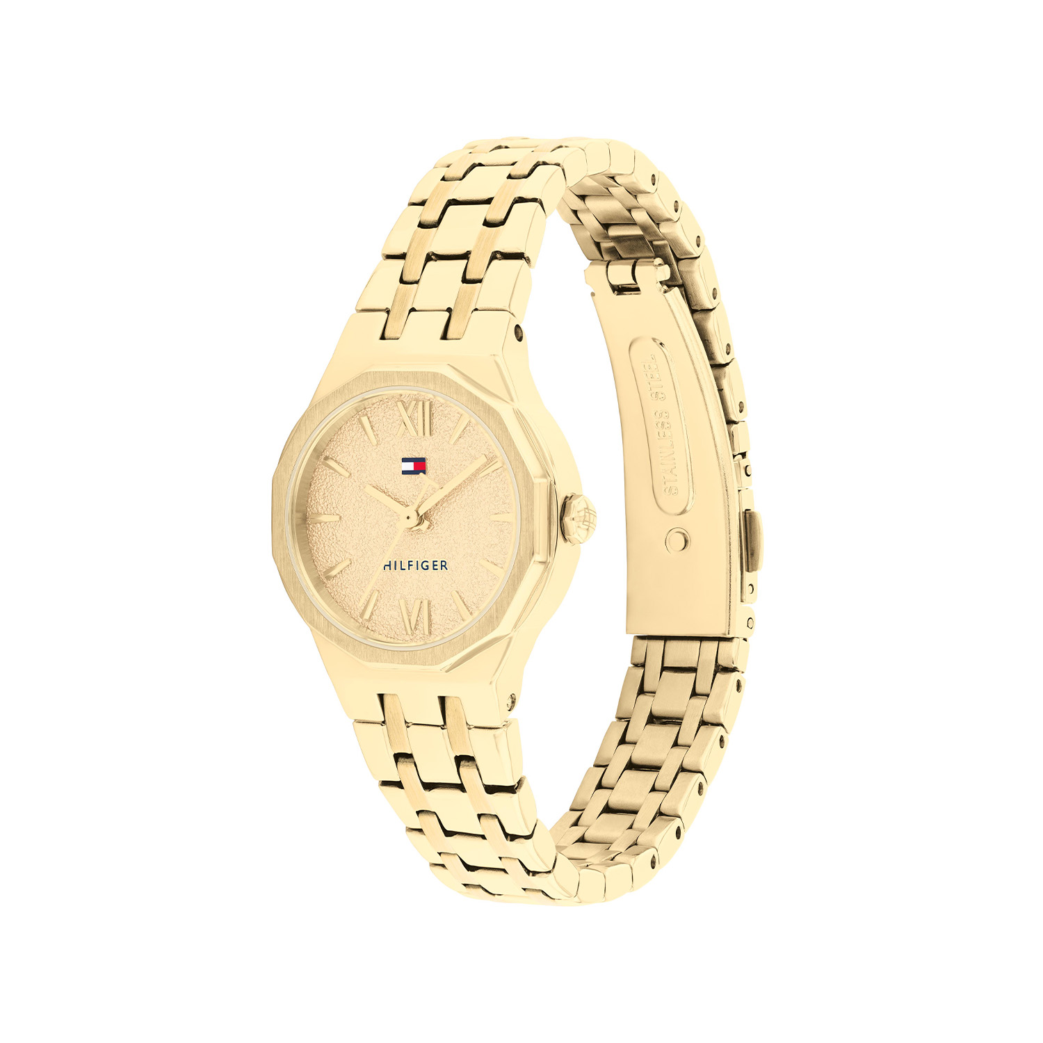 De Tommy Hilfiger Mackenzie is een elegant dameshorloge met een verfijnde en moderne uitstraling. De ronde kast van 25 mm is uitgevoerd in goudkleurig roestvrij staal en wordt geaccentueerd door een geometrische bezel die het ontwerp een stijlvolle en eigentijdse uitstraling geeft. De goudkleurige bewerkte wijzerplaat zorgt voor een subtiele glans en is afgewerkt met fijne wijzers, Romeinse cijfers en het kenmerkende Tommy Hilfiger-logo als herkenbaar detail. De goudkleurige stalen schakelband met vouwsluiting zorgt voor een comfortabele en veilige pasvorm. Het horloge is voorzien van mineraalglas en een betrouwbaar Quartz-uurwerk voor nauwkeurige tijdweergave. Met een waterdichtheid van 3 ATM is het geschikt voor dagelijks gebruik.