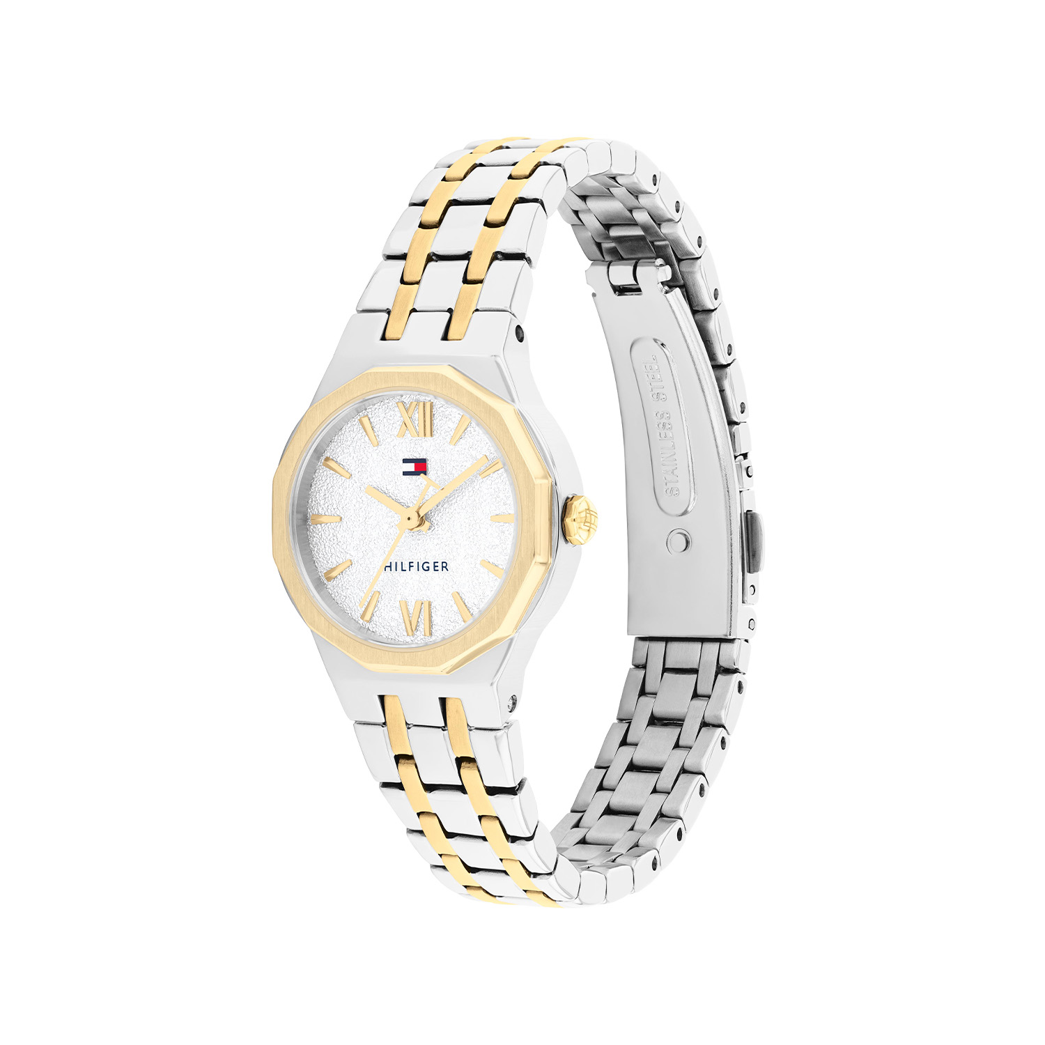 De Tommy Hilfiger Mackenzie is een elegant dameshorloge met een verfijnde en moderne uitstraling. De ronde kast van 25 mm is uitgevoerd in zilverkleurig roestvrij staal en wordt geaccentueerd door een goudkleurige geometrische bezel die het ontwerp een stijlvolle bicolor uitstraling geeft. De zilverkleurige bewerkte wijzerplaat zorgt voor een subtiele glans en is afgewerkt met goudkleurige wijzers, Romeinse cijfers en het kenmerkende Tommy Hilfiger-logo als herkenbaar detail. De bicolor stalen schakelband met vouwsluiting zorgt voor een comfortabele en veilige pasvorm. Het horloge is voorzien van mineraalglas en een betrouwbaar Quartz-uurwerk voor nauwkeurige tijdweergave. Met een waterdichtheid van 3 ATM is het geschikt voor dagelijks gebruik.