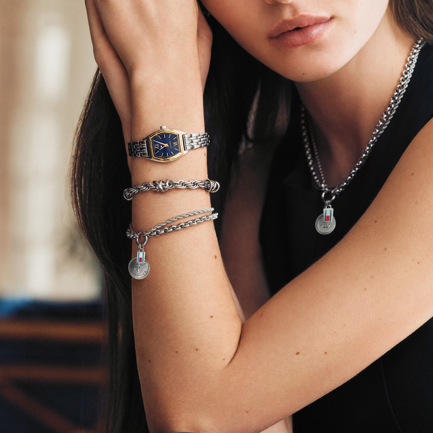 De Tommy Hilfiger Norah is een elegant dameshorloge met een verfijnde en stijlvolle uitstraling. De rechthoekige horlogekast van 21,5 x 22 mm is uitgevoerd in zilverkleurig roestvrij staal en wordt geaccentueerd door een goudkleurige bezel. De blauwe wijzerplaat met subtiele structuur is afgewerkt met goudkleurige wijzers, Romeinse cijfers en het kenmerkende Tommy Hilfiger-logo. De zilverkleurige stalen schakelband met vouwsluiting zorgt voor een comfortabele en veilige pasvorm. Het horloge is voorzien van mineraalglas en een betrouwbaar quartz uurwerk voor een nauwkeurige tijdweergave. Met een waterdichtheid van 3 ATM is het horloge geschikt voor dagelijks gebruik.