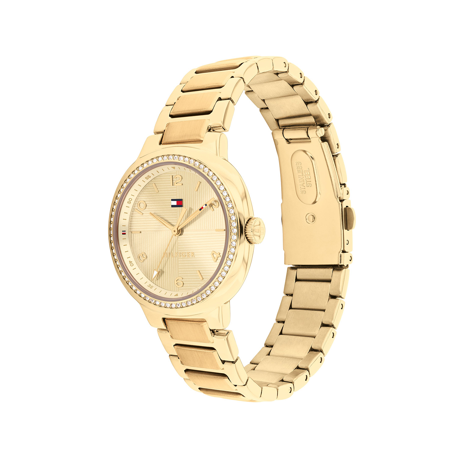 De Tommy Hilfiger Savannah is een elegant dameshorloge met een luxe en verzorgde uitstraling. De ronde kast van 32 mm is uitgevoerd in goudkleurig roestvrij staal en wordt rondom de bezel afgewerkt met kleine kristallen die het ontwerp een verfijnd detail geven. De goudkleurige wijzerplaat heeft een subtiele structuur en is voorzien van duidelijke uurmarkeringen, slanke wijzers en het herkenbare Tommy Hilfiger-logo. De goudkleurige stalen schakelband sluit mooi aan op de kast en is uitgerust met een praktische vouwsluiting voor een comfortabele pasvorm. Het horloge is voorzien van mineraalglas en een betrouwbaar quartz uurwerk voor een nauwkeurige tijdweergave. Met een waterdichtheid van 3 ATM is het geschikt voor dagelijks gebruik.