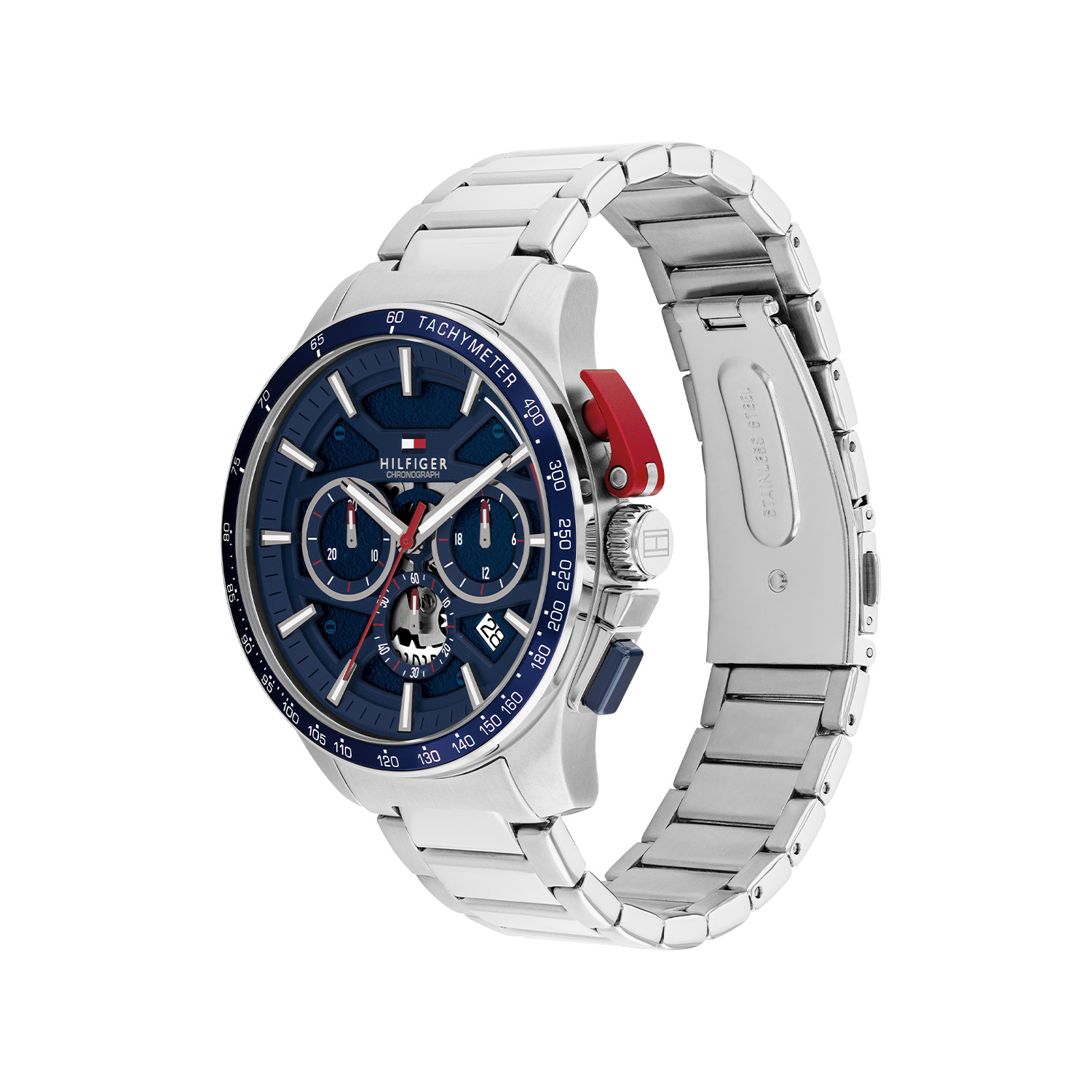 De Tommy Hilfiger Bank is een sportief herenhorloge met een krachtige en moderne uitstraling. De ronde kast van 44 mm is uitgevoerd in zilverkleurig roestvrij staal en wordt gecombineerd met een blauwe tachymeter bezel, waarmee snelheid of afstand op basis van tijd kan worden berekend. De blauwe wijzerplaat heeft een deels opengewerkt ontwerp en is voorzien van duidelijke uurmarkeringen, een datumweergave en een chronograaf voor het meten van tijdsintervallen. Opvallend detail is de rode aluminium drukknop die de chronograaffunctie bedient. De zilverkleurige stalen schakelband met vouwsluiting zorgt voor een stevige en comfortabele pasvorm. Het horloge is voorzien van mineraalglas en een betrouwbaar quartz uurwerk. Met een waterdichtheid van 5 ATM is het geschikt voor dagelijks gebruik.