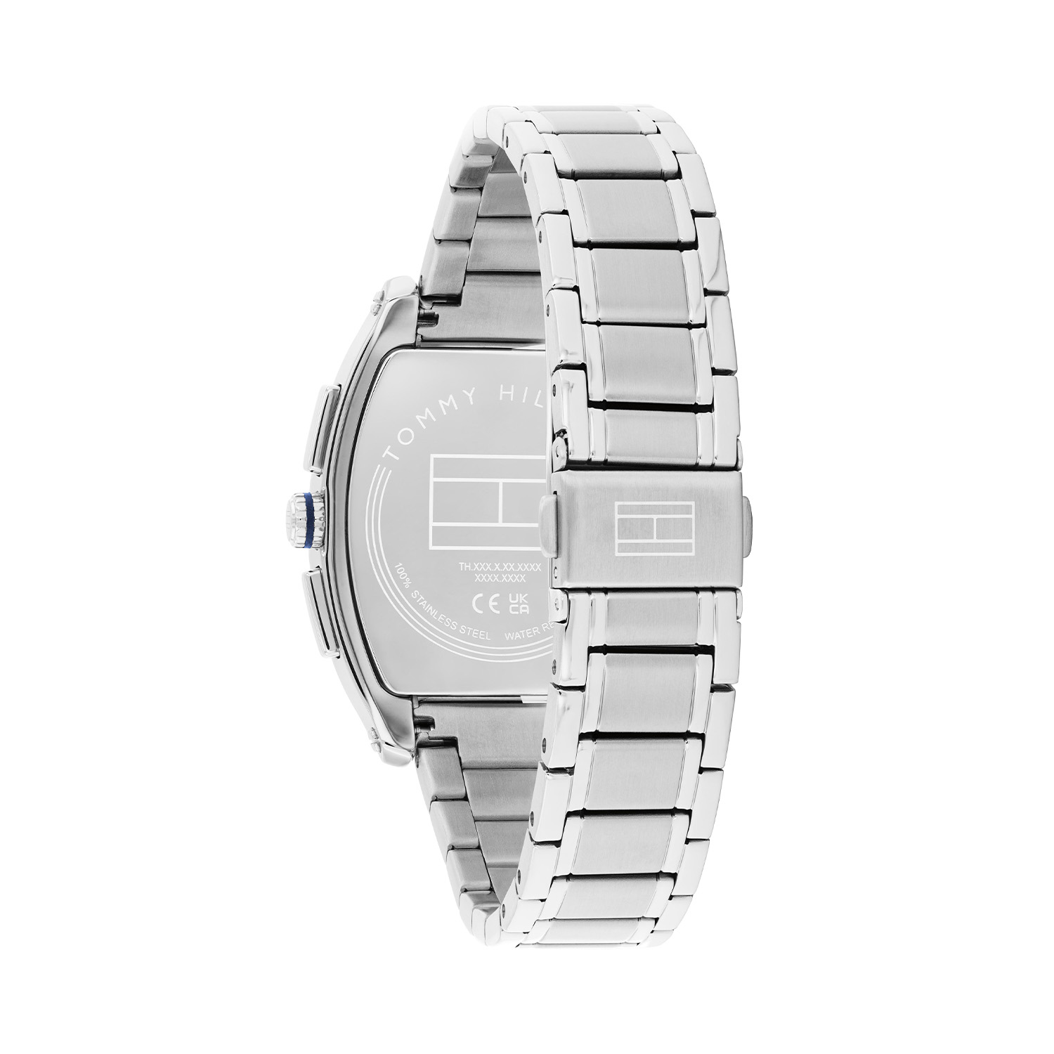 De Tommy Hilfiger TH Oxford is een modern herenhorloge met een stijlvolle en klassieke uitstraling. De rechthoekige kast van 36 mm is uitgevoerd in zilverkleurig roestvrij staal en geeft het horloge een strak en tijdloos karakter. De blauwe wijzerplaat met subtiele structuur is voorzien van Romeinse cijfers en meerdere subdials die de dag, datum en 24-uursaanduiding tonen. De zilverkleurige stalen schakelband sluit naadloos aan op de kast en is uitgerust met een vouwsluiting voor een stevige en comfortabele pasvorm. Het horloge is voorzien van mineraalglas en een betrouwbaar quartz uurwerk voor een nauwkeurige tijdweergave. Met een waterdichtheid van 3 ATM is het geschikt voor dagelijks gebruik.